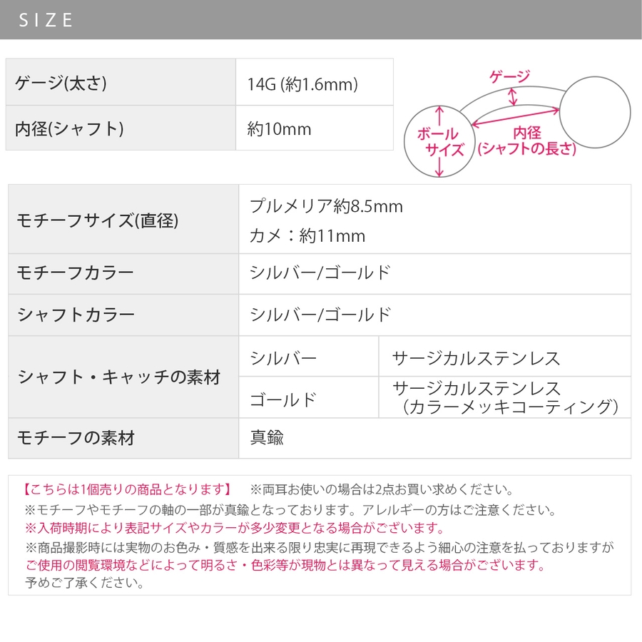 ※こちらの商品の一部カラーは、カラーのメッキコーティングを施しています。体質によって着けたままにされますと、メッキコーティングが剥がれる可能性がございます。