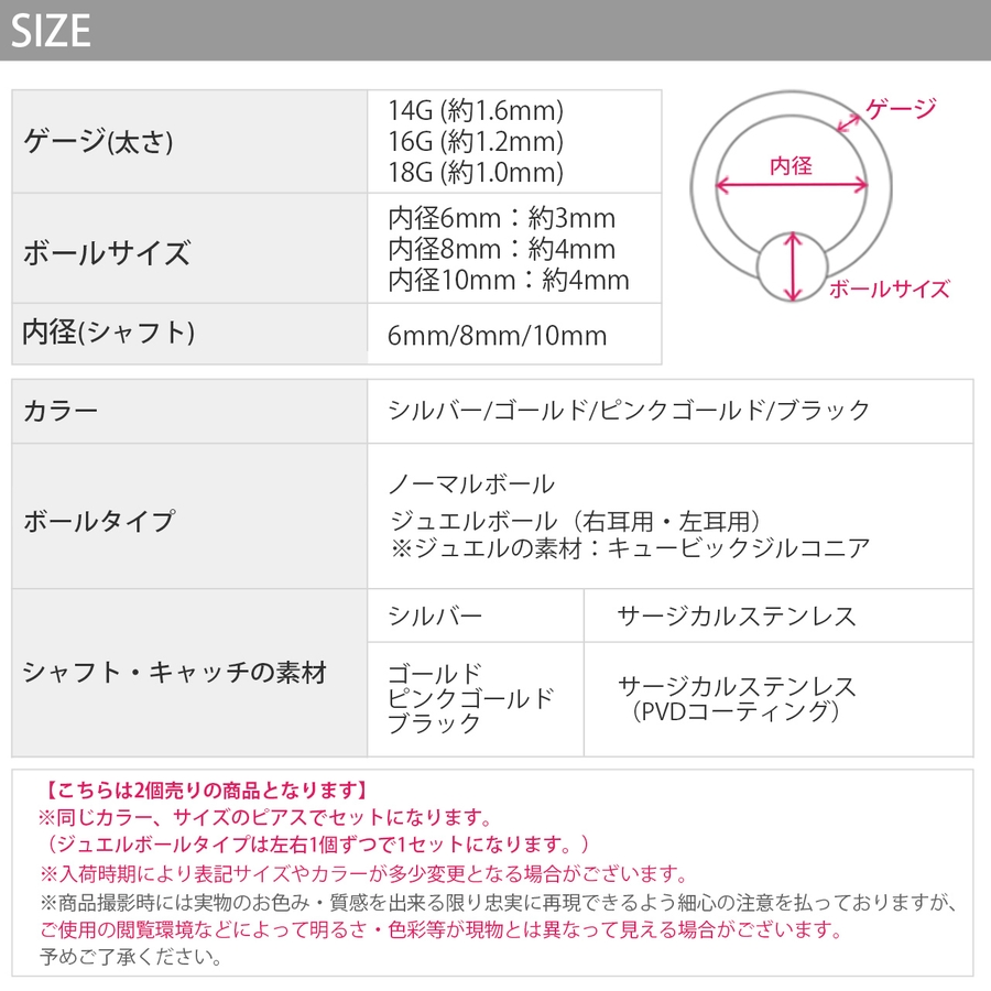 | カラー | ノーマルボール・シルバー / ノーマルボール・ゴールド / ノーマルボール・ピンクゴールド / ノーマルボール・ブラック / ジュエルボール・シルバー / ジュエルボール・ゴールド / ジュエルボール・ピンクゴールド / ジュエルボール・ブラック |