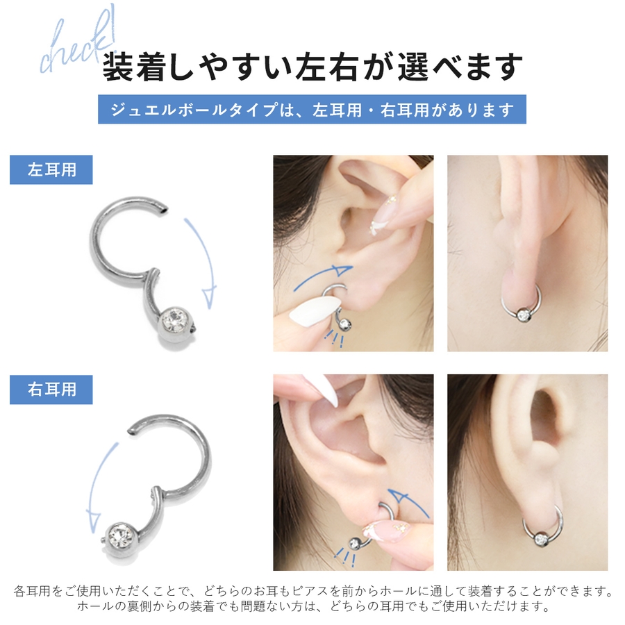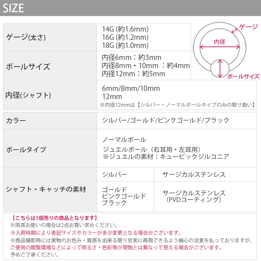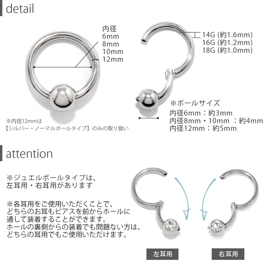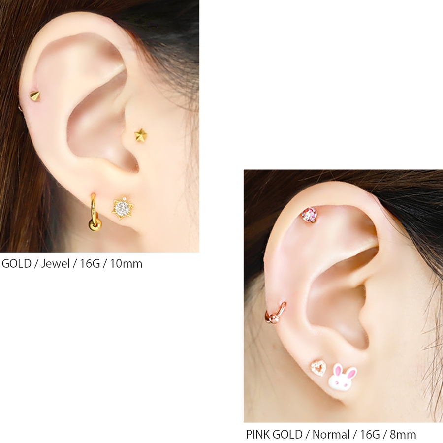 | カラー | ノーマルボール・シルバー / ノーマルボール・ゴールド / ノーマルボール・ピンクゴールド / ジュエル・シルバー(左耳) / ジュエル・ゴールド(左耳) / ジュエル・ピンクゴールド(左耳) / ジュエル・シルバー(右耳) / ジュエル・ゴールド(右耳) / ジュエル・ピンクゴールド(右耳) / ノーマルボール・ブラック / ジュエル・ブラック(左耳) / ジュエル・ブラック(右耳) |