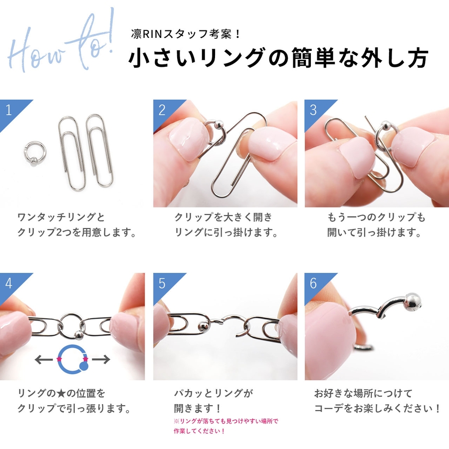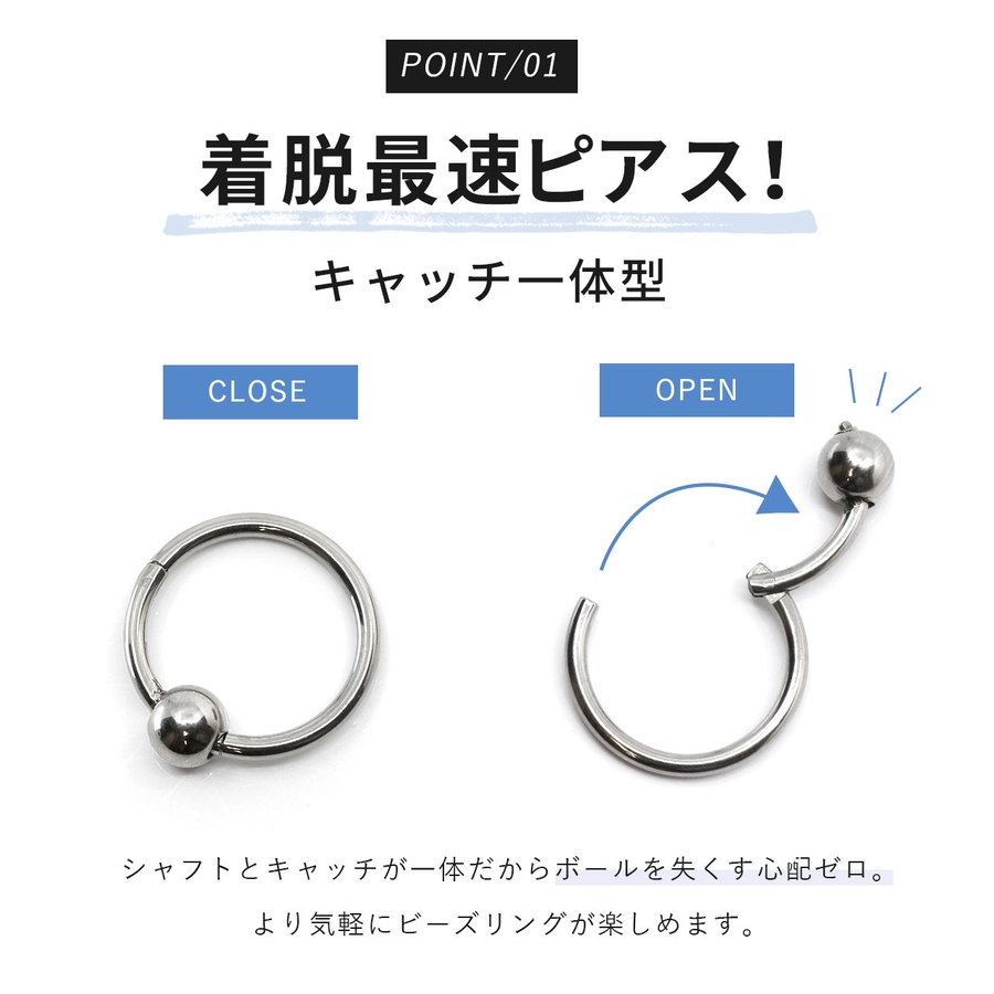 当店のワンタッチビーズリングは簡単に着脱でき、さらにサージカルステンレス製なので金属アレルギー対応でファーストピアスにもぴったり!