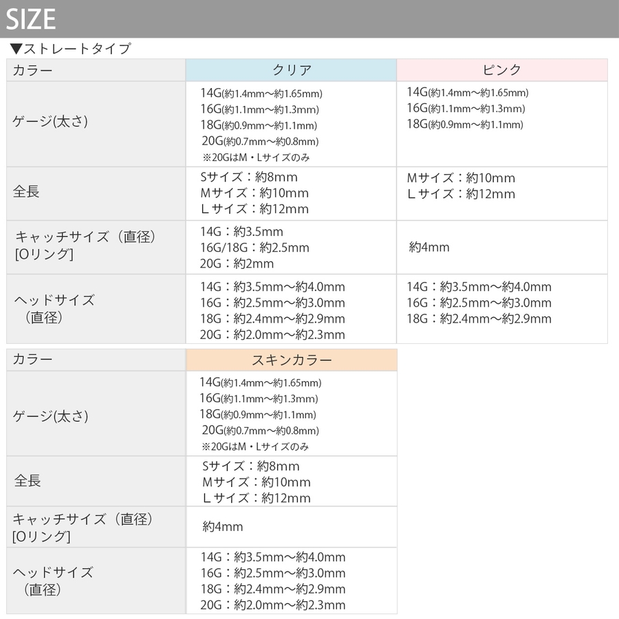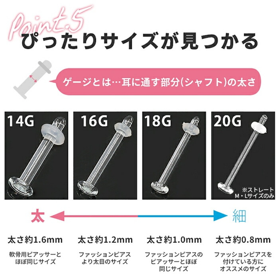 ただ、小さくてよく失くしちゃうので定期的に購入してます。さん (20代 / 女性 )購入アイテム:形状・サイズ・カラー ストレート・Mサイズ・クリアゲージ 18G - セット