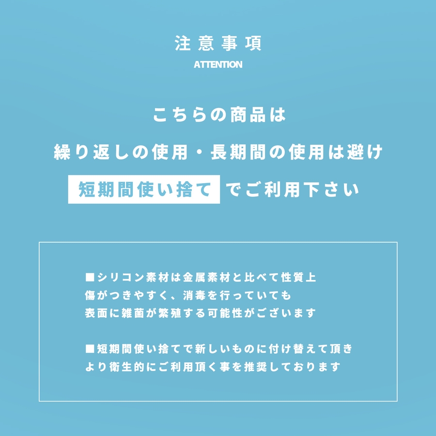■シリコン素材は金属素材と比べて性質上傷がつきやすく、消毒を行っていても 表面に雑菌が繁殖する可能性がございます。