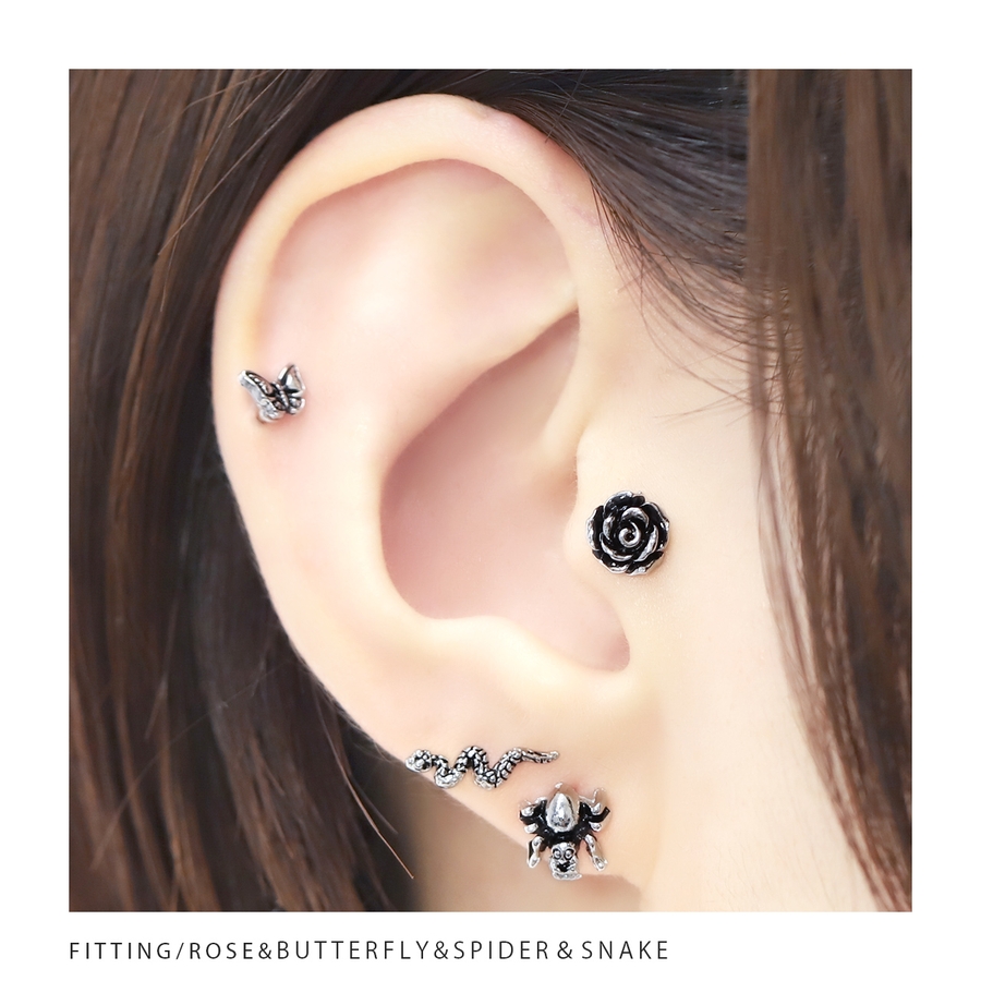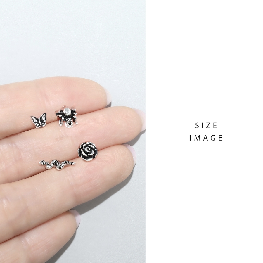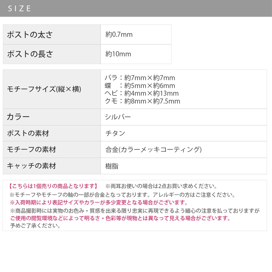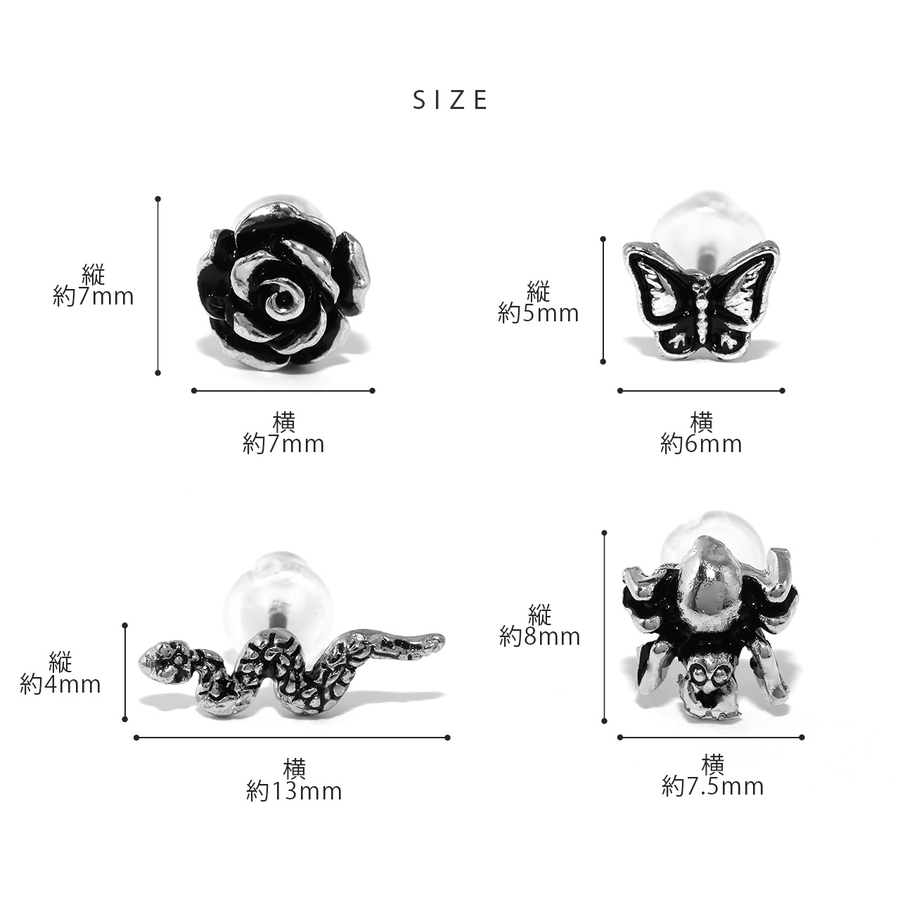 バラ:約7mm×約7mm 蝶:約5mm×約6mm ヘビ:約4mm×約13mm クモ:約8mm×約7.5mm
