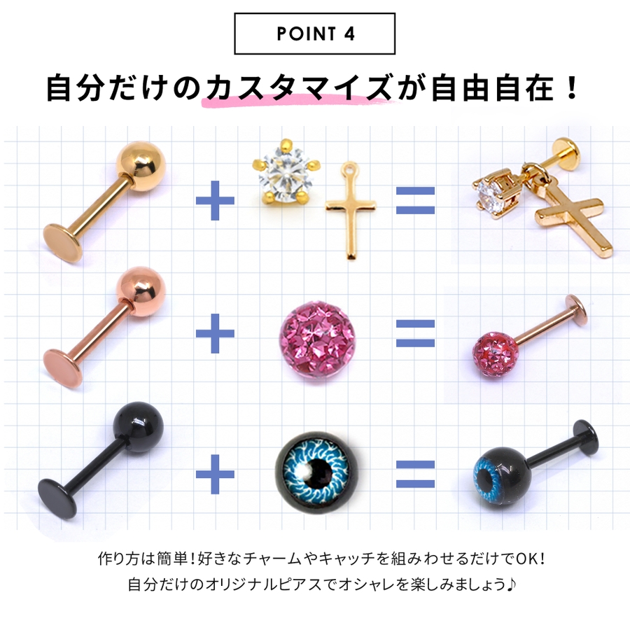 ラブレットは片面が平らになっているので軟骨ピアスに人気のトラガスや口ピアスにもよく使用され、レディース、メンズ問わず使いやすいピアスです。