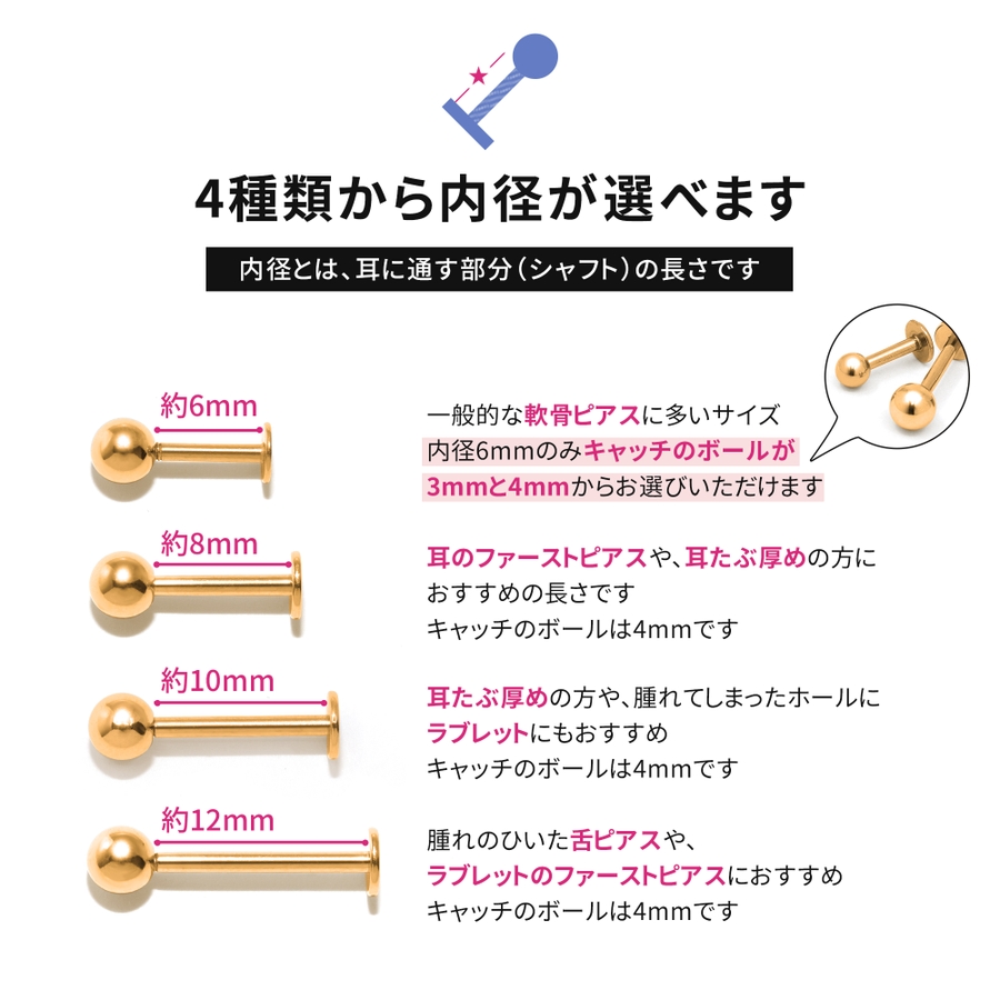 | ゲージ/カラー | 14G・ゴールド / 16G・ゴールド / 18G・ゴールド / 14G・ピンクゴールド / 16G・ピンクゴールド / 18G・ピンクゴールド / 14G・ブラック / 16G・ブラック / 18G・ブラック |