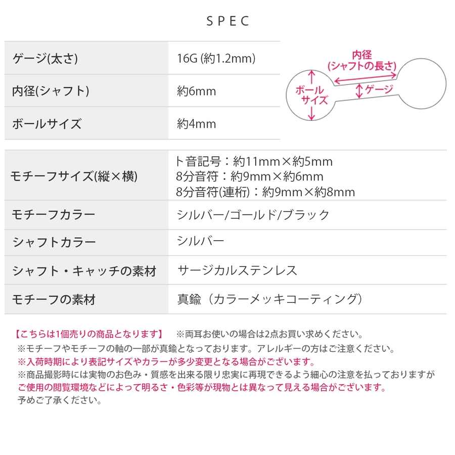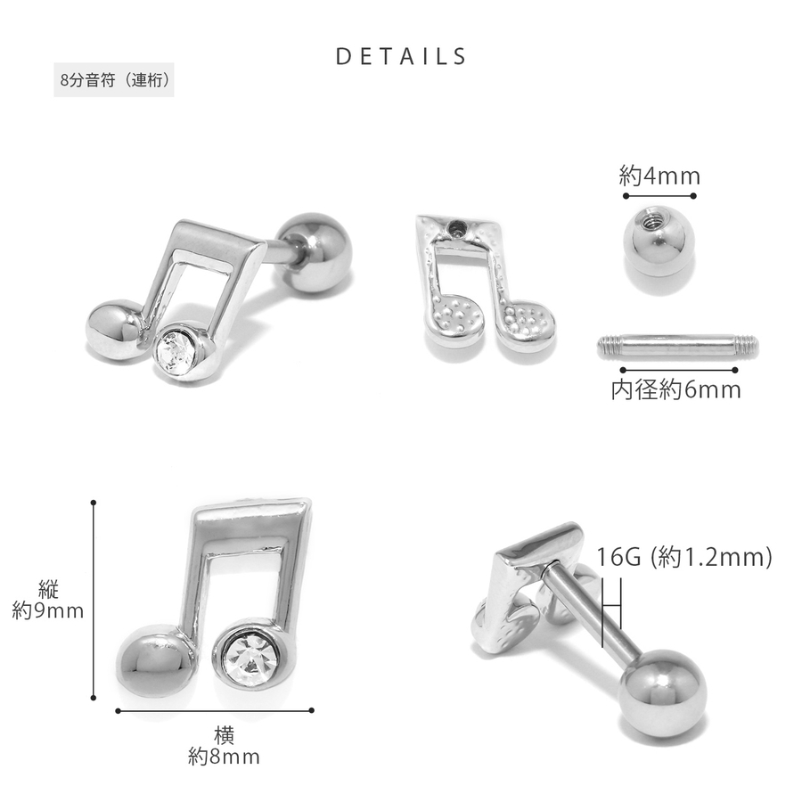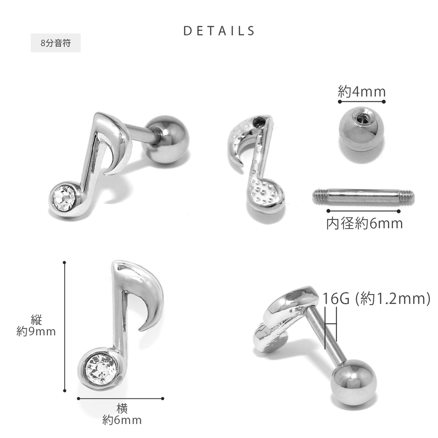 | タイプ・カラー | ト音記号・シルバー / ト音記号・ゴールド / ト音記号・ブラック / 8分音符・シルバー / 8分音符・ゴールド / 8分音符・ブラック / 8分音符(連桁)・シルバー / 8分音符(連桁)・ゴールド / 8分音符(連桁)・ブラック |