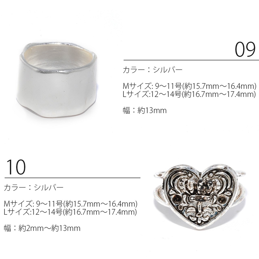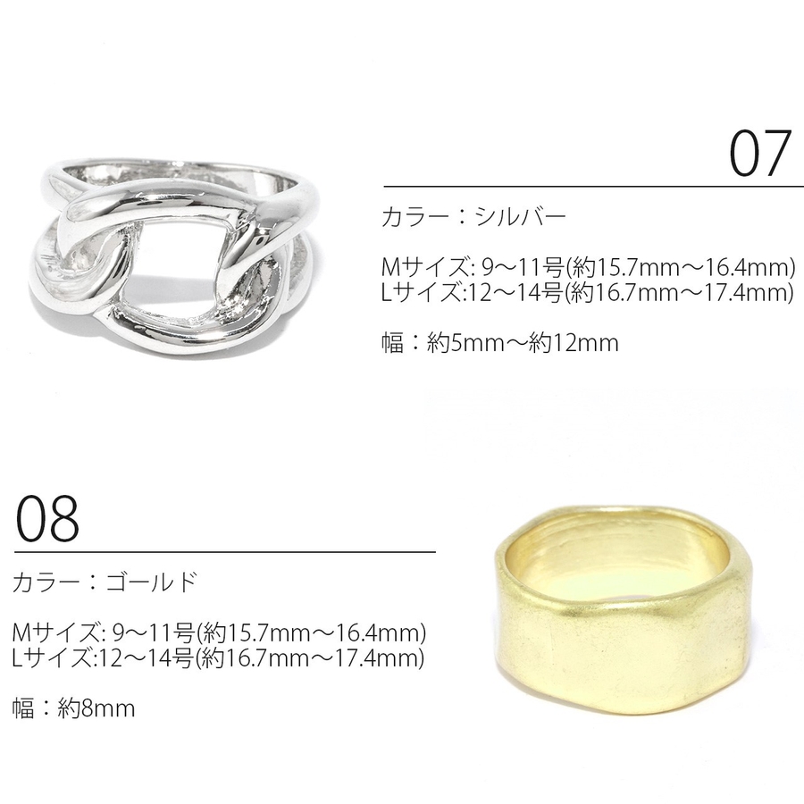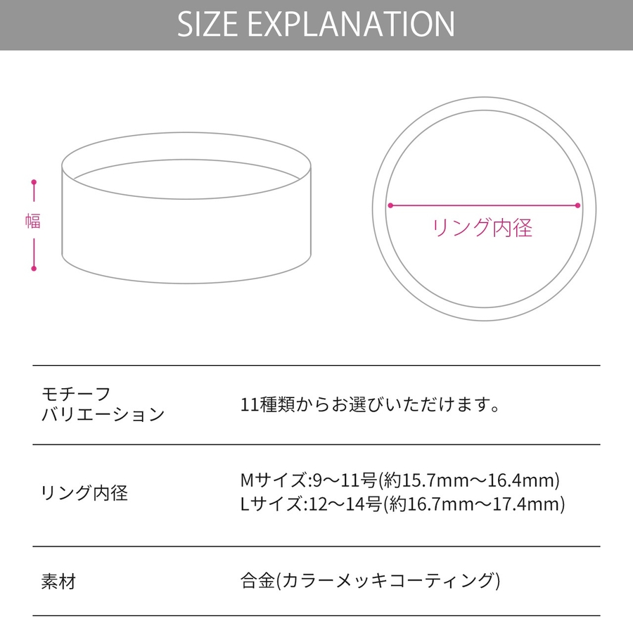 Mサイズ:9号~11号(約15.7mm~16.4mm) Lサイズ:12号~14号(約16.7mm~17.4mm)