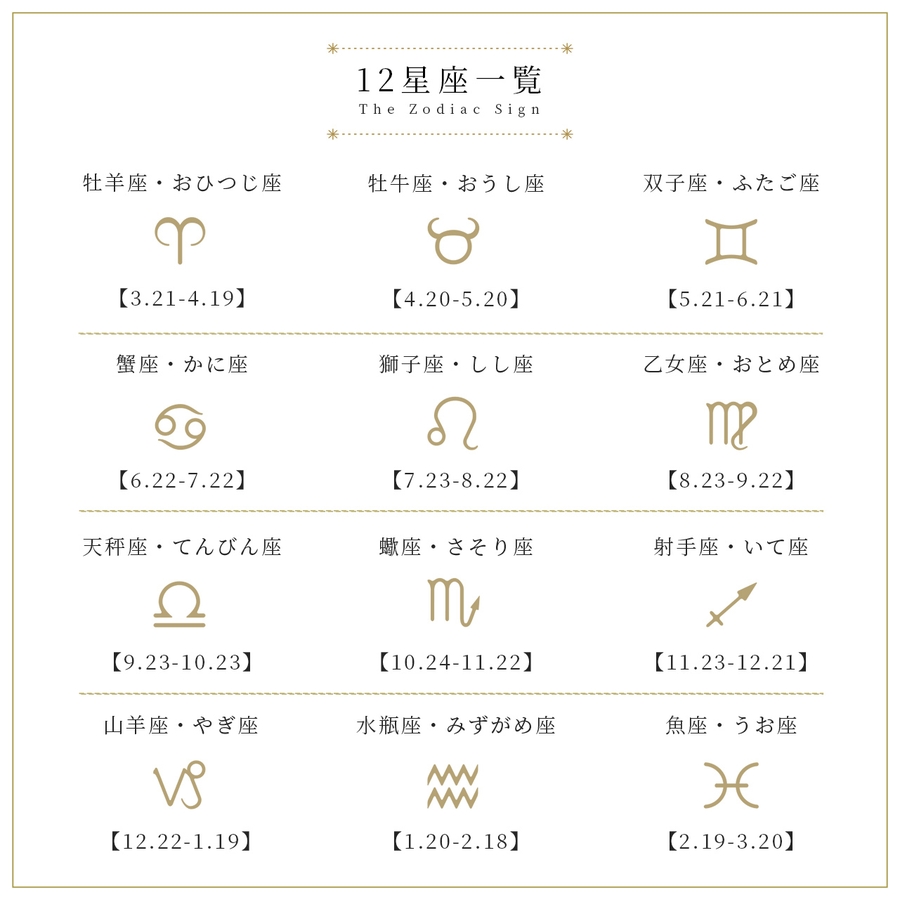 牡羊座・おひつじ座,牡牛座・おうし座,双子座・ふたご座,蟹座・かに座,獅子座・しし座,乙女座・おとめ座,天秤座・てんびん座,蠍座・さそり座,射手座・いて座,山羊座・やぎ座,水瓶座・みずがめ座,魚座・うお座