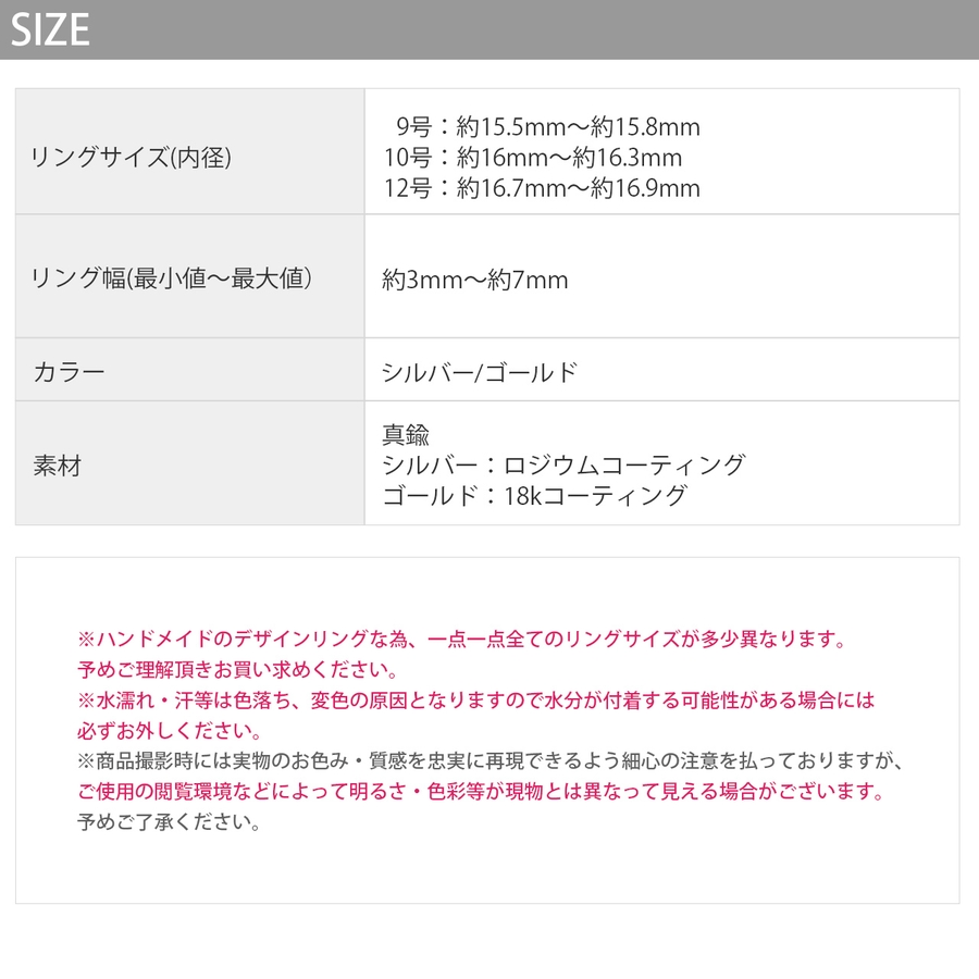 ※ハンドメイドのデザインリングな為、一点一点全てのリングサイズが多少異なりますので予めご理解頂きお買い求めください。