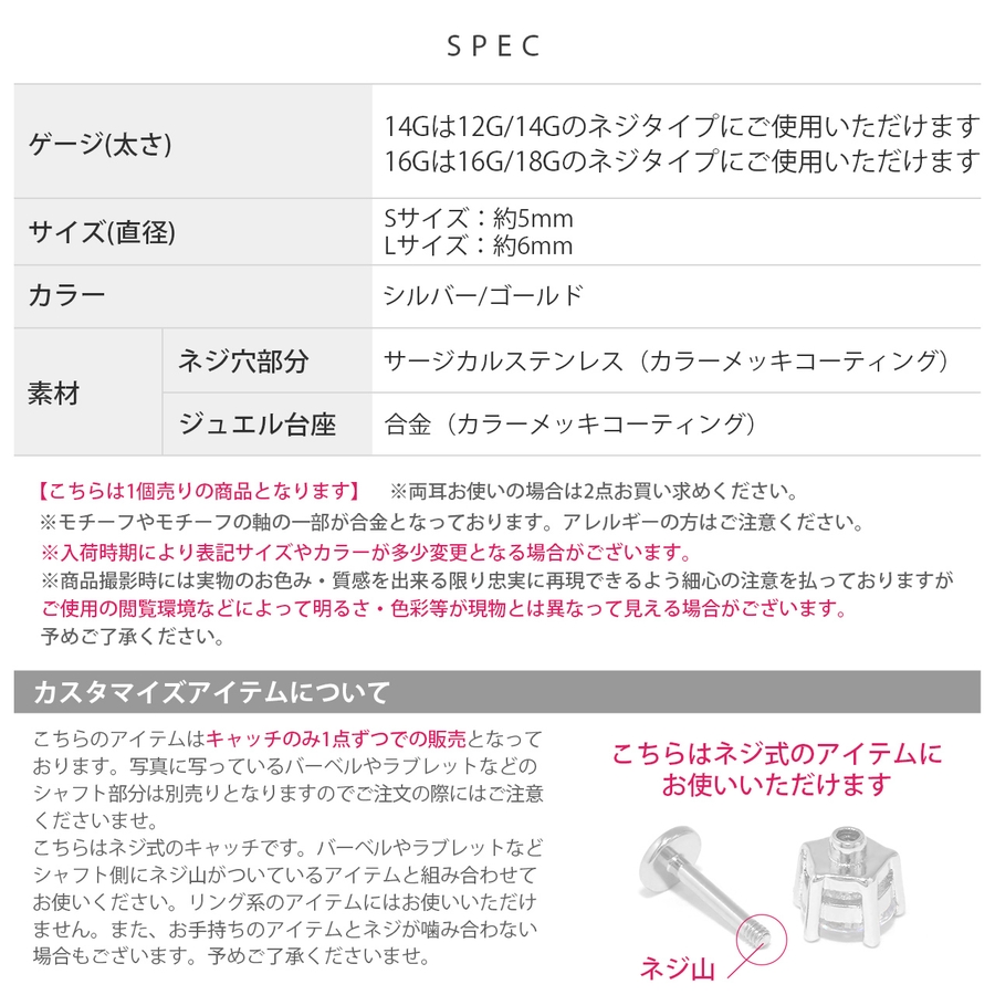 元々所有しているピアスをカスタムするために購入しました。別メーカーの14Gのピアスでしたが、サイズは問題なくピッタリ合いました。キャッチが変わるだけで華や雰囲気になりました(*^^*)
