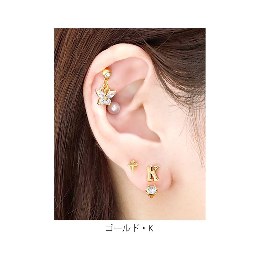 コチラのアイテムは小さいので、左右1つづつ付けるのではなく、片耳に並べて付けててもMy initialだ って分かってもらえそうだし可愛い