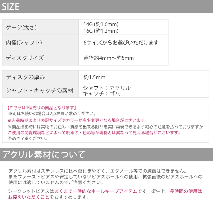 アクリル素材はステンレスに比べて傷付きやすく、 エタノール等での減菌はできません。 またファーストピアスや安定していないピアスホールへの使用、 拡張直後のピアスホールへの 使用には適していませんのでご注意下さい。