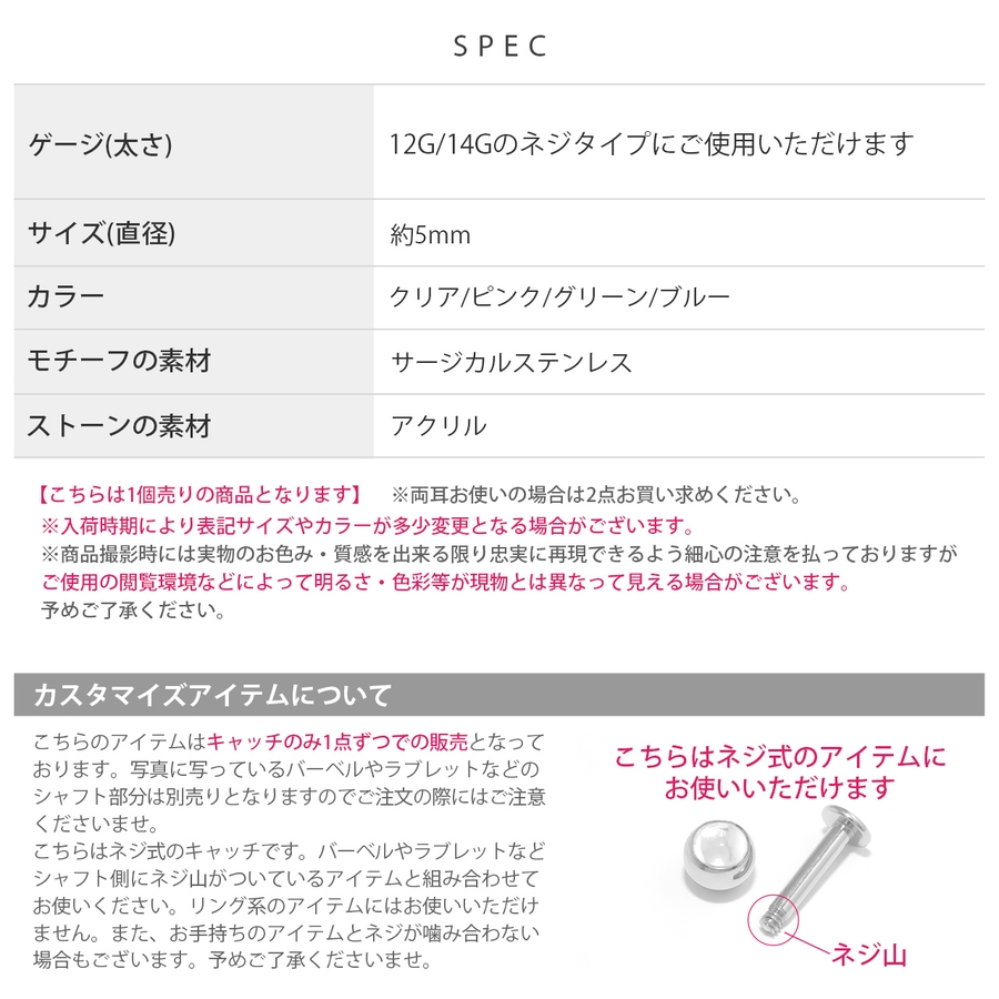 軟骨ピアス 14G キャッチ 12G ジュエル シルバー カラー キャッチ ボディーピアス 軟骨 ピアス グリーン ブルー クリア くりあ ピンク ぴんく パ^プル かわいい 可愛い カワイイ ラブリー 14ゲージ 12ゲージ つけっぱなし ピアス ボール ネジ式 カスタマイズ カスタム パーツ 耳 耳たぶ 軟骨用 なんこつ ピアス レディース メンズ ユニセックス 男女兼用 金属 アレルギー 対応 アクセサリー おすすめ ポイント消化 凛 ボディピアス専門店 りん カスタマイズ0084「BP」「CUS」