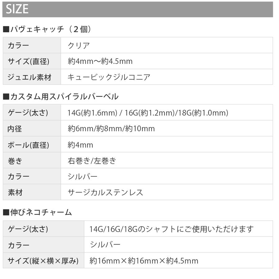 | ゲージ・内径・巻き | 14G・内径6mm・右巻き / 14G・内径8mm・右巻き / 14G・内径10mm・右巻き / 14G・内径6mm・左巻き / 14G・内径8mm・左巻き / 14G・内径10mm・左巻き / 16G・内径6mm・右巻き / 16G・内径8mm・右巻き / 16G・内径10mm・右巻き / 16G・内径6mm・左巻き / 16G・内径8mm・左巻き / 16G・内径10mm・左巻き / 18G・内径6mm・右巻き / 18G・内径8mm・右巻き / 18G・内径10mm・右巻き / 18G・内径6mm・左巻き / 18G・内径8mm・左巻き / 18G・内径10mm・左巻き |