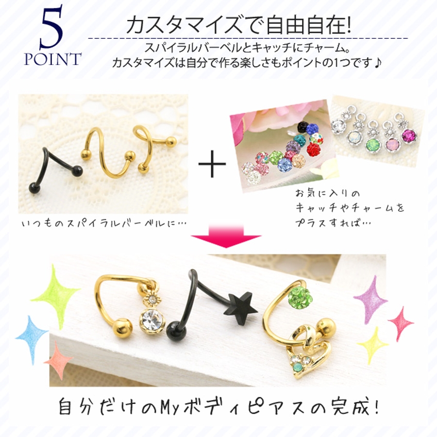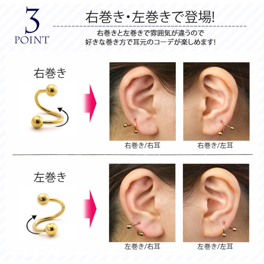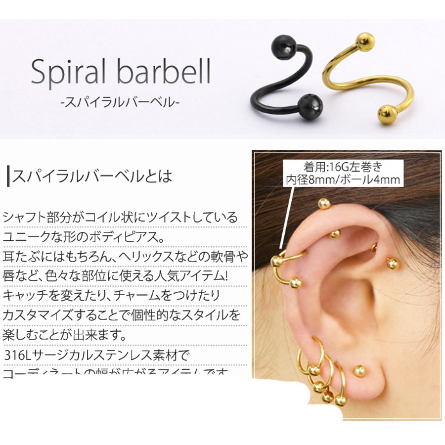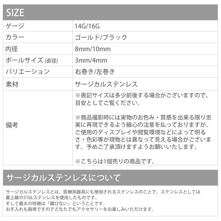 | ゲージ/カラー/巻き | 14G・ゴールド・右巻き / 14G・ゴールド・左巻き / 16G・ゴールド・右巻き / 16G・ゴールド・左巻き / 14G・ブラック・右巻き / 14G・ブラック・左巻き / 16G・ブラック・右巻き / 16G・ブラック・左巻き |