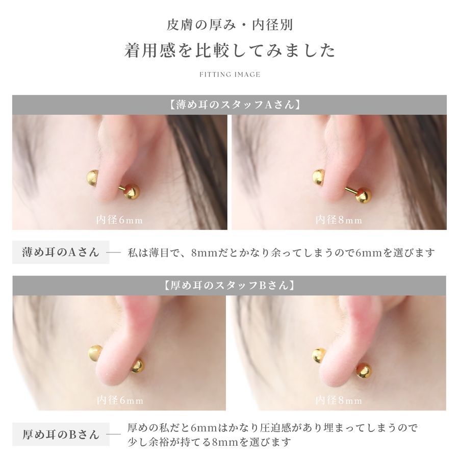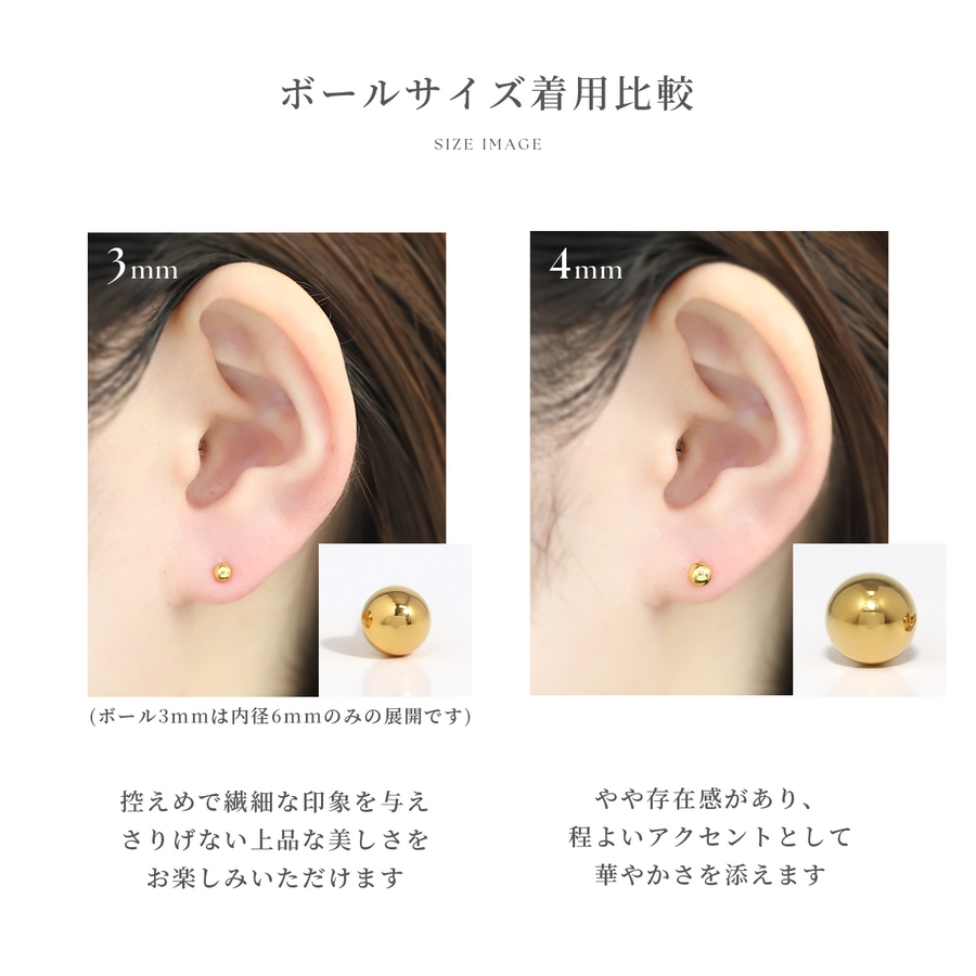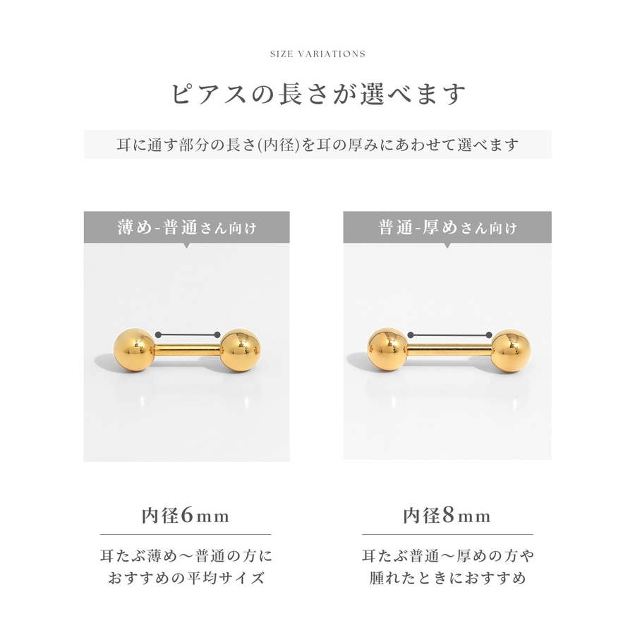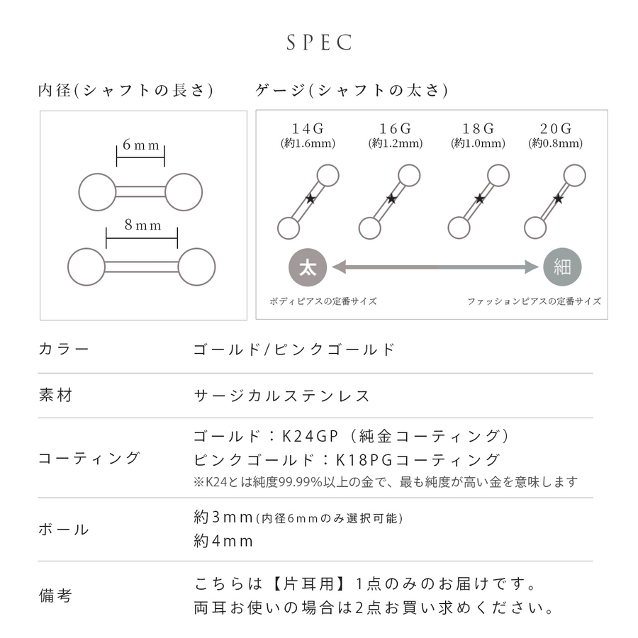ゲージ・内径×ボールサイズ | 14G・6mm×4mm / 14G・8mm×4mm / 16G・6mm×4mm / 16G・8mm×4mm / 18G・6mm×4mm / 18G・8mm×4mm / 20G・6mm×3mm / 20G・8mm×4mm / 14G・6mm×3mm / 16G・6mm×3mm / 18G・6mm×3mm |