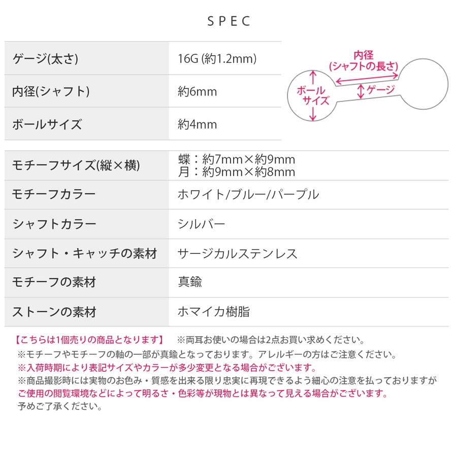 | モチーフ・カラー | 蝶・ホワイト / 蝶・ブルー / 蝶・パープル / 月・ホワイト / 月・ブルー / 月・パープル |