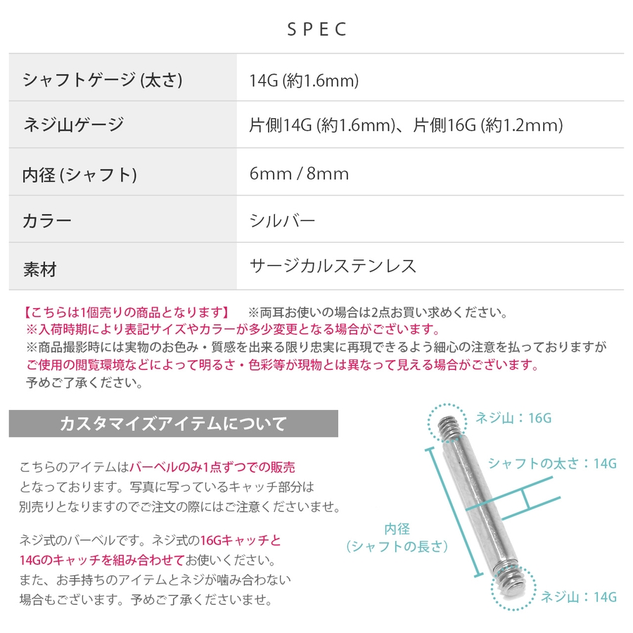 軟骨ピアス マジックシャフトパーツネジ山 16Gのキャッチがつけられる14Gシャ…