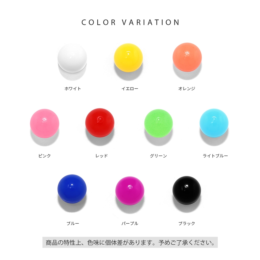 | カラー | ホワイト / イエロー / オレンジ / ピンク / レッド / グリーン / ライトブルー / ブルー / パープル / ブラック |