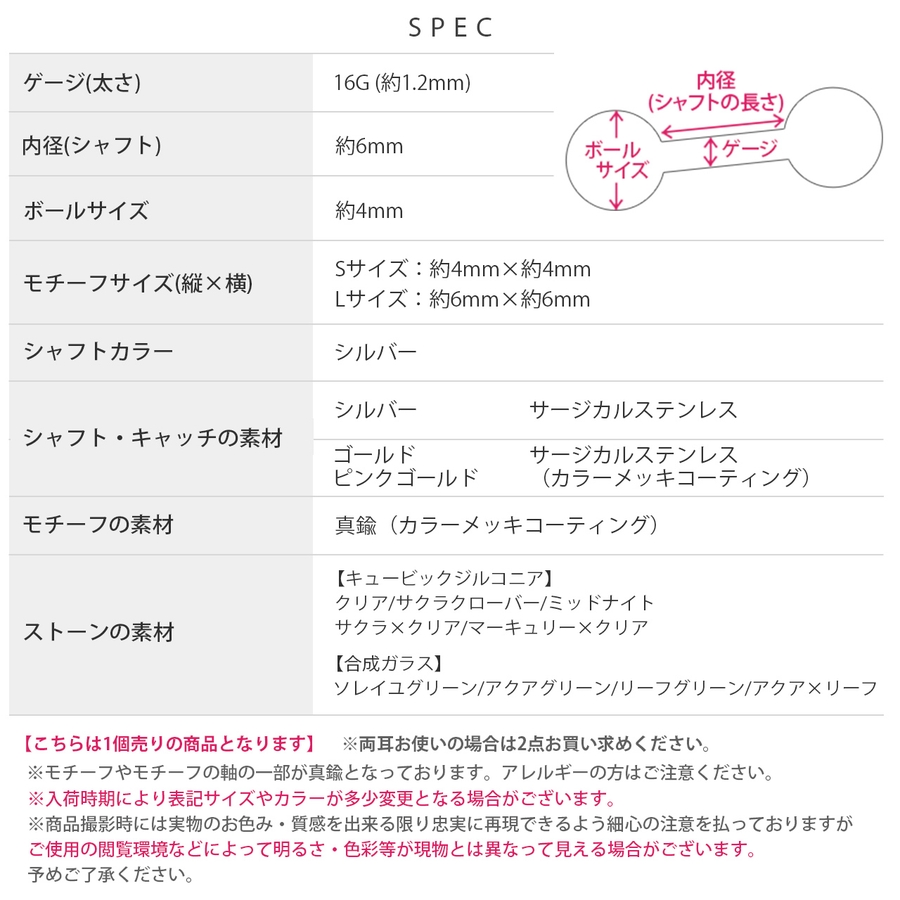 | ベースカラー・サイズ | シルバー・Sサイズ / シルバー・Lサイズ / ゴールド・Sサイズ / ゴールド・Lサイズ / ピンクゴールド・Sサイズ / ピンクゴールド・Lサイズ |