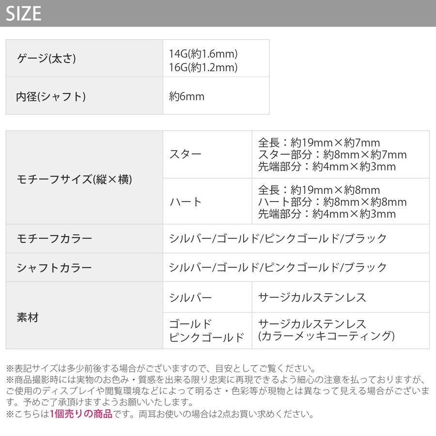 | カラー | スター・シルバー / スター・ゴールド / スター・ピンクゴールド / スター・ブラック / ハート・シルバー / ハート・ゴールド / ハート・ピンクゴールド / ハート・ブラック |