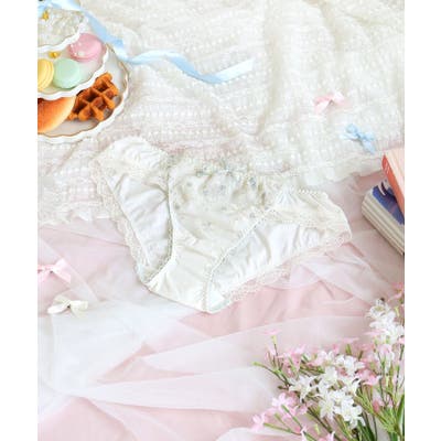 小花とアイシングクッキーの刺繍をミックスした、甘く可愛らしいシリーズです。アイシングクッキーの中にも小花柄をしのばせて、全体にやさしくきらめくラメ糸をあしらうことで、ガーリーな中にも上品さを演出。丸みのあるスカラップはボーラー手法をほどこし、手作りクッキーのようなイメージに仕上がりました。フロント中央には細めのリボンをあしらい、繊細な女の子らしい印象でまとめています。クッキー型のアップリケには輝くラインストーンを添えて、華やかさをプラスしました。お菓子のようなカラーリングのランジェリーで、甘くときめく日常をお届けします。