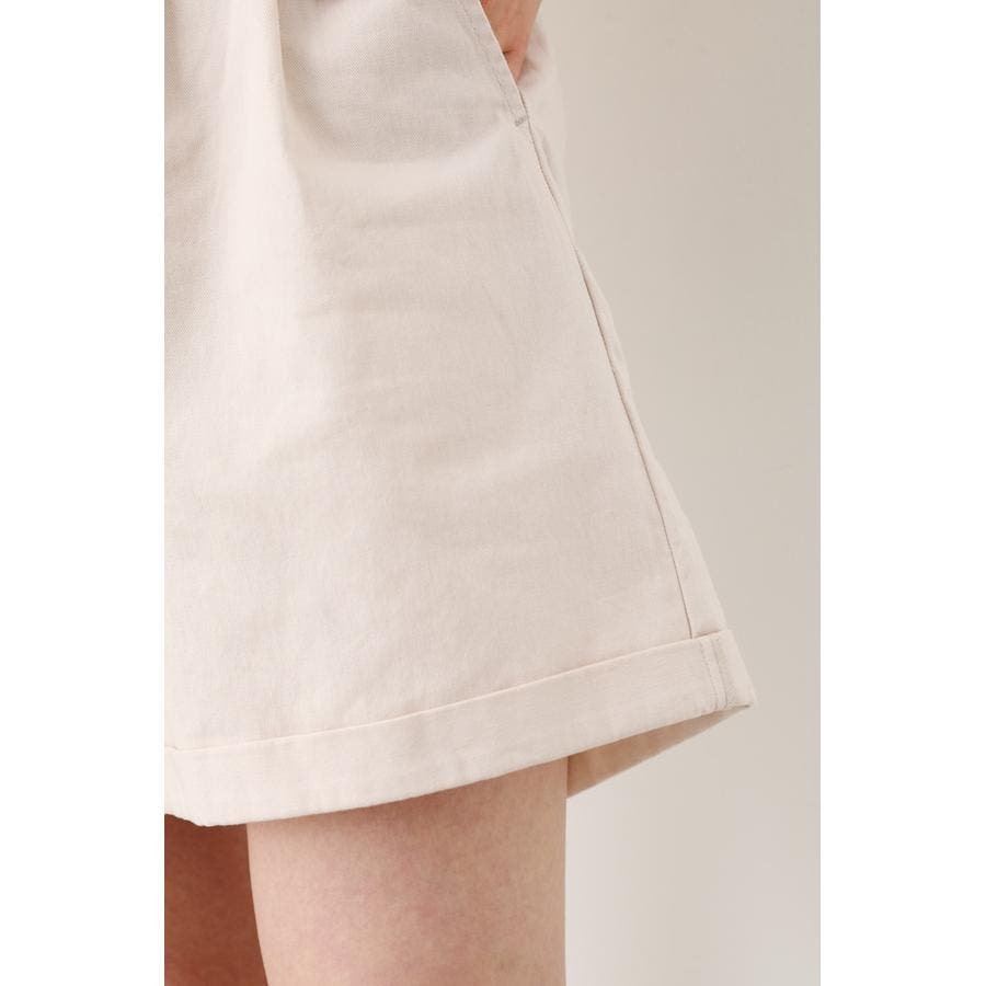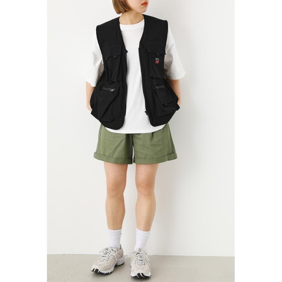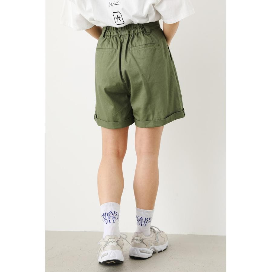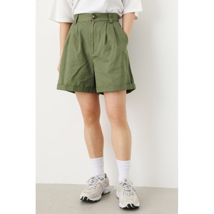 綿ツイルのサファリショートパンツ。裾をターンバックしてカジュアルに履くのがオススメです。程よいサイズ感で長めのトップスとのコーデが◎