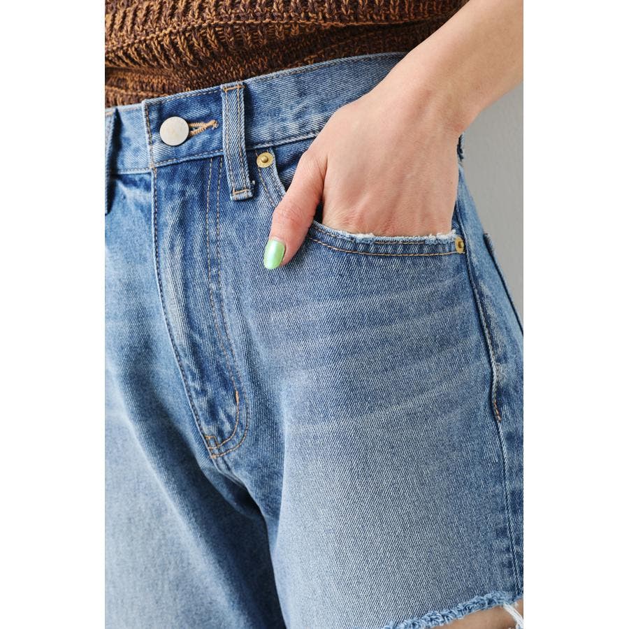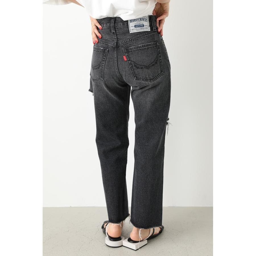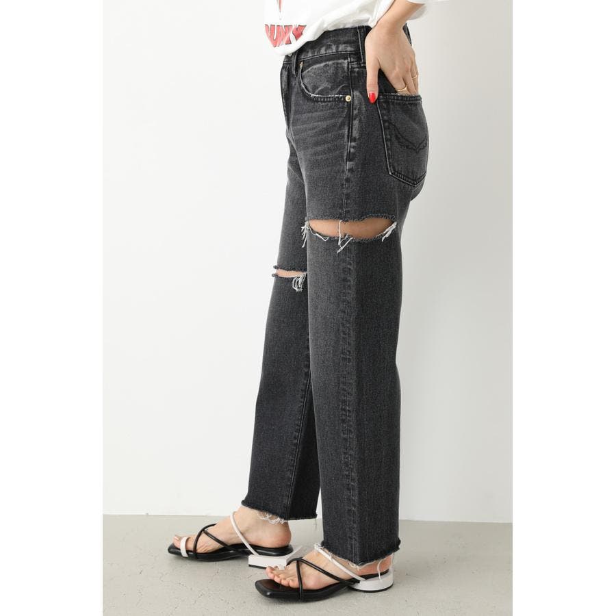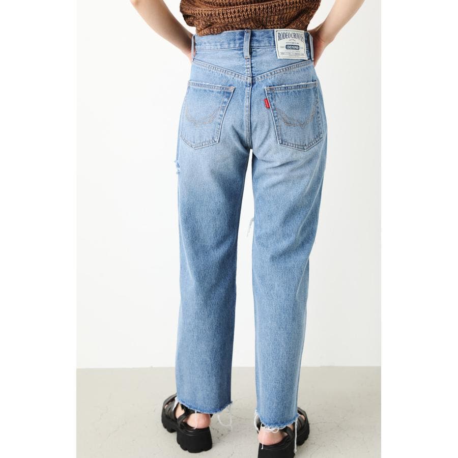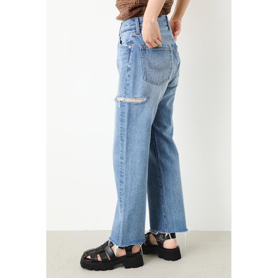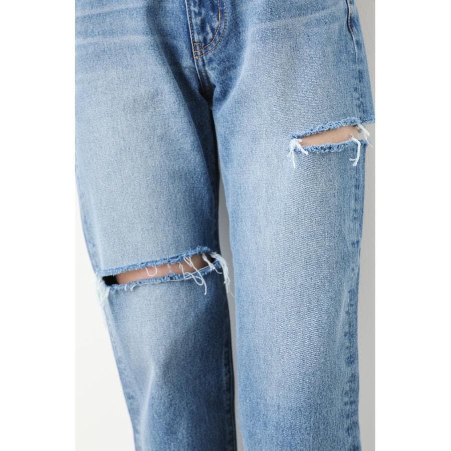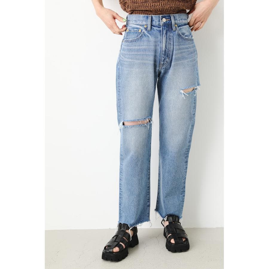 ルーズなサイズ感で、90’sライクに仕上げたストレートデニム。ヘルシーな肌見せにこだわったダメージをアシンメトリーのデザインに落とし込んだ一本です。
