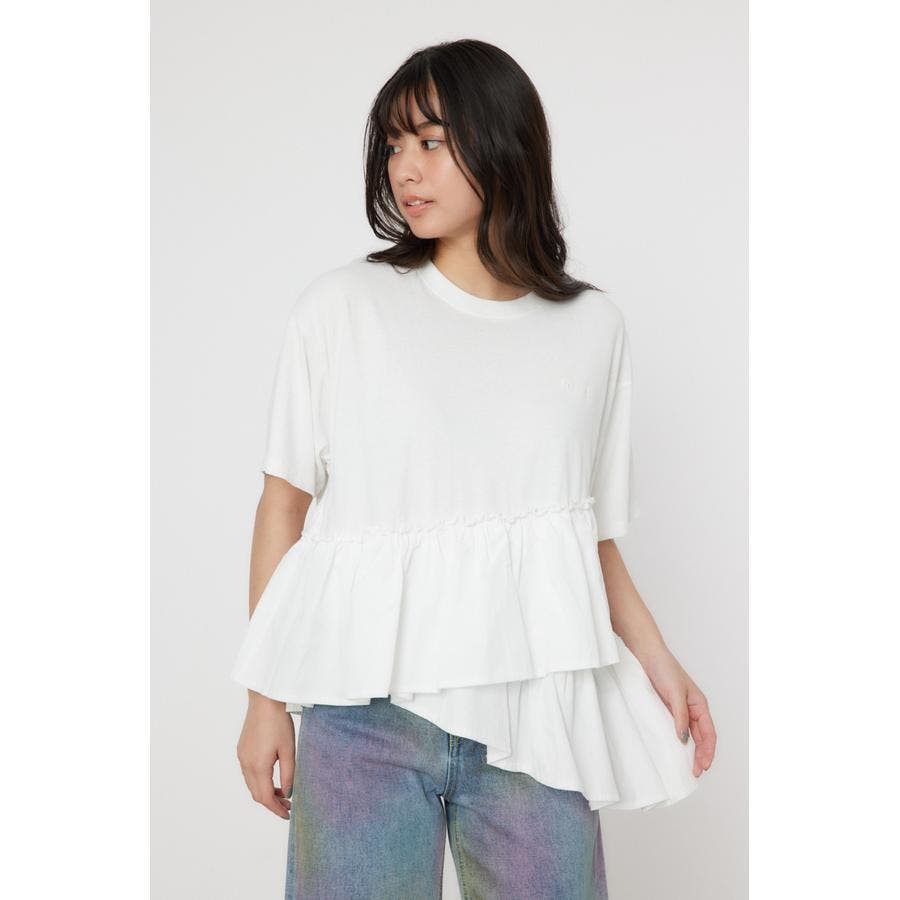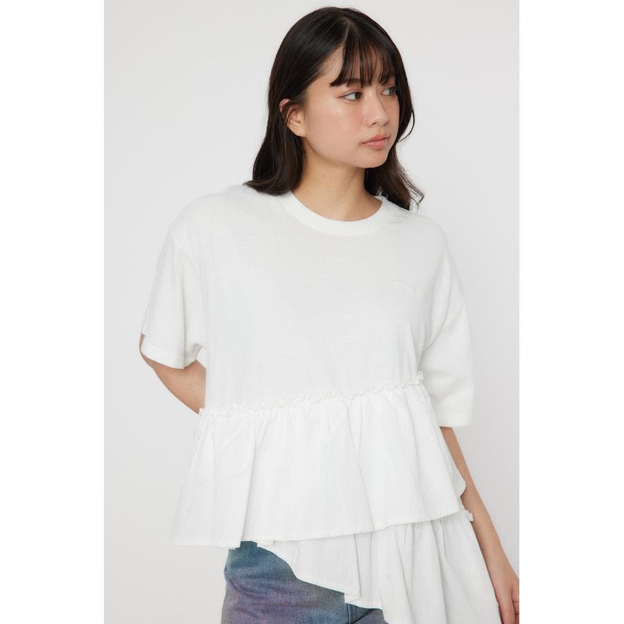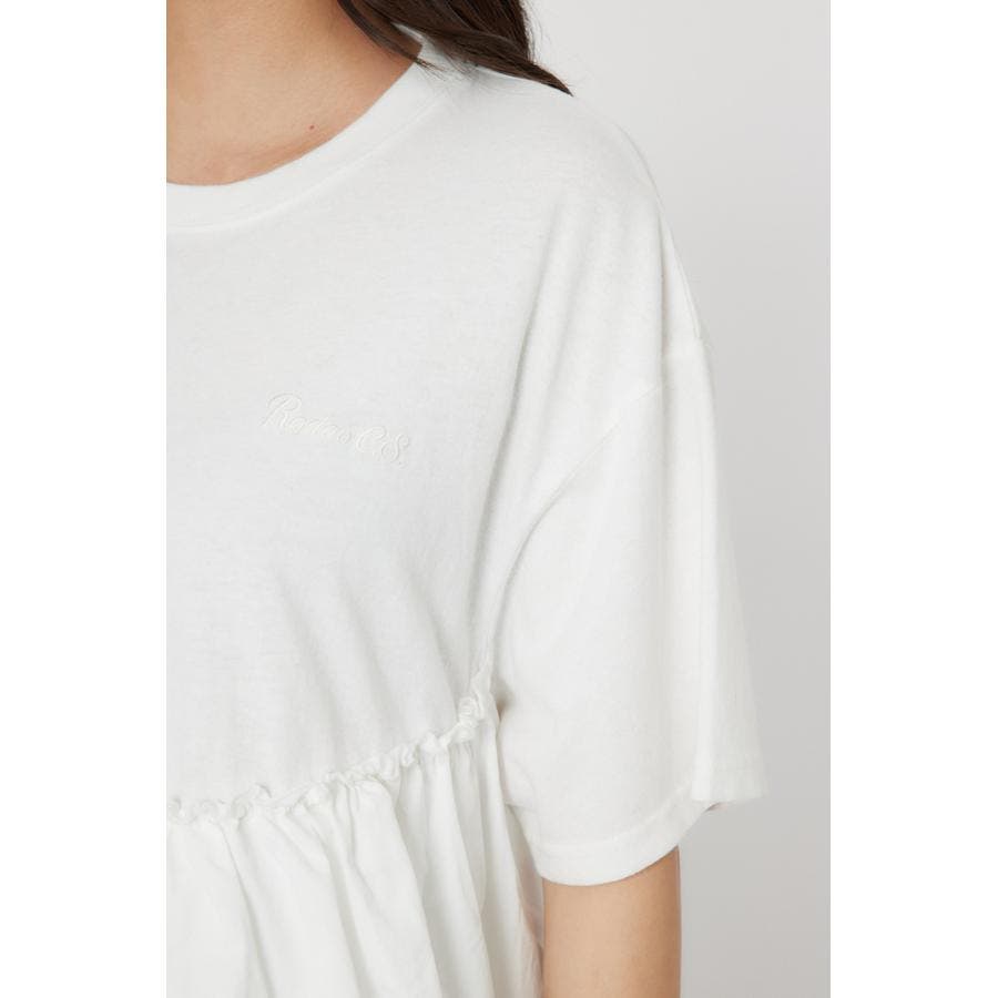 カットソーと布帛がドッキングされたデザイントップス。ピグメント加工を施し、甘くなりすぎない印象に。アシンメトリーな切り替えで体型カバーもできる優れもの。パンツもスカートも合わせやすい丈感で、同色でさりげなく施された胸元の刺繍がポイント。