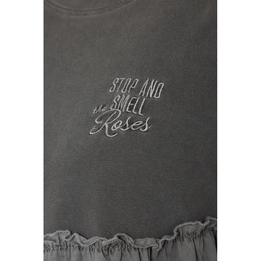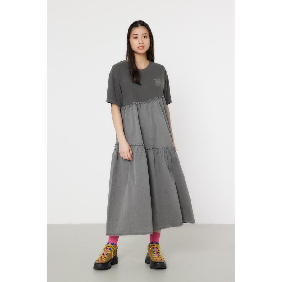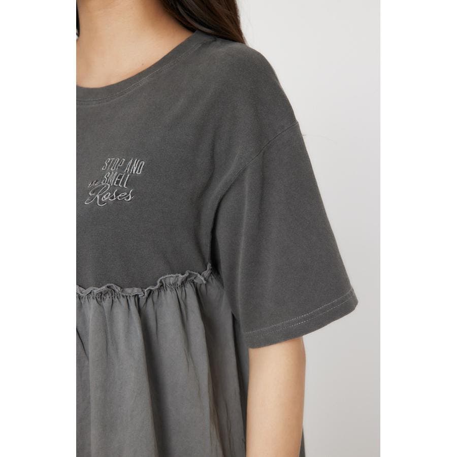 カットソーと布帛がドッキングされたデザインワンピース。ピグメント加工を施し、甘くなりすぎない印象に。1枚で着ても様になるワンピースですが、布帛のボトムやデニムをレイヤードするのもおすすめ。同色でさりげなく施された胸元の刺繍がポイント。