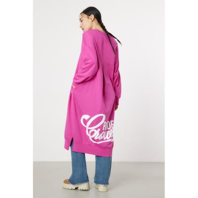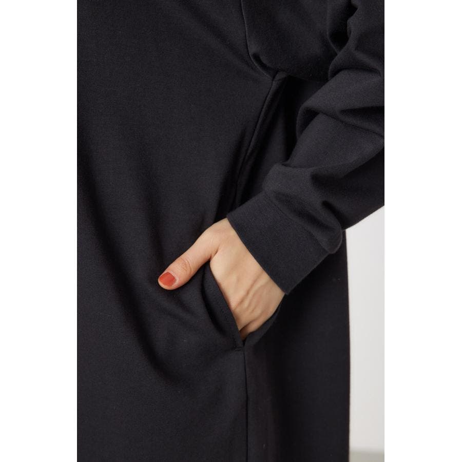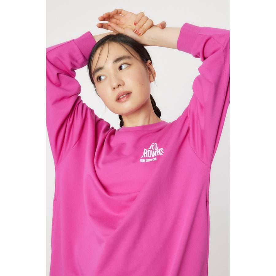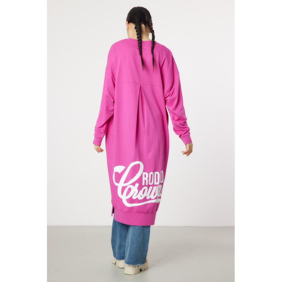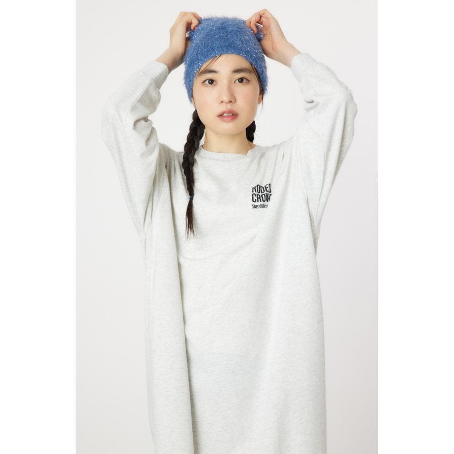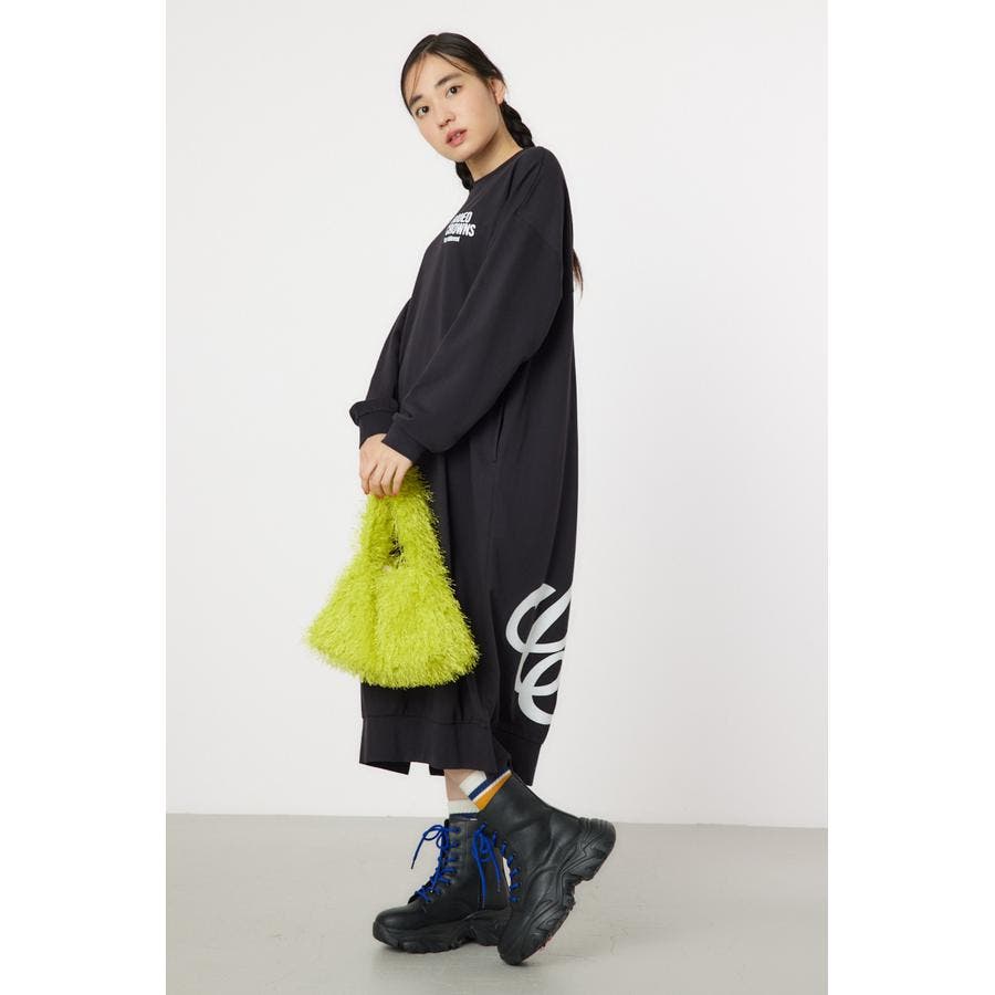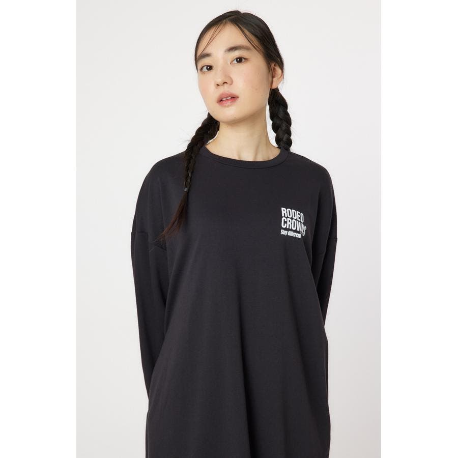 裾のバックプリントが、ただのスウェットワンピと差をつけて、カジュアルなおしゃれに最高の一枚。着心地が良いので毎日でも着たいくらい。私は167㎝でふくらはぎ中くらいの丈感だけど、低身長さんならロングで着られてそれもかわいいと思います。同型で高身長向けロングも作って欲しいなあ。
