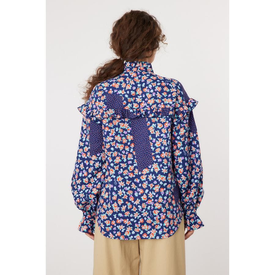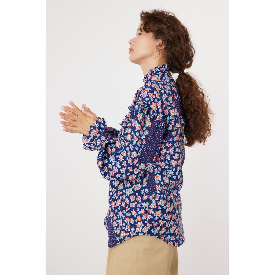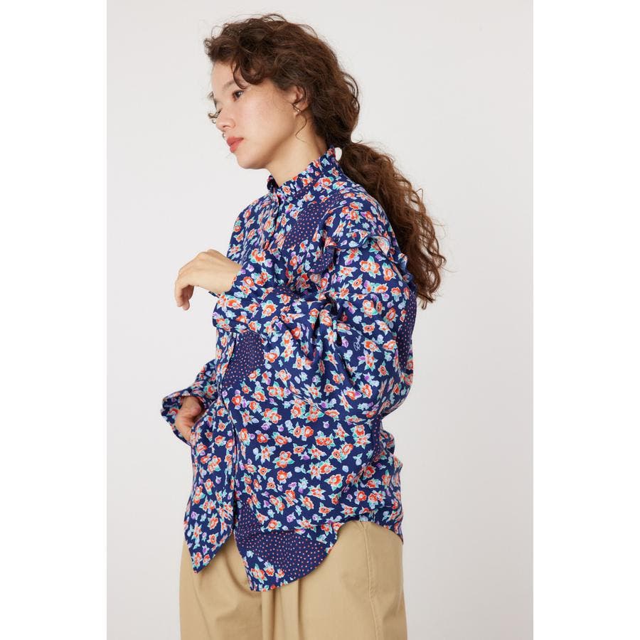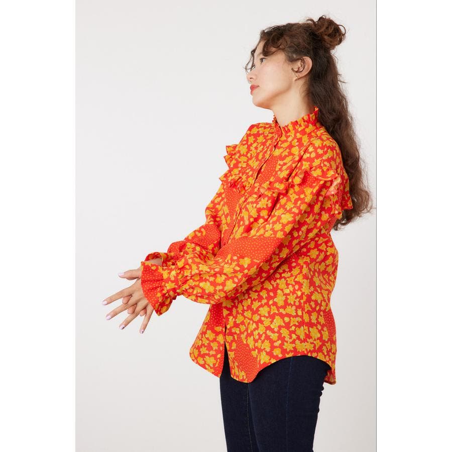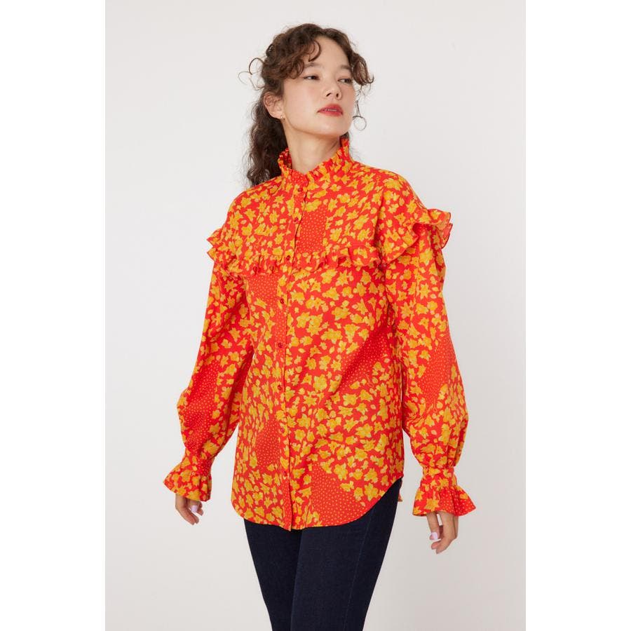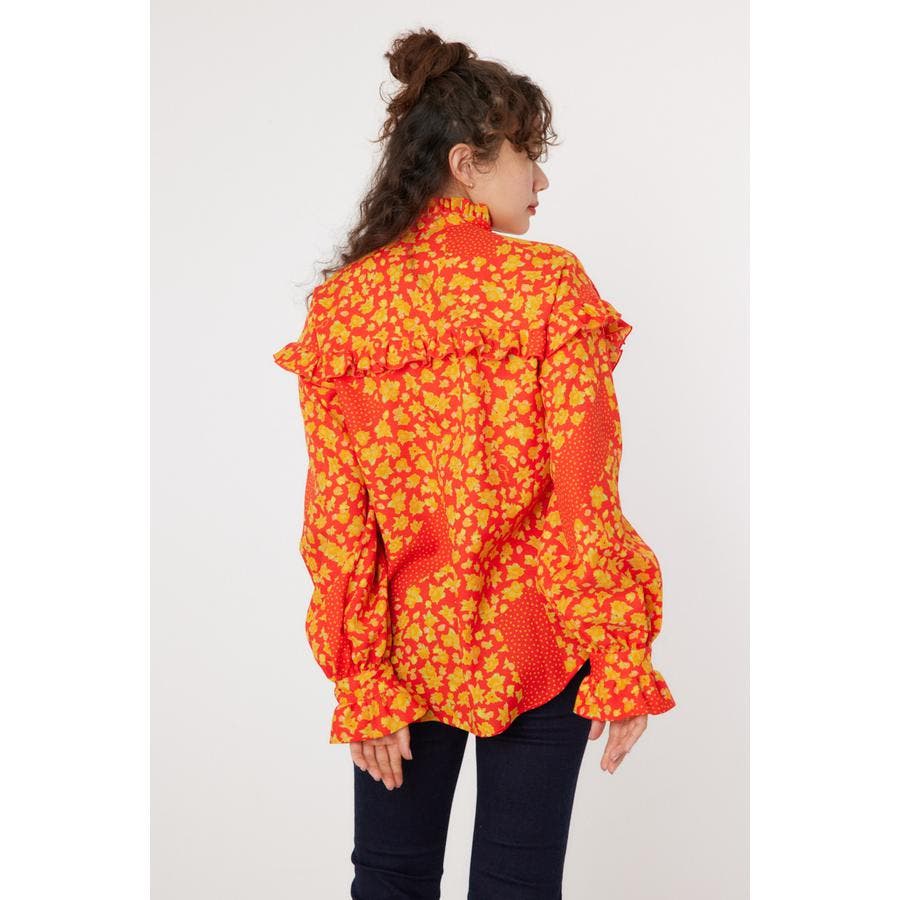 80'sパターンを柄のベースに置き、オリジナルで作成されたフローラルパターンのブラウス。襟、袖、胸元のさりげないフリルを活かし、レイヤードスタイルを楽しめるアイテムです。色褪せないデザインをお楽しみください。