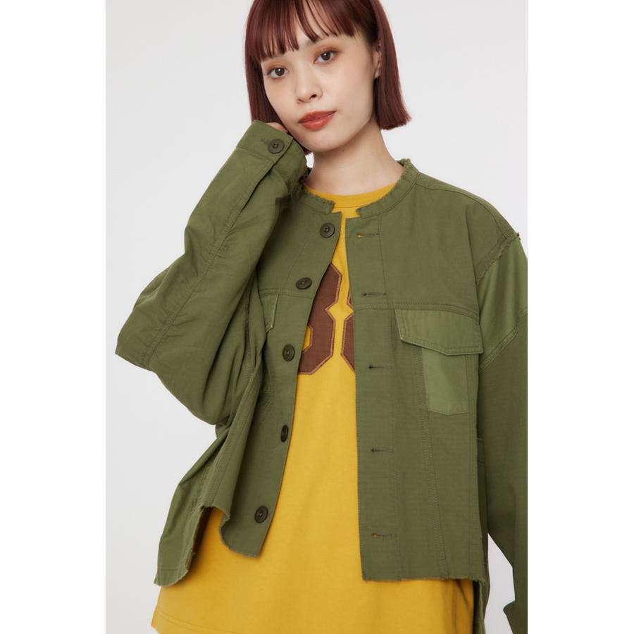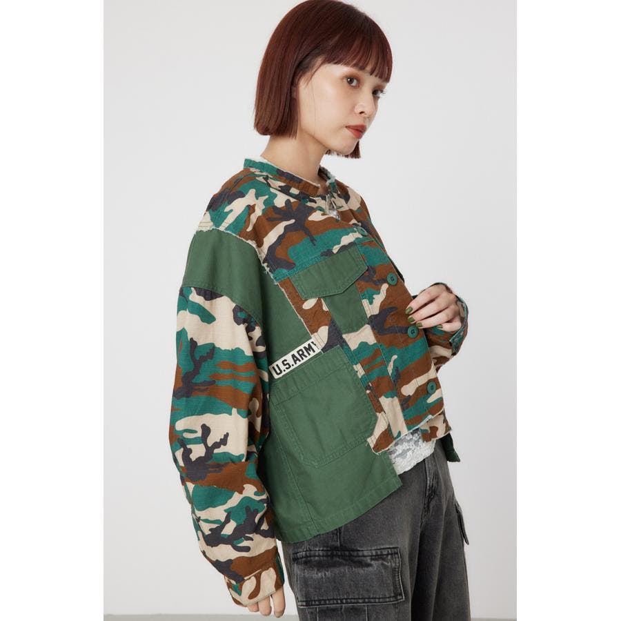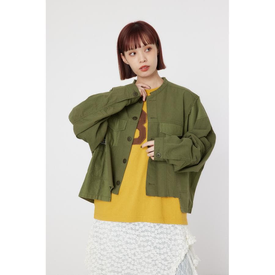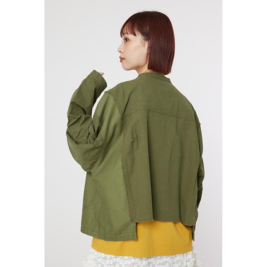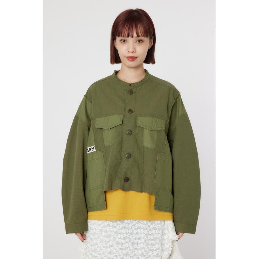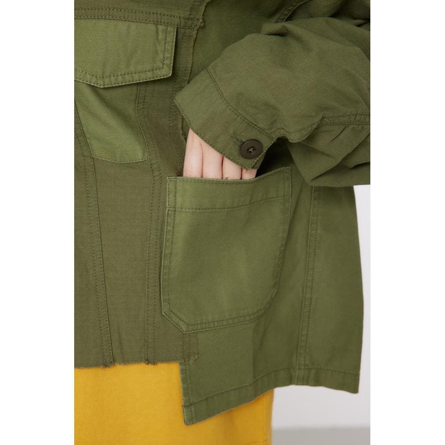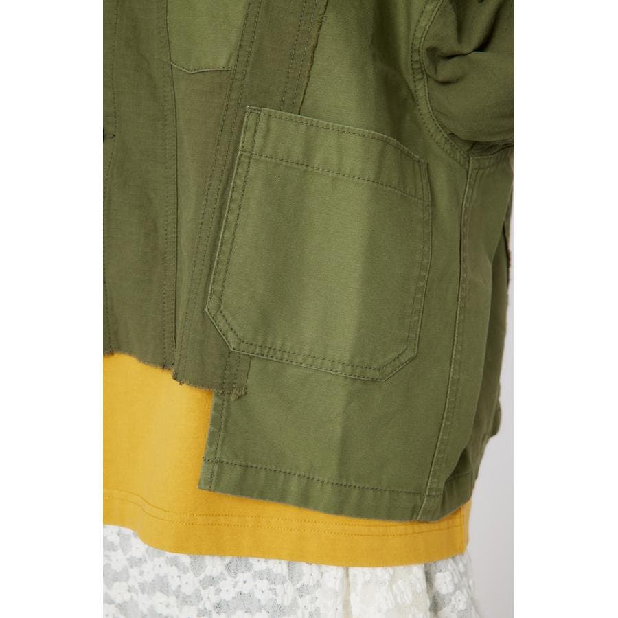 2色のミリタリージャケットをドッキングさせたようなデザインのリメイク風ジャケット。やや短めの丈感で、スタイリングのバランスも取りやすいアイテムです。