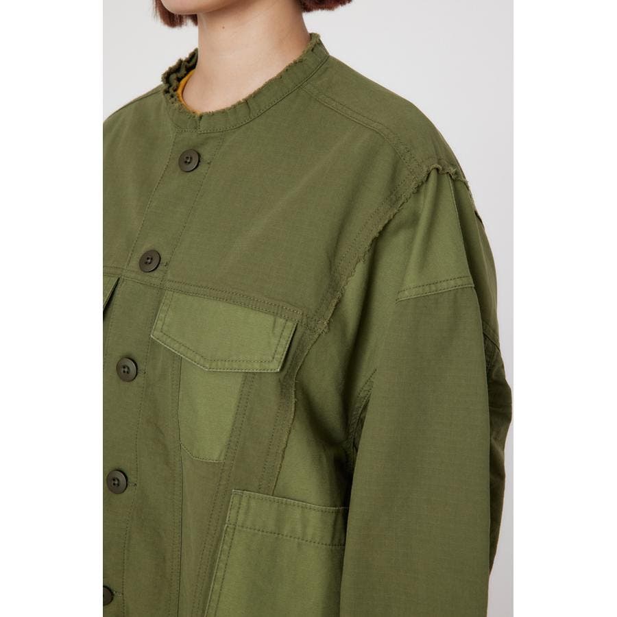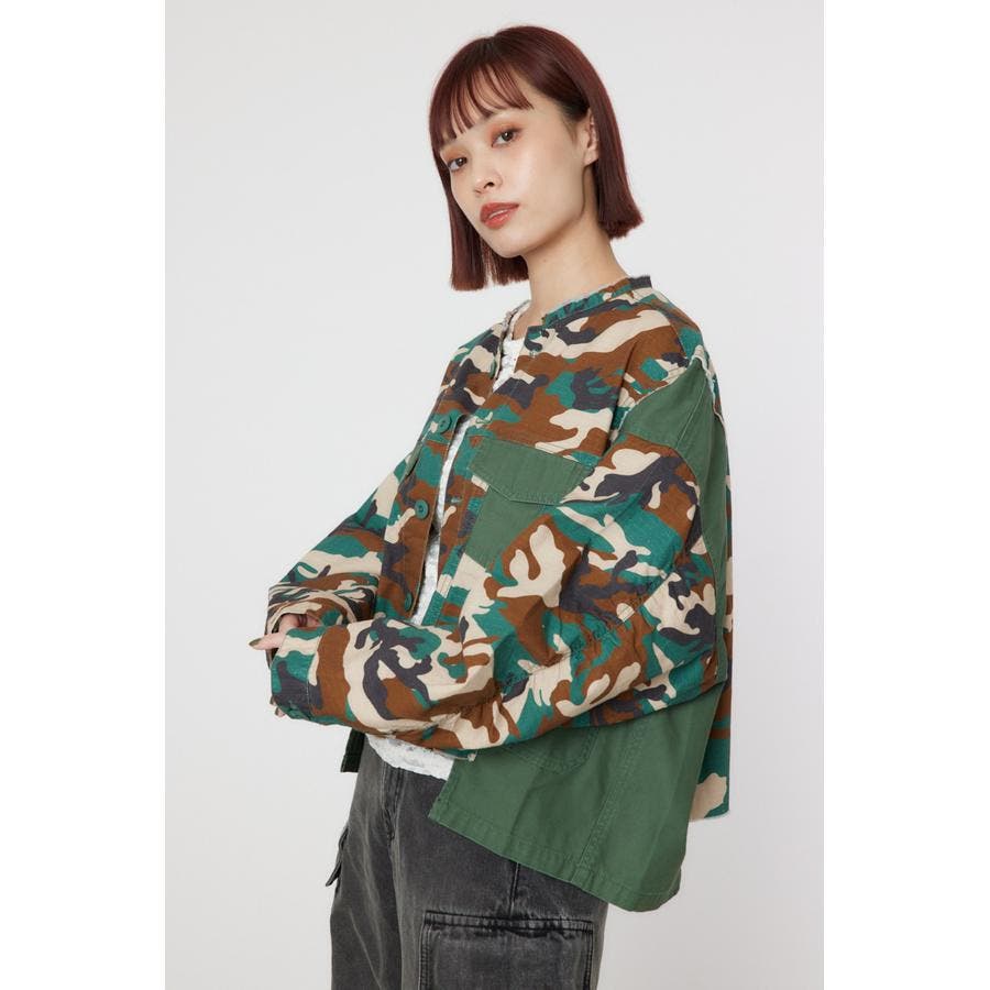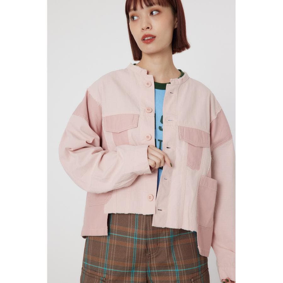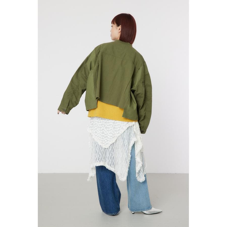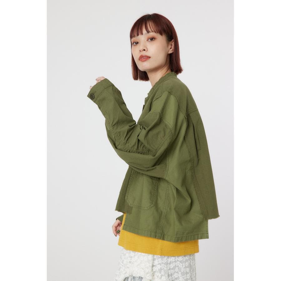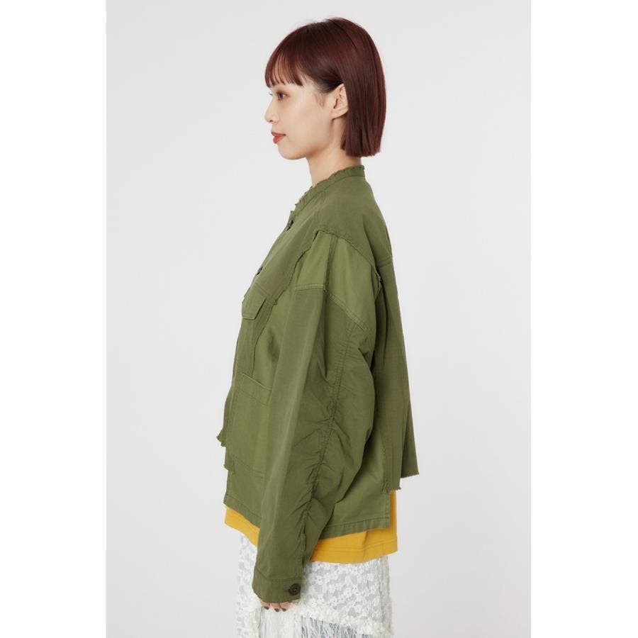 2色のミリタリージャケットをドッキングさせたようなデザインのリメイク風ジャケット。やや短めの丈感で、スタイリングのバランスも取りやすいアイテムです。