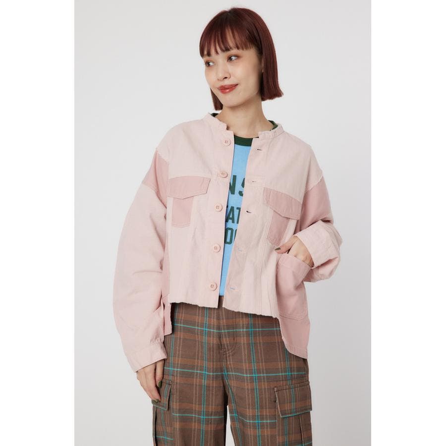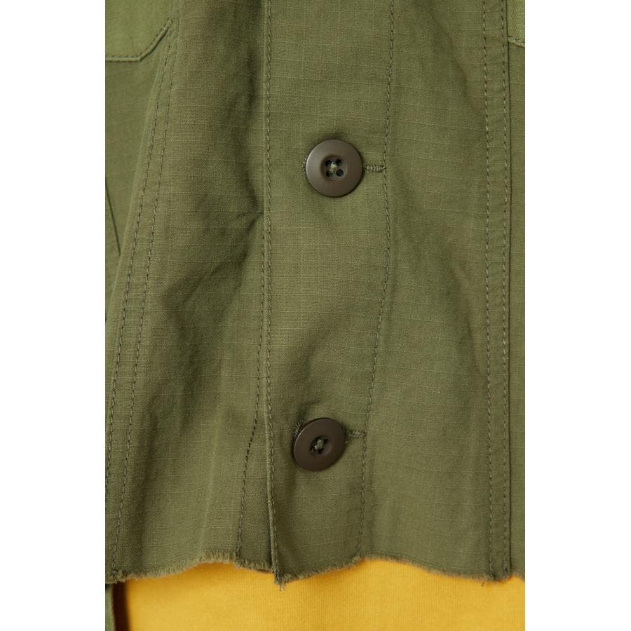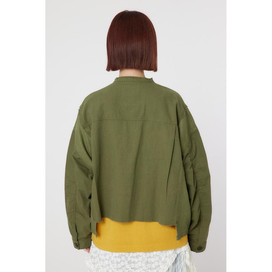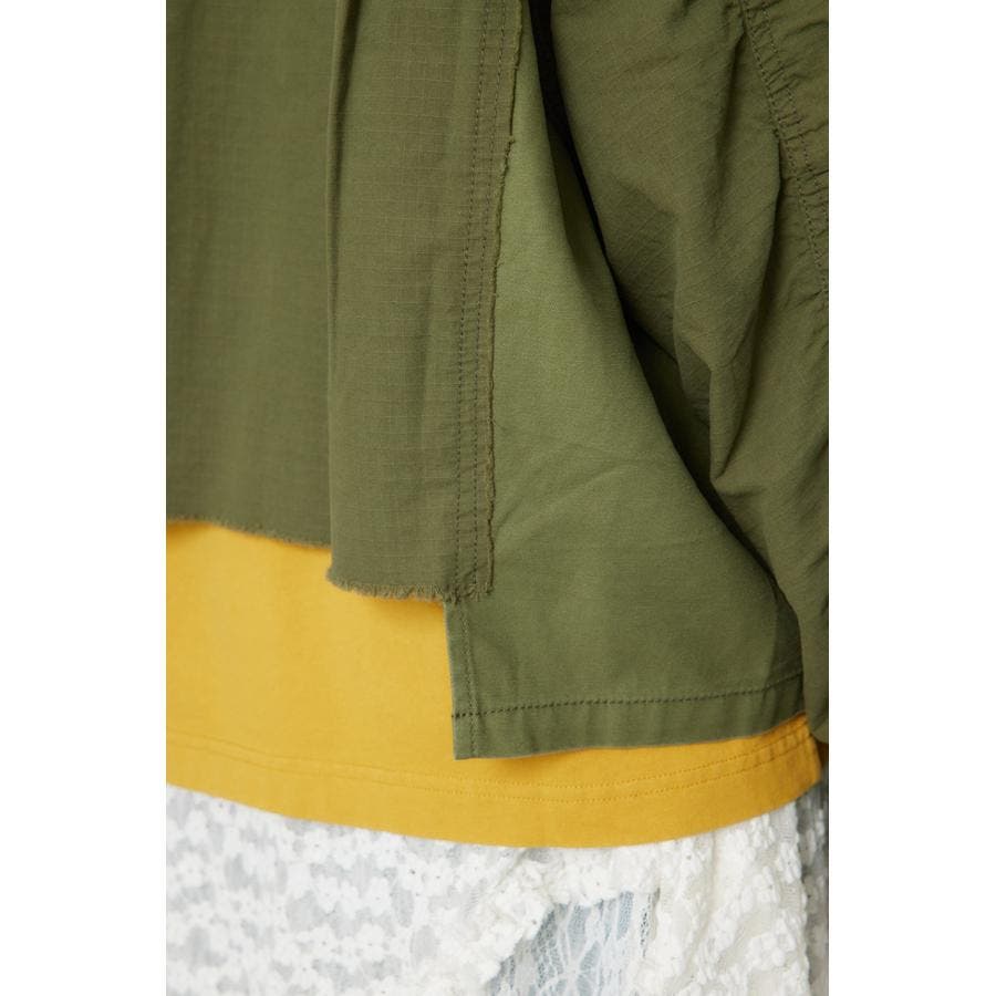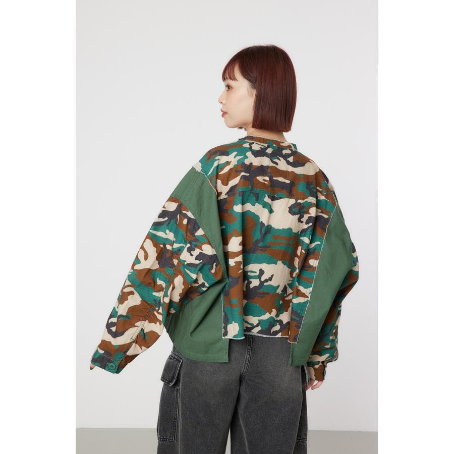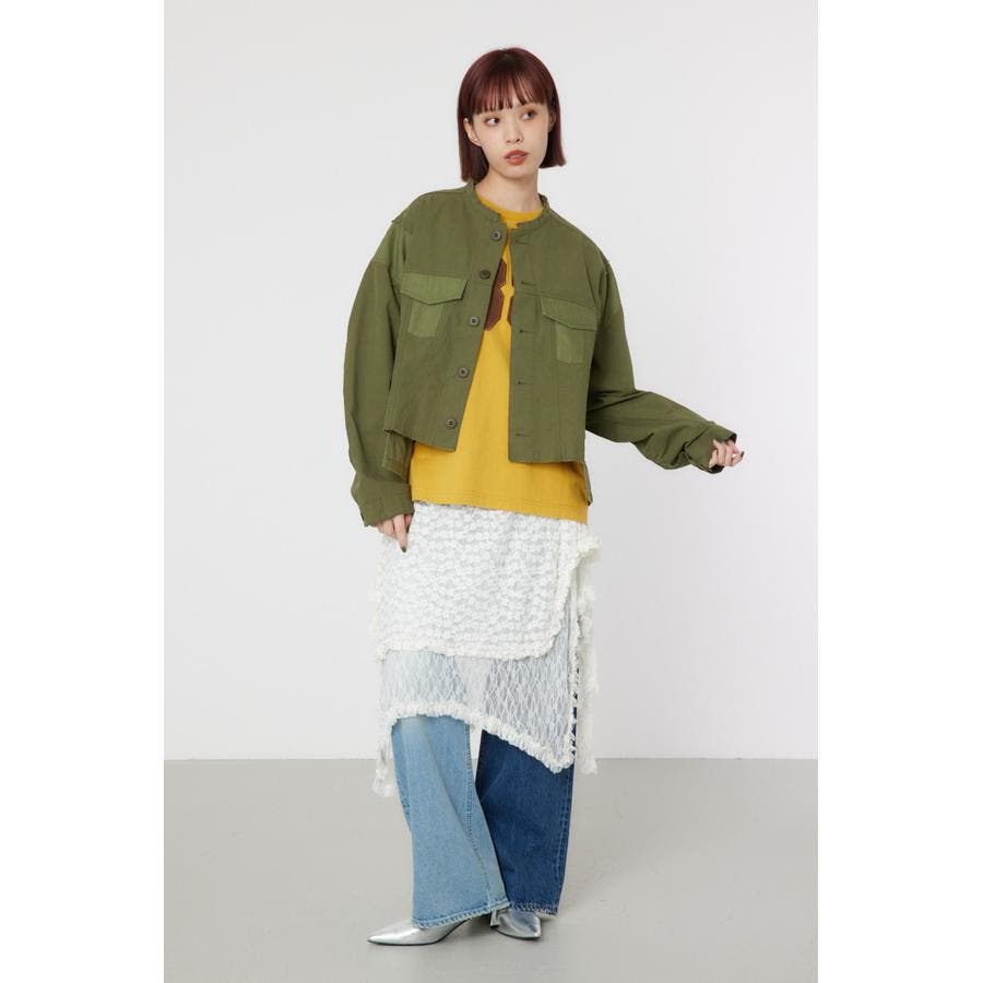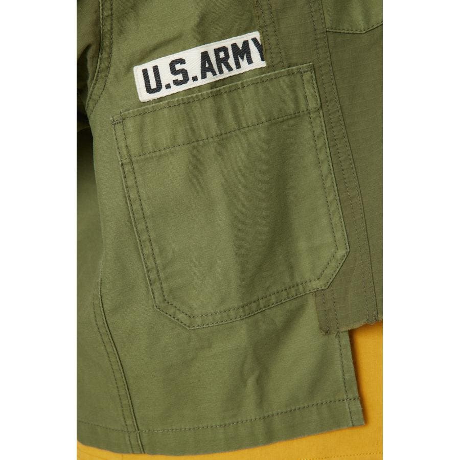 2色のミリタリージャケットをドッキングさせたようなデザインのリメイク風ジャケット。やや短めの丈感で、スタイリングのバランスも取りやすいアイテムです。