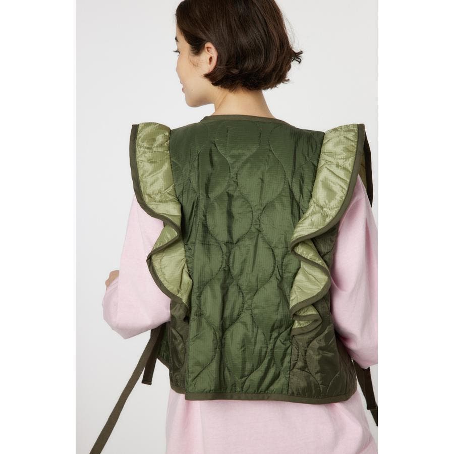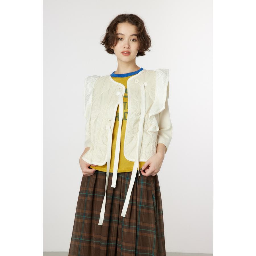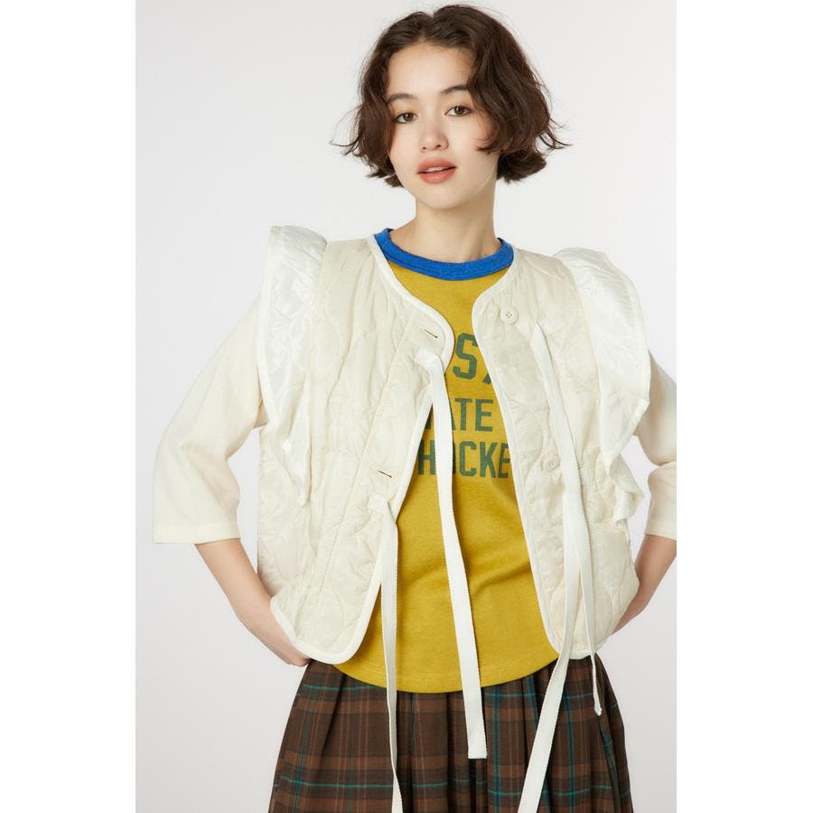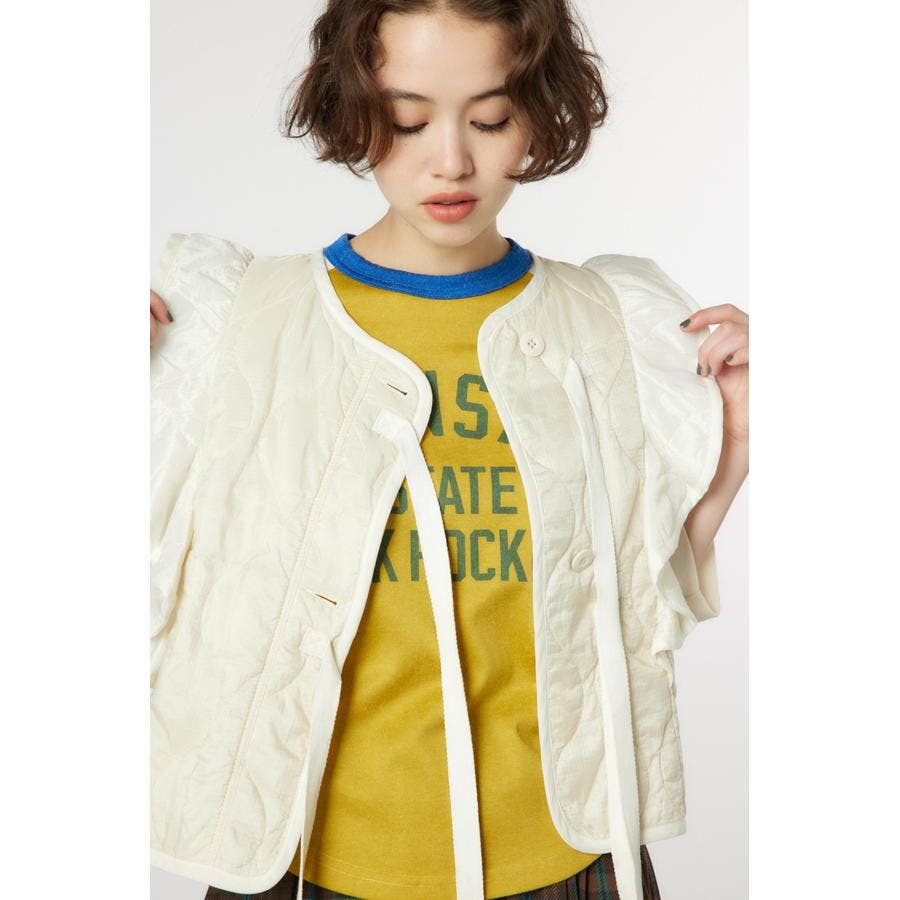キルティングベストにフリルをドッキングして、ガーリーなイメージに仕上げたアイテム。ワンピースの上や、グラフィックTシャツの上に羽織るのがおすすめ。