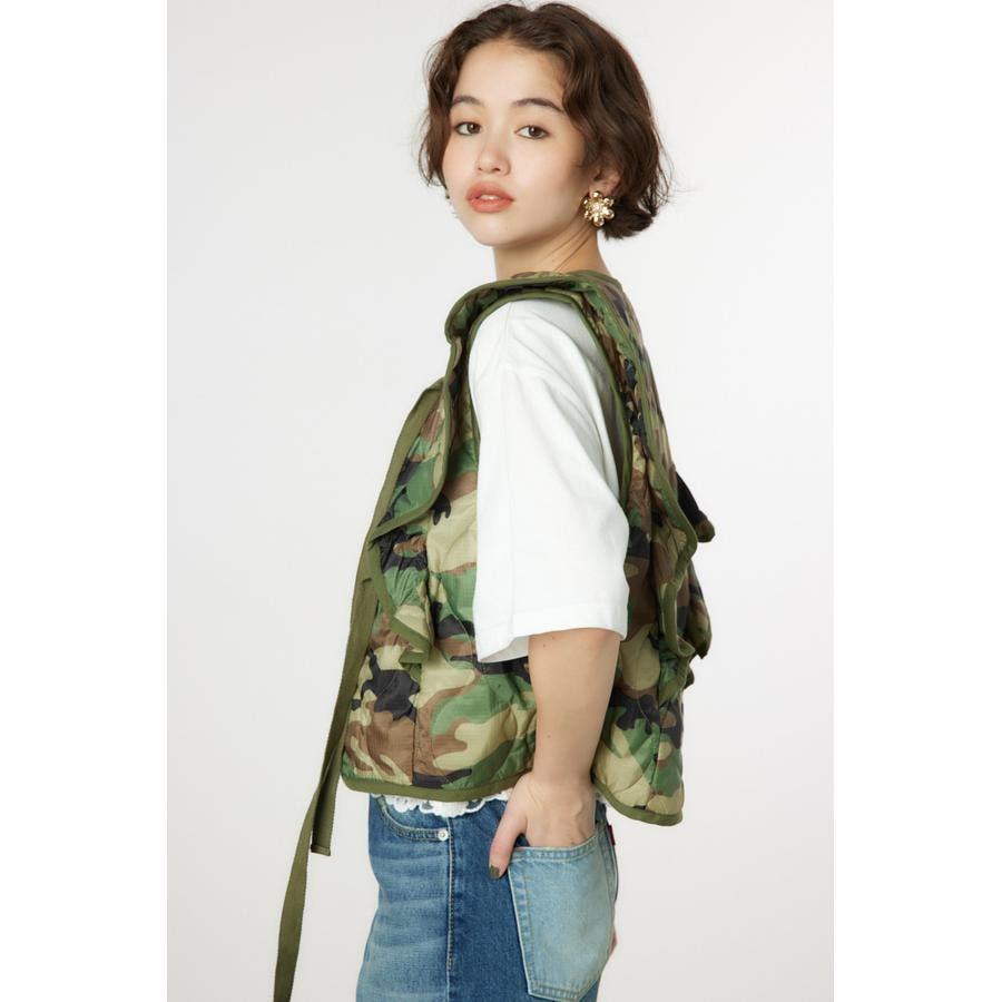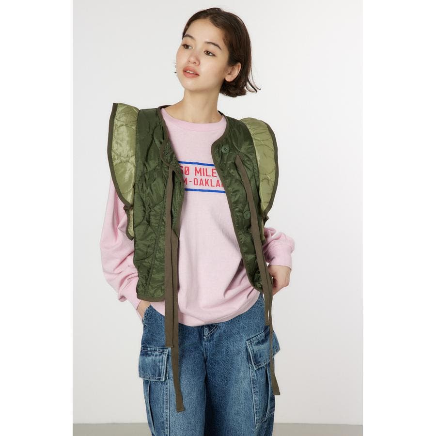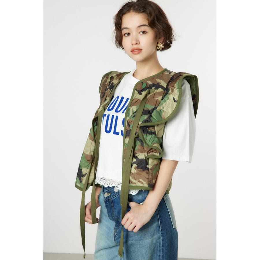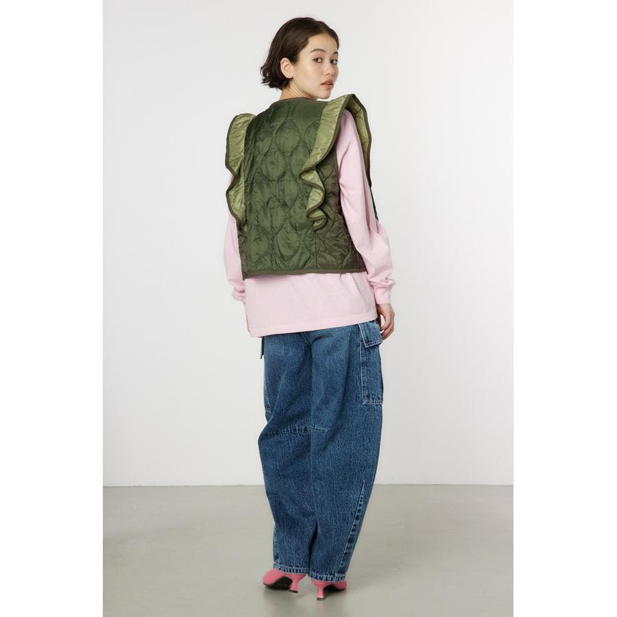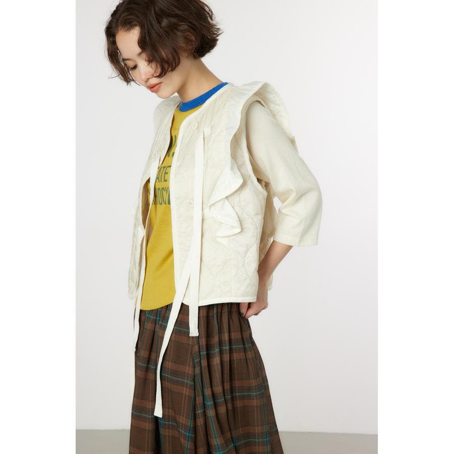 キルティングベストにフリルをドッキングして、ガーリーなイメージに仕上げたアイテム。ワンピースの上や、グラフィックTシャツの上に羽織るのがおすすめ。