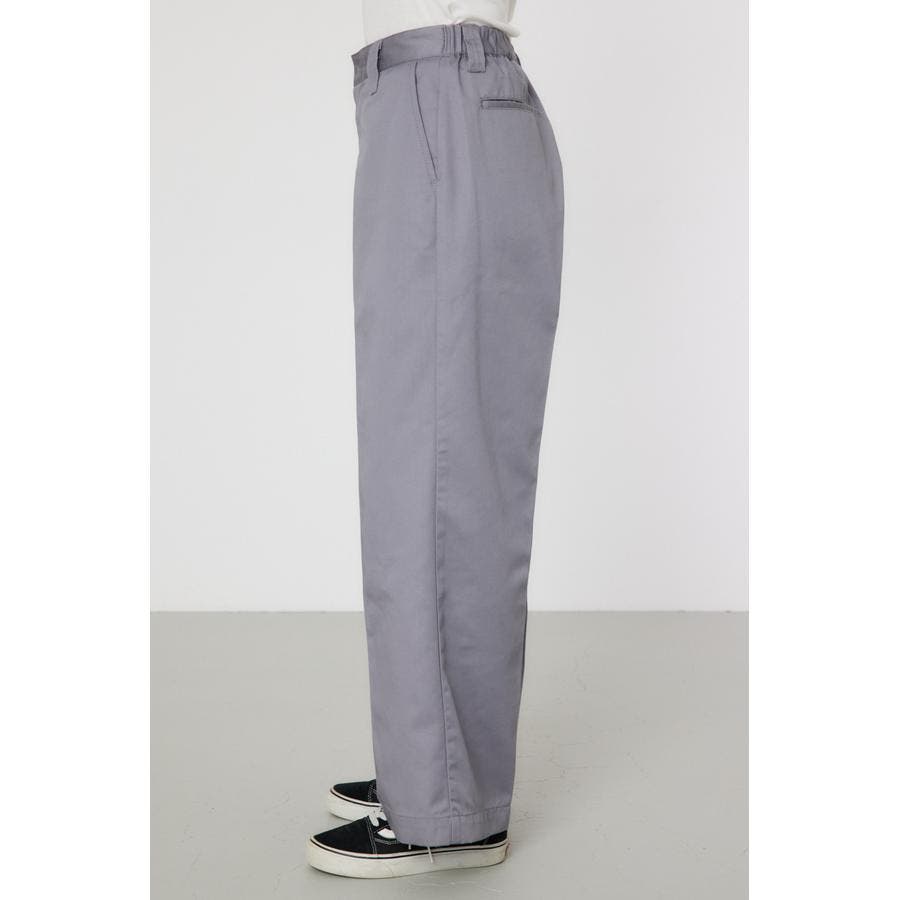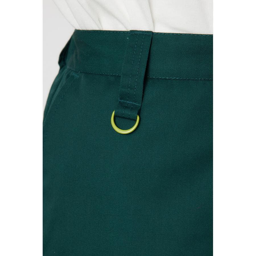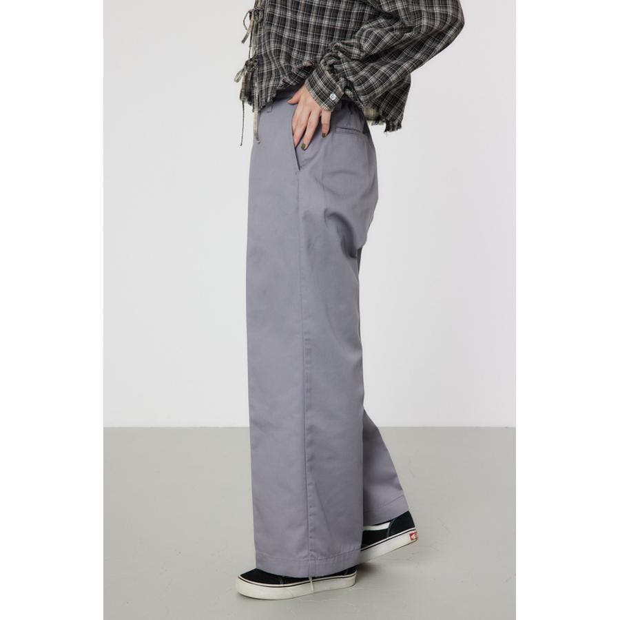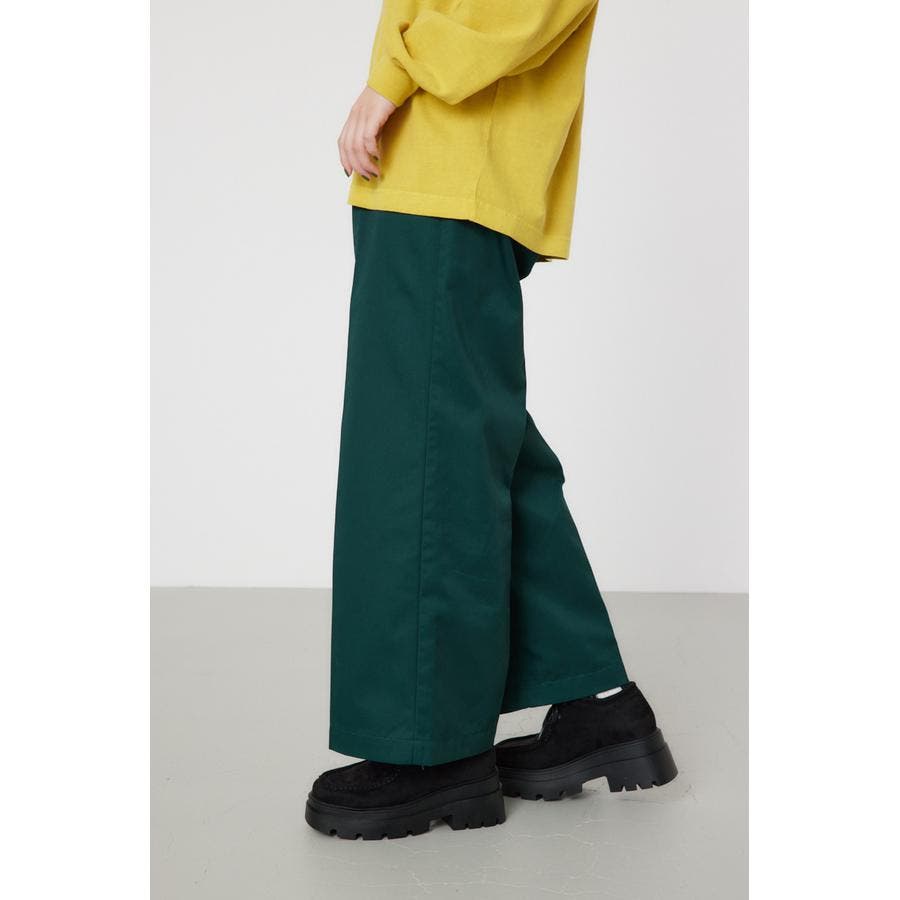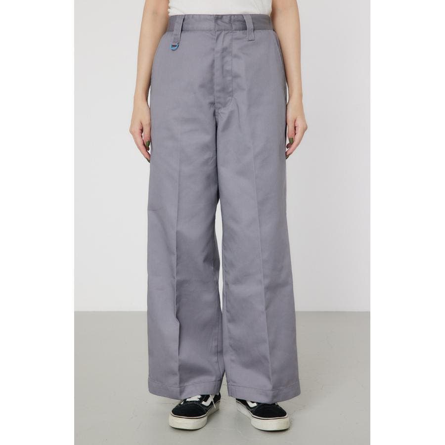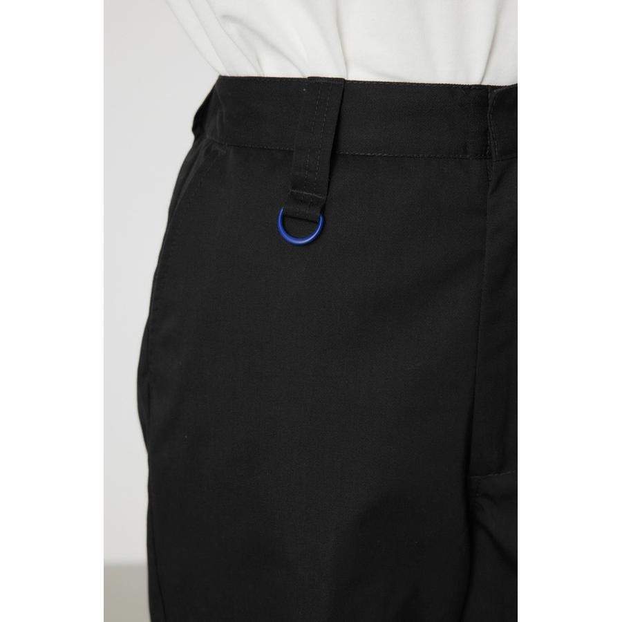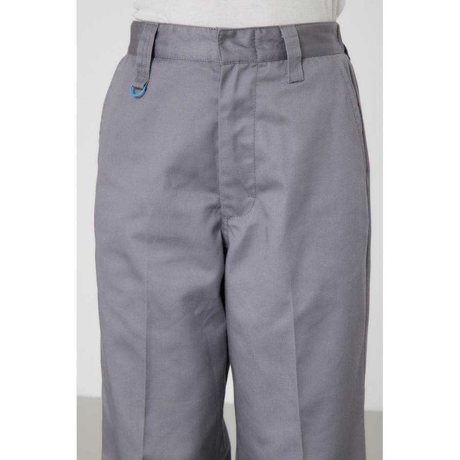 メンズのスケーターが履いているような目の詰まったしっかり目のチノ素材を使用したパンツ。履けば履くほど馴染んで柔らかくなるアイテムです。センタープレスを施し、カジュアルで太めのデザインながら、足をきれいに見せてくれる優れもの。ベルトループには配色のDカンが付いているので、キーやイヤホンケースなどお好きな物をぶら下げて着用すると、メンズライクなスタイリングが完成します。