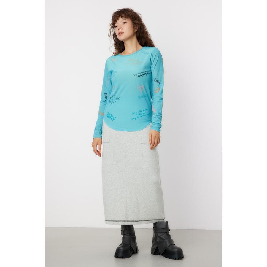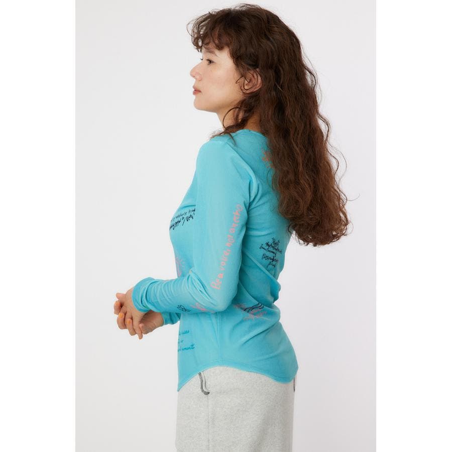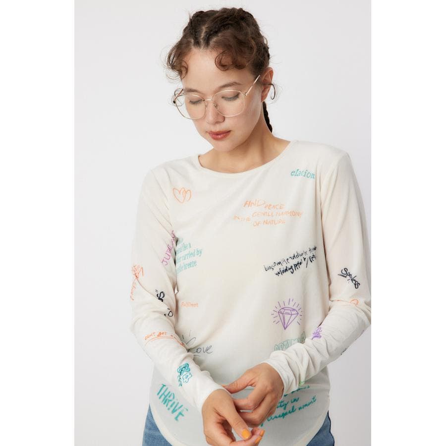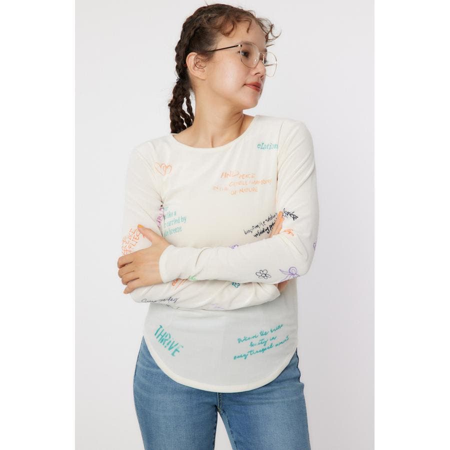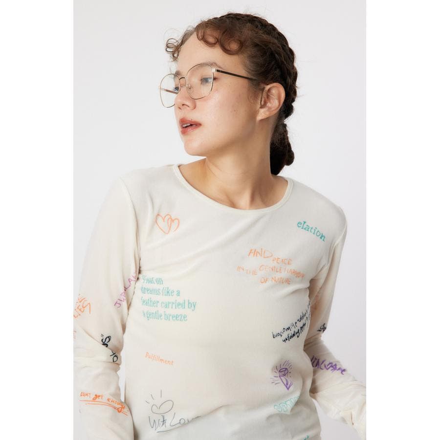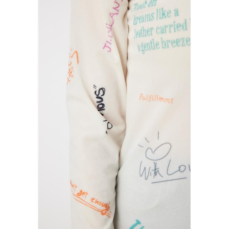 シアーベロアを使用した季節感ある総柄トップス。コンパクトなサイズ感で、秋冬にはスウェットやニットにレイヤードするのもおすすめ。カラフルな配色のランダムテキスト柄なので、コーディネートのポイントになるアイテムです。