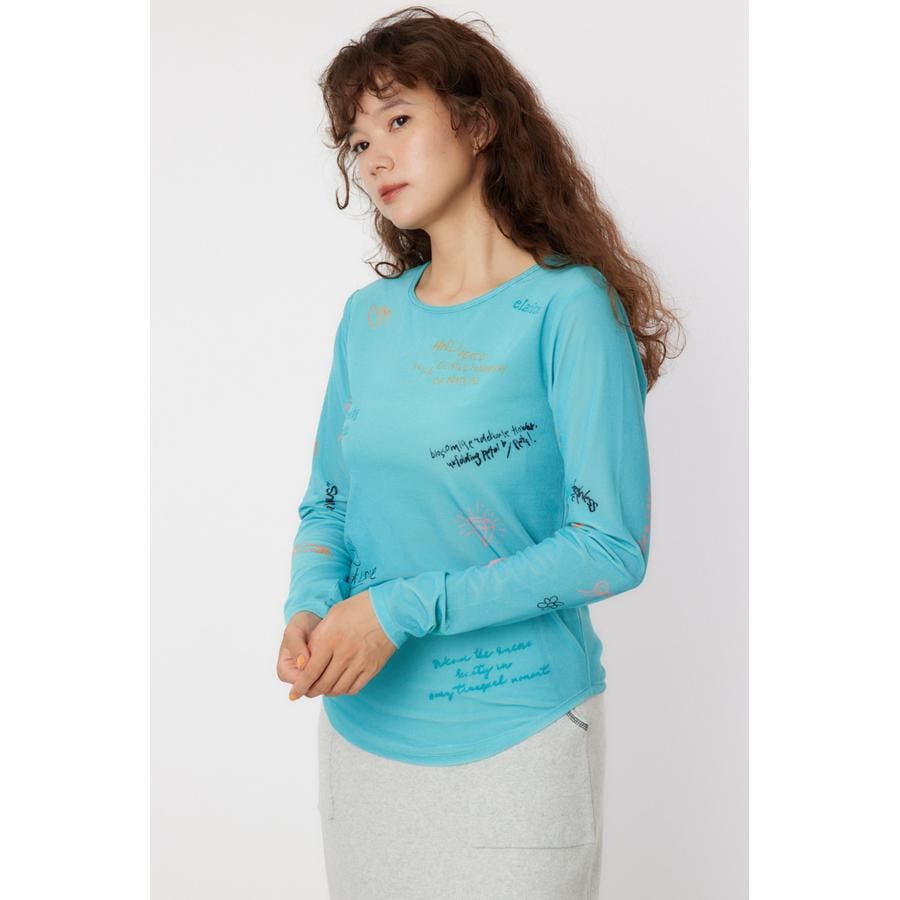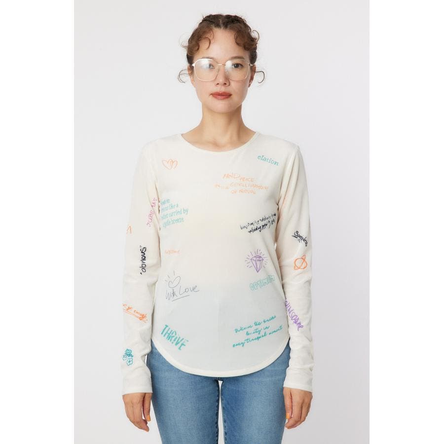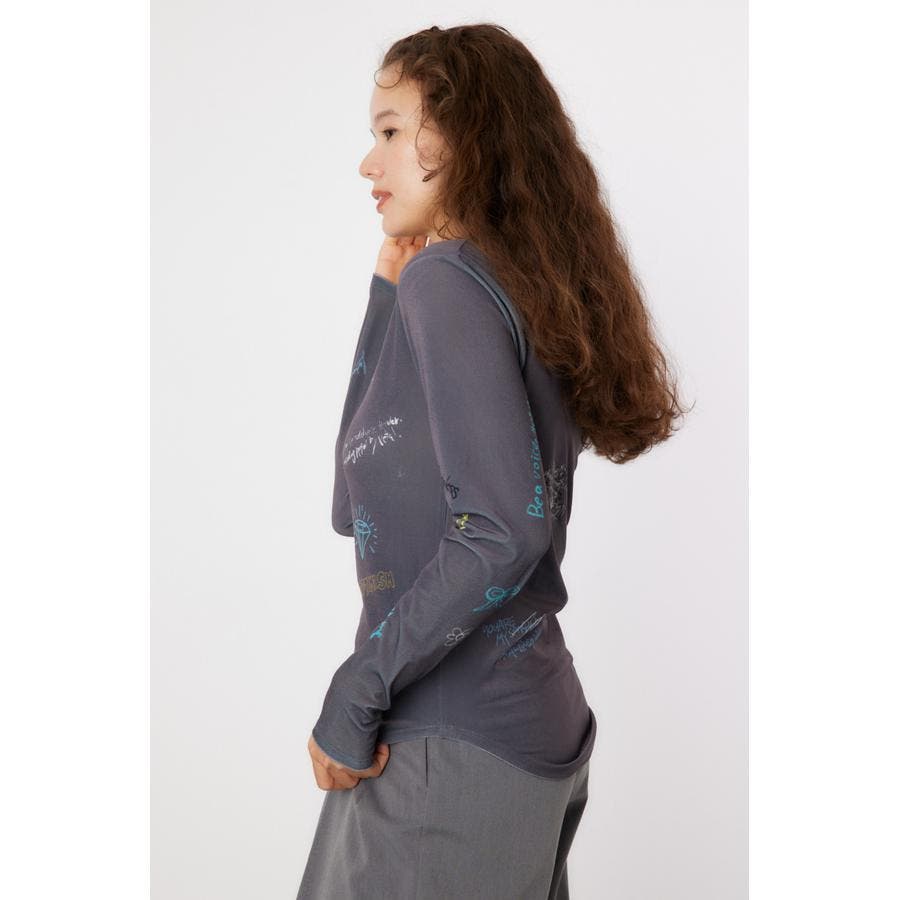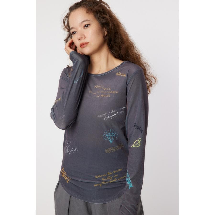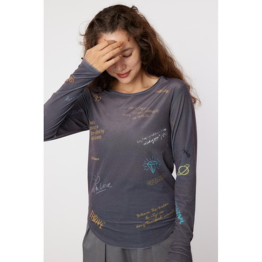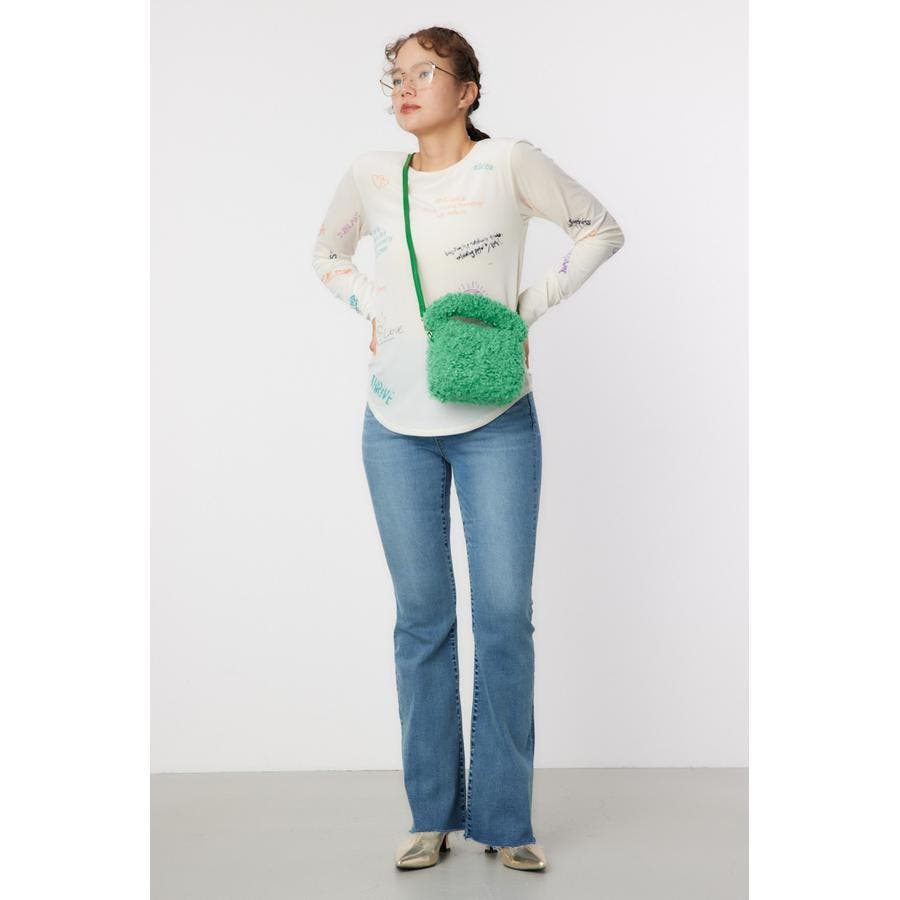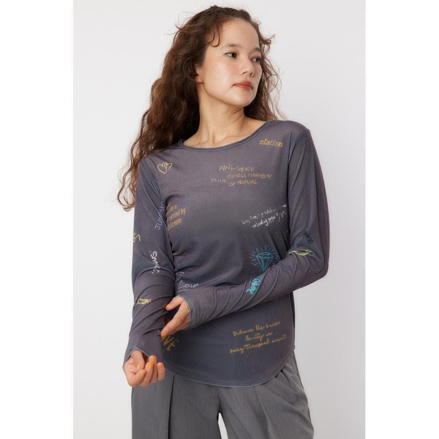 シアーベロアを使用した季節感ある総柄トップス。コンパクトなサイズ感で、秋冬にはスウェットやニットにレイヤードするのもおすすめ。カラフルな配色のランダムテキスト柄なので、コーディネートのポイントになるアイテムです。