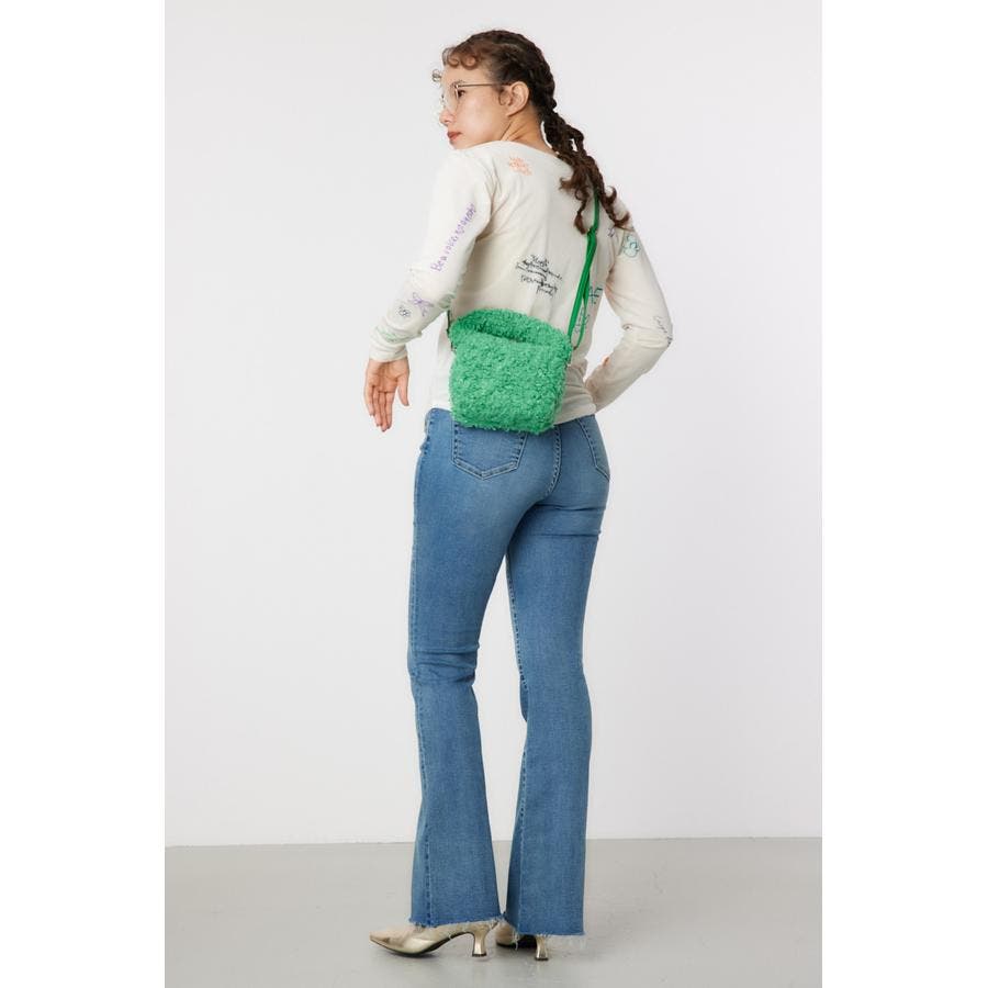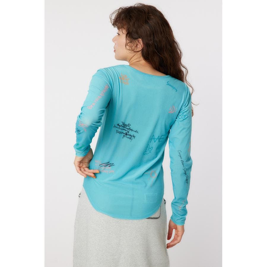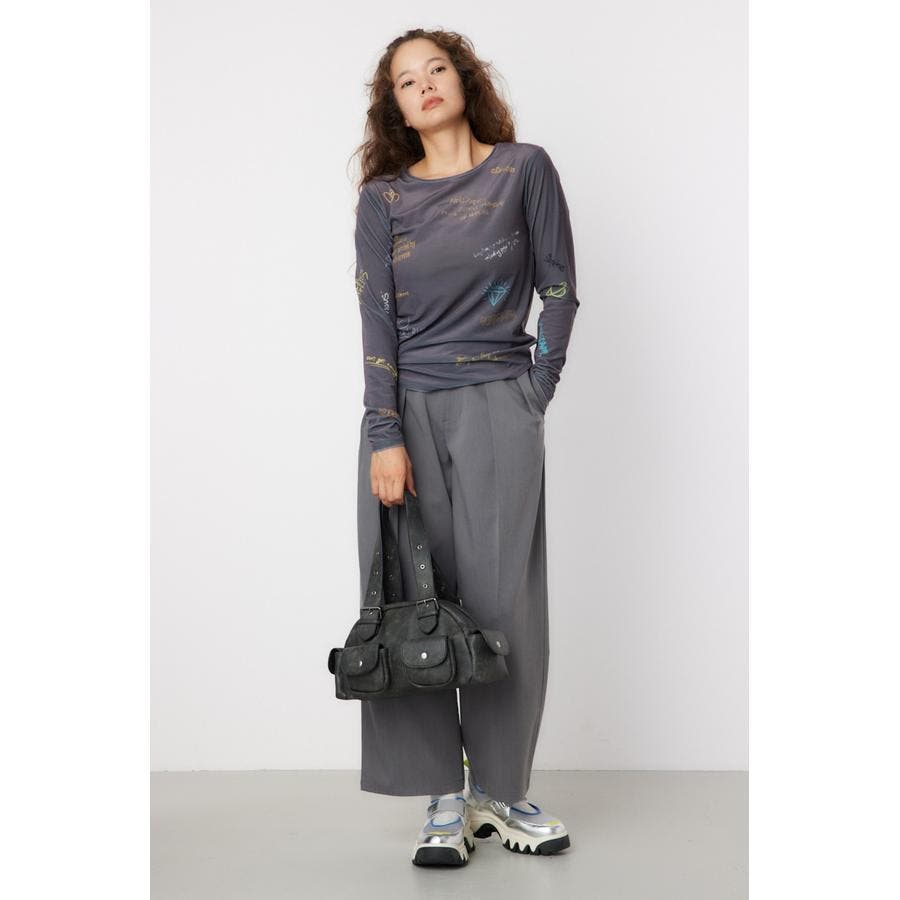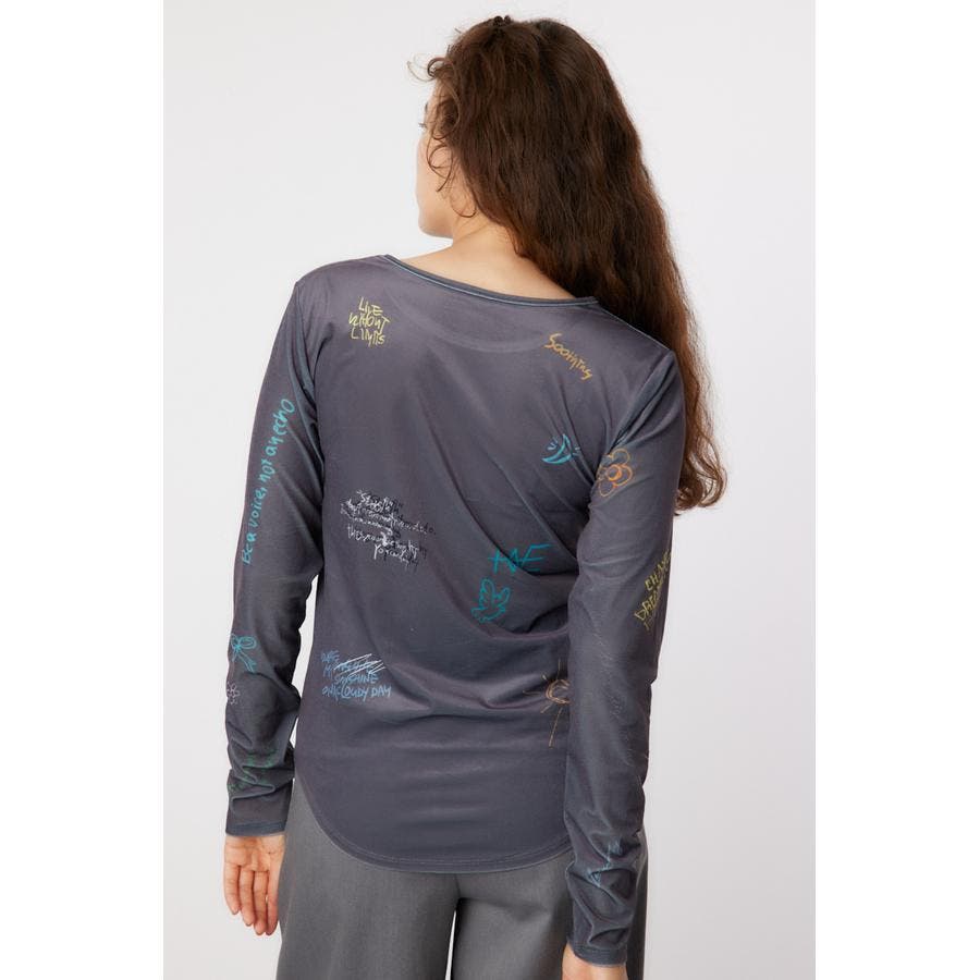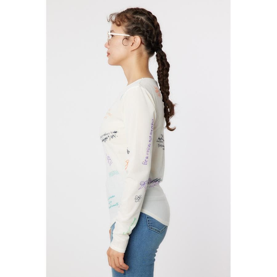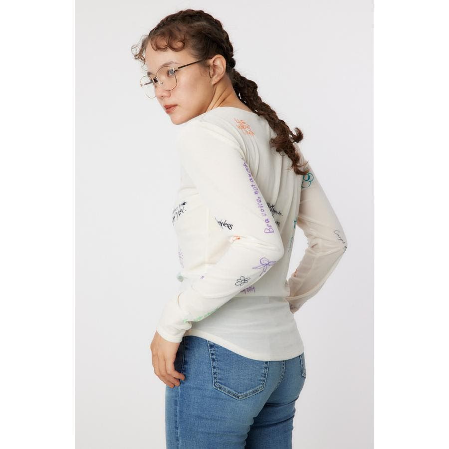 シアーベロアを使用した季節感ある総柄トップス。コンパクトなサイズ感で、秋冬にはスウェットやニットにレイヤードするのもおすすめ。カラフルな配色のランダムテキスト柄なので、コーディネートのポイントになるアイテムです。
