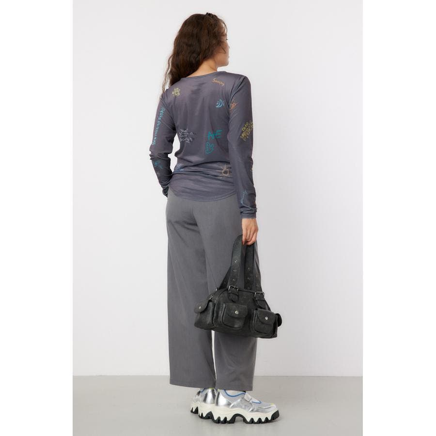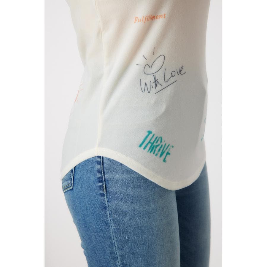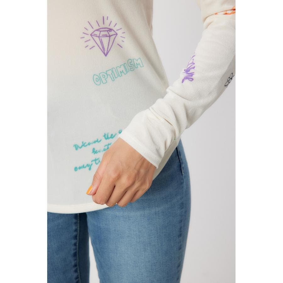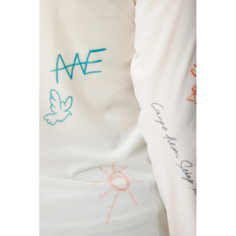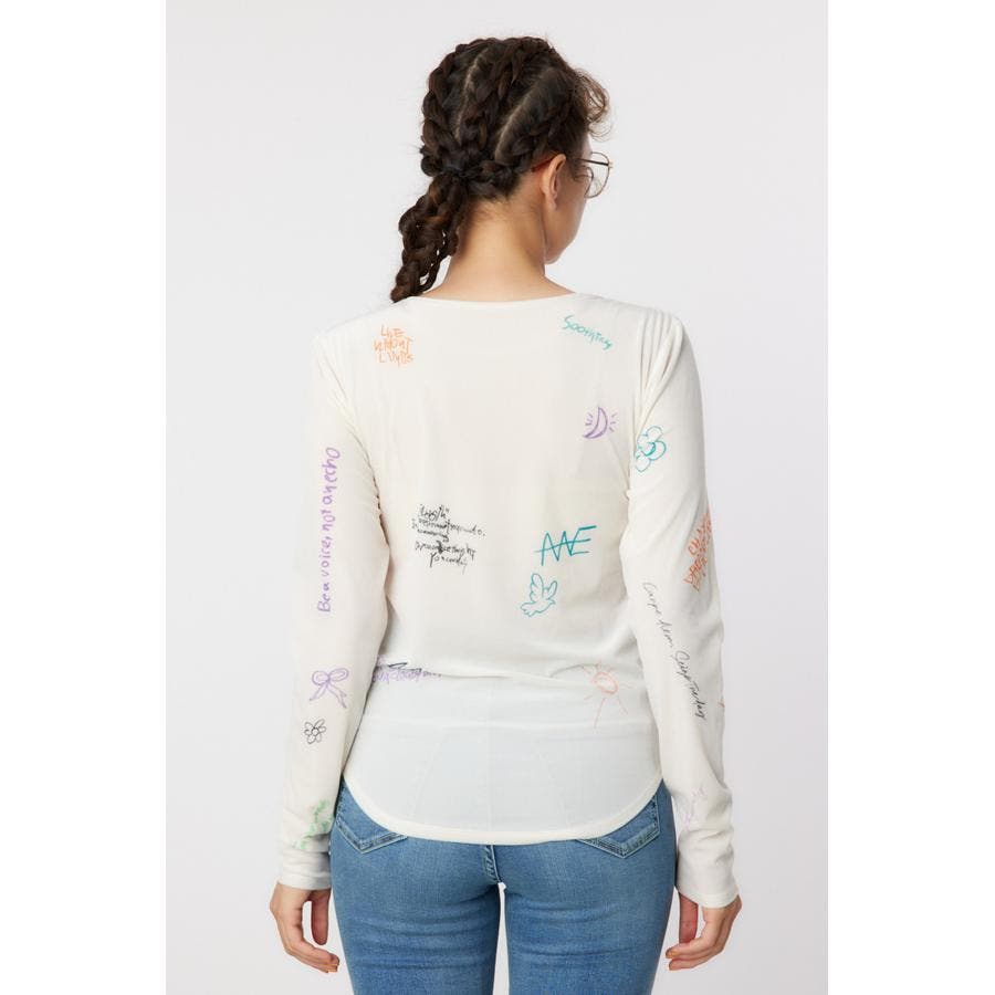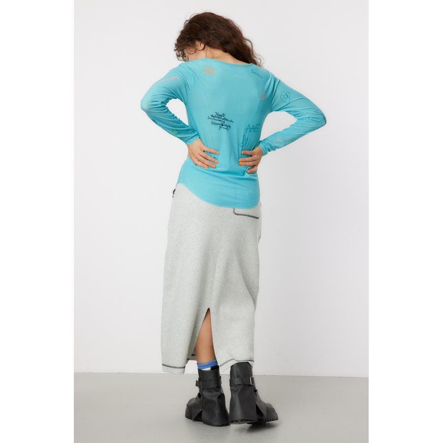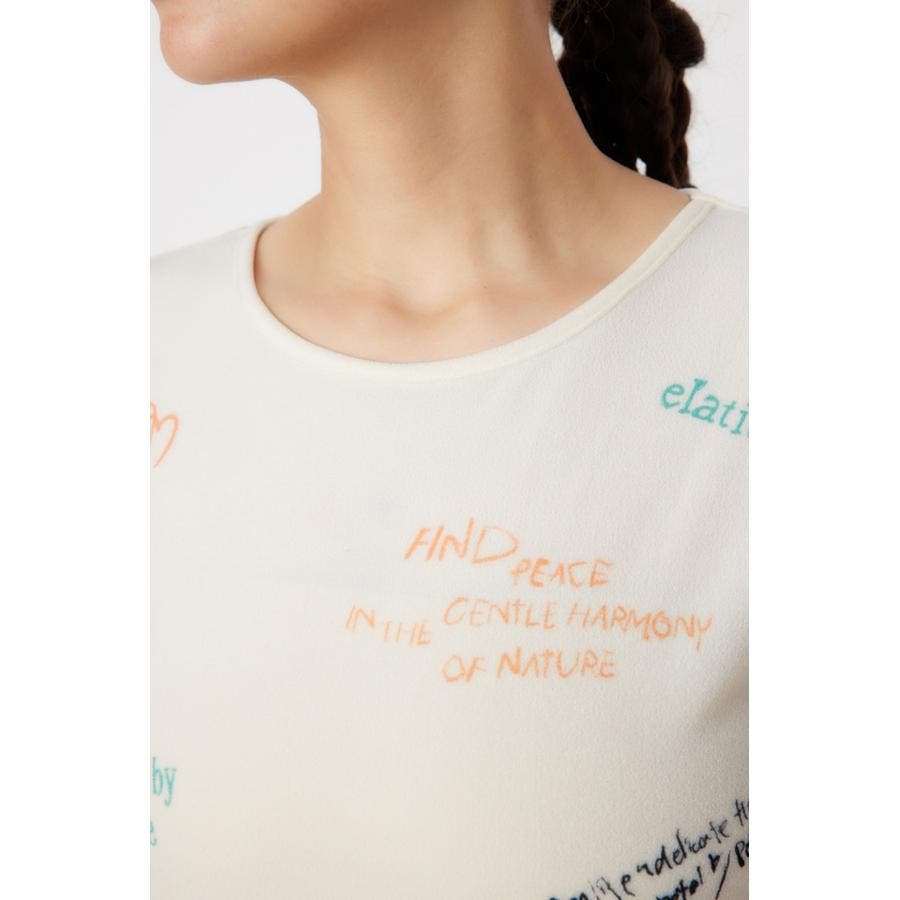 シアーベロアを使用した季節感ある総柄トップス。コンパクトなサイズ感で、秋冬にはスウェットやニットにレイヤードするのもおすすめ。カラフルな配色のランダムテキスト柄なので、コーディネートのポイントになるアイテムです。