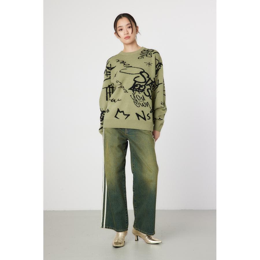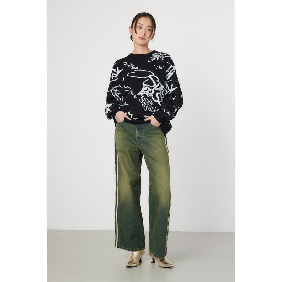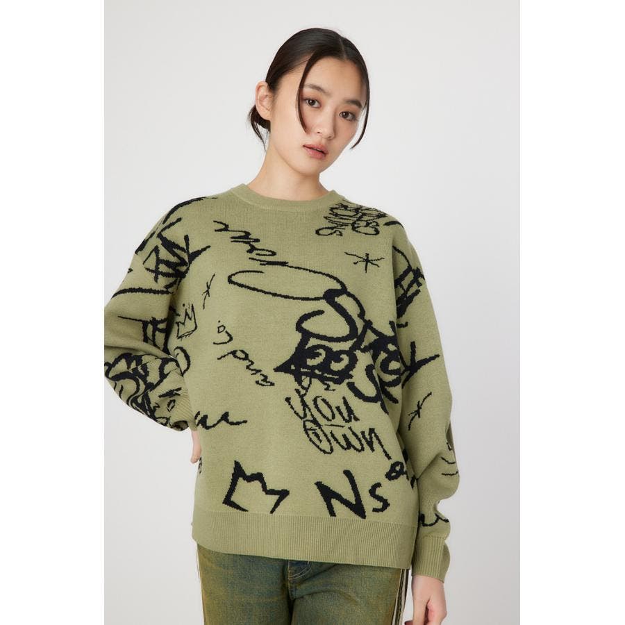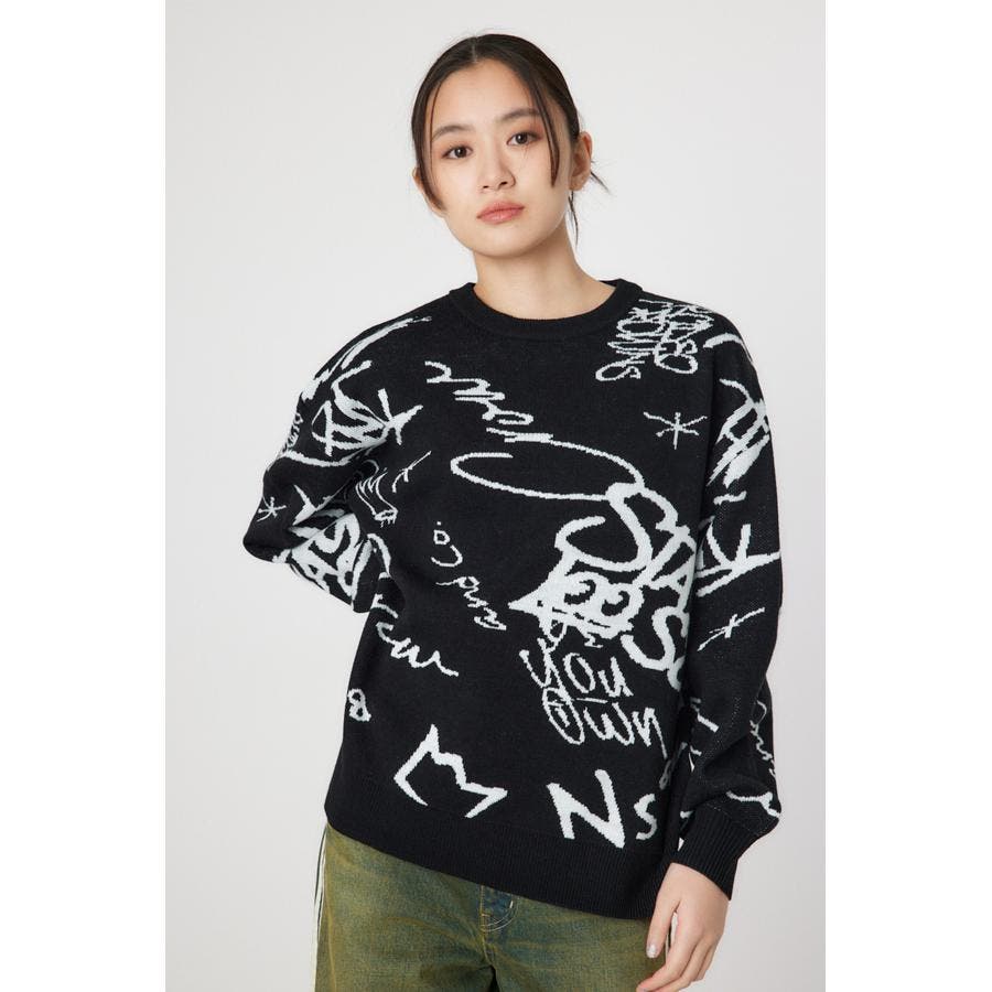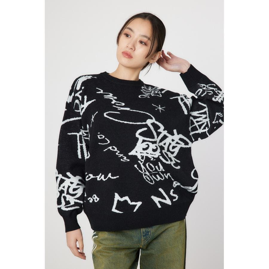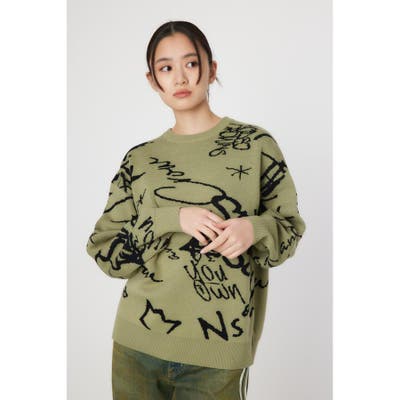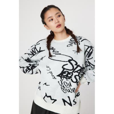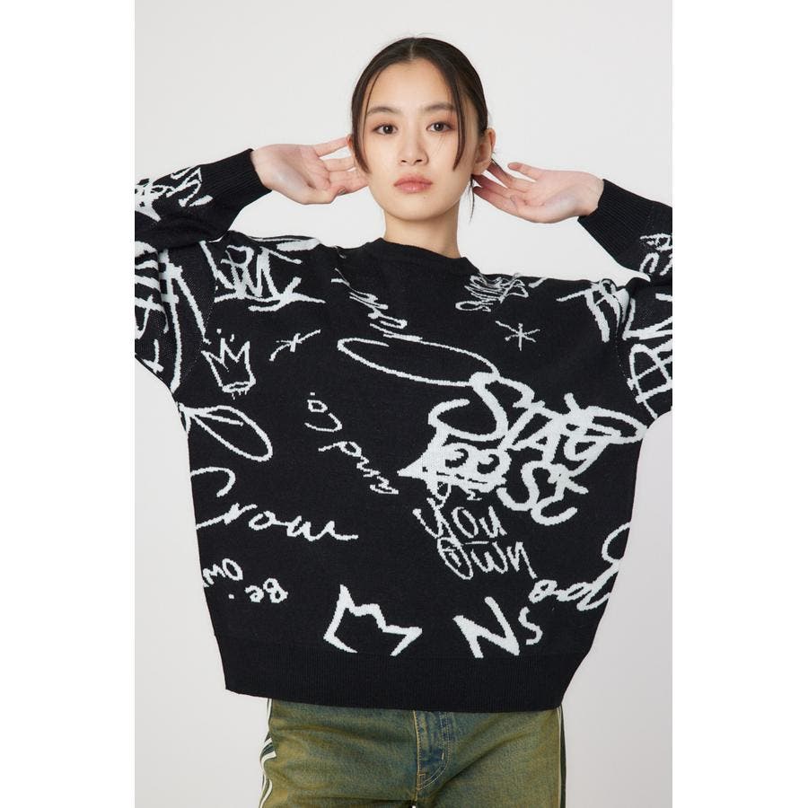 流行りのグラフィティー風のフォントでロゴやメッセージをランダムに落とし込んだ総柄ニットトップス。スタンダードなカラーで柄を落とし込んでいるので、見た目以上にコーディネートに溶け込む一枚。ニットらしいジャガード表現で、ストレスなく着用できます。ボーイズライクにバギーやワイドデニムと合わせたり、ガーリーなコーディネートの外しアイテムとしてもおすすめ。