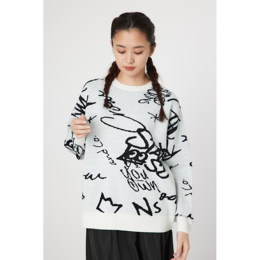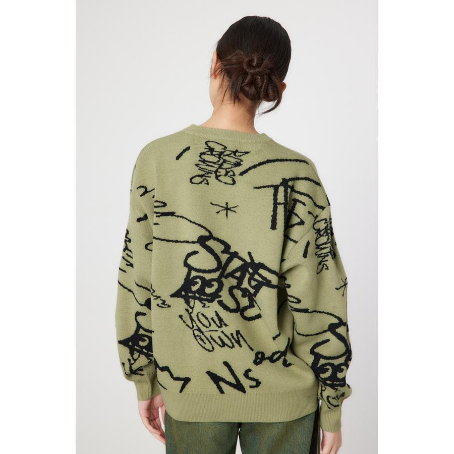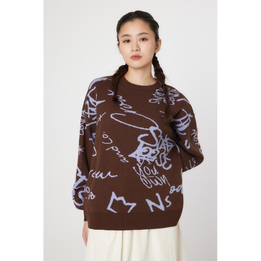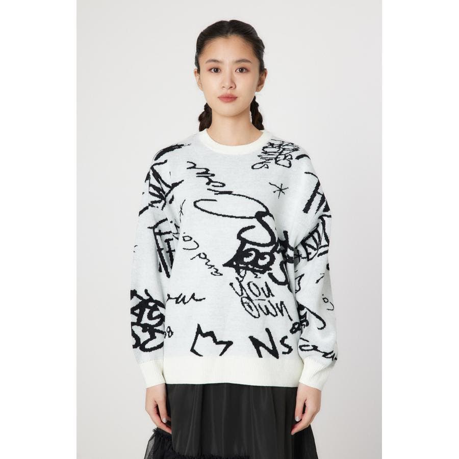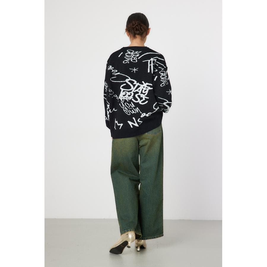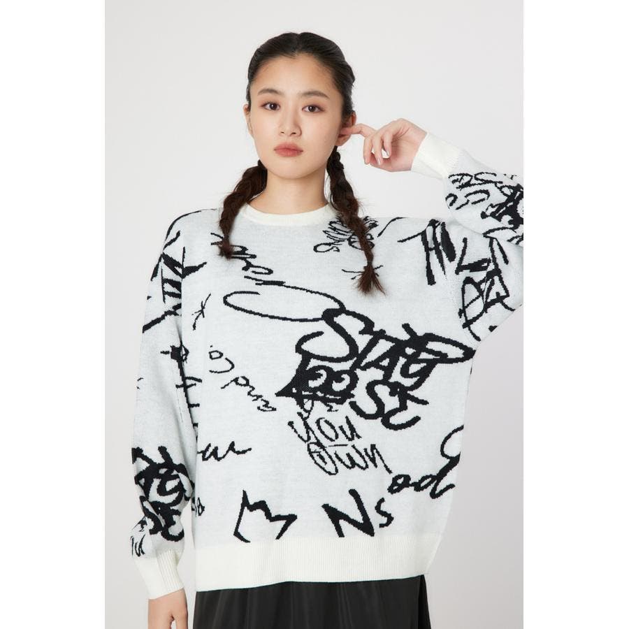 流行りのグラフィティー風のフォントでロゴやメッセージをランダムに落とし込んだ総柄ニットトップス。スタンダードなカラーで柄を落とし込んでいるので、見た目以上にコーディネートに溶け込む一枚。ニットらしいジャガード表現で、ストレスなく着用できます。ボーイズライクにバギーやワイドデニムと合わせたり、ガーリーなコーディネートの外しアイテムとしてもおすすめ。