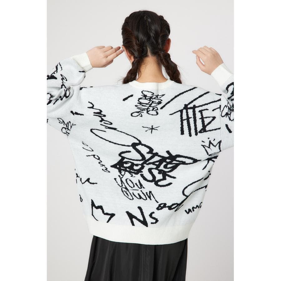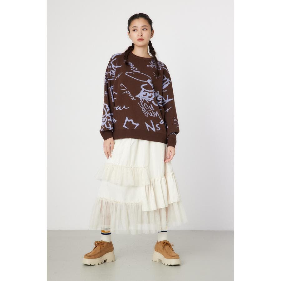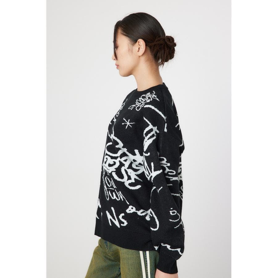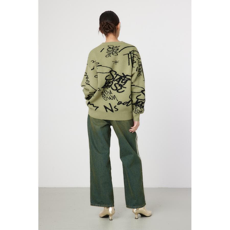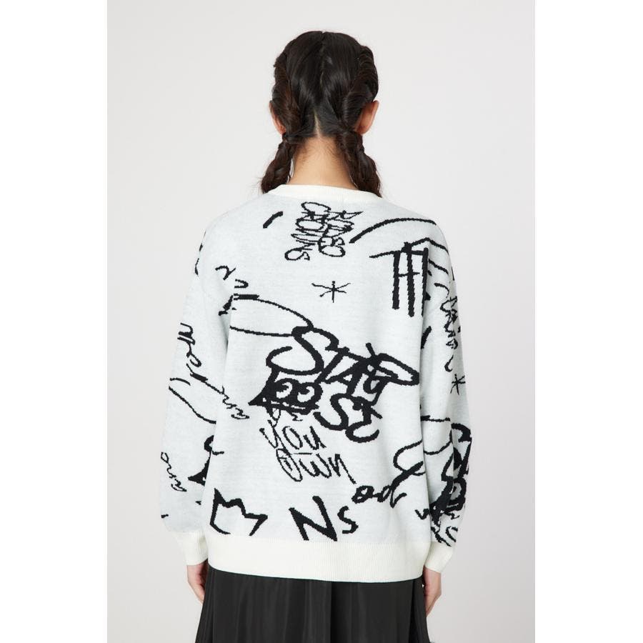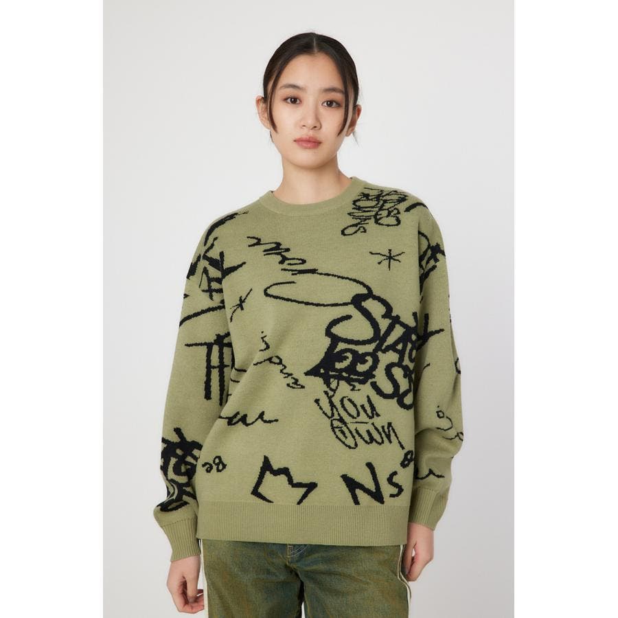 流行りのグラフィティー風のフォントでロゴやメッセージをランダムに落とし込んだ総柄ニットトップス。スタンダードなカラーで柄を落とし込んでいるので、見た目以上にコーディネートに溶け込む一枚。ニットらしいジャガード表現で、ストレスなく着用できます。ボーイズライクにバギーやワイドデニムと合わせたり、ガーリーなコーディネートの外しアイテムとしてもおすすめ。