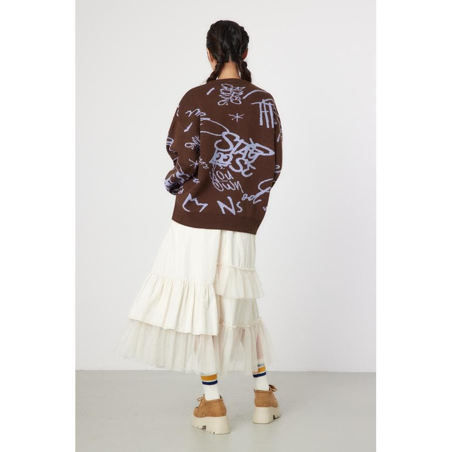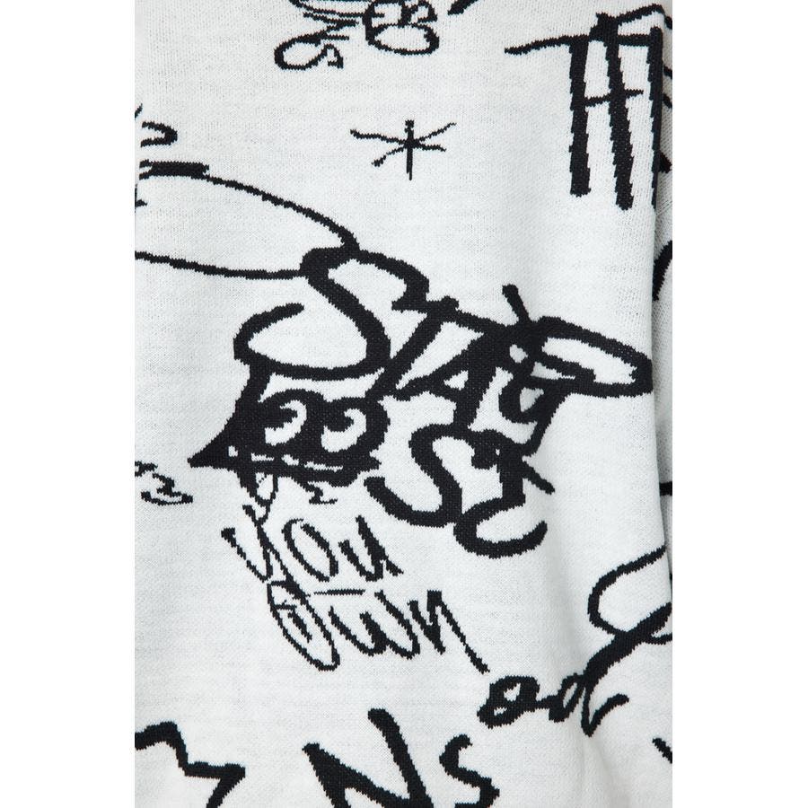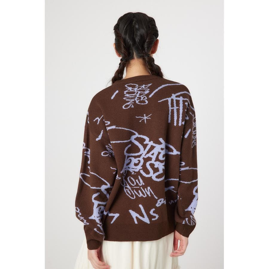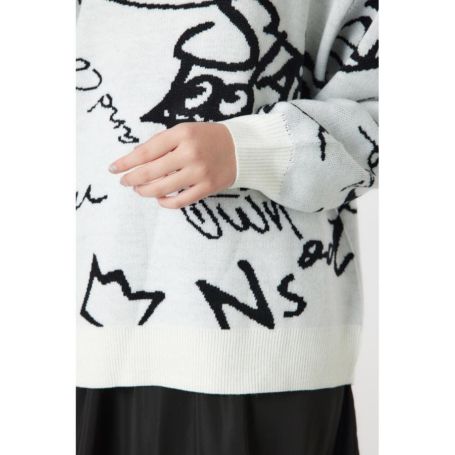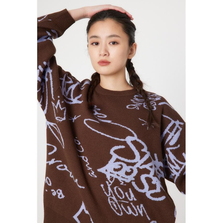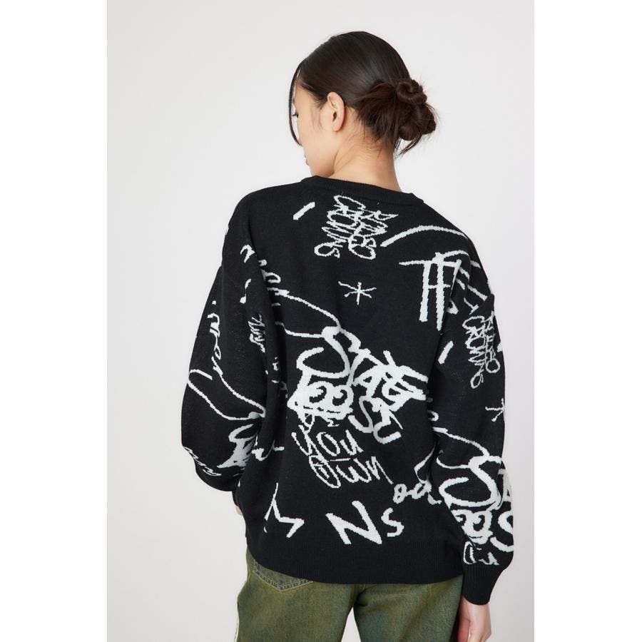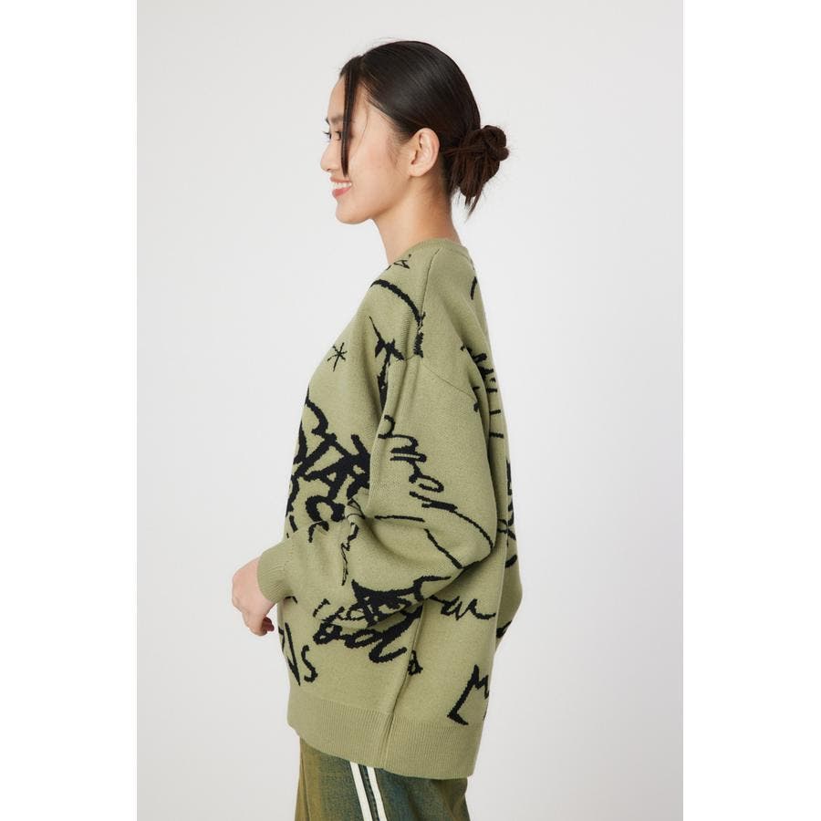流行りのグラフィティー風のフォントでロゴやメッセージをランダムに落とし込んだ総柄ニットトップス。スタンダードなカラーで柄を落とし込んでいるので、見た目以上にコーディネートに溶け込む一枚。ニットらしいジャガード表現で、ストレスなく着用できます。ボーイズライクにバギーやワイドデニムと合わせたり、ガーリーなコーディネートの外しアイテムとしてもおすすめ。