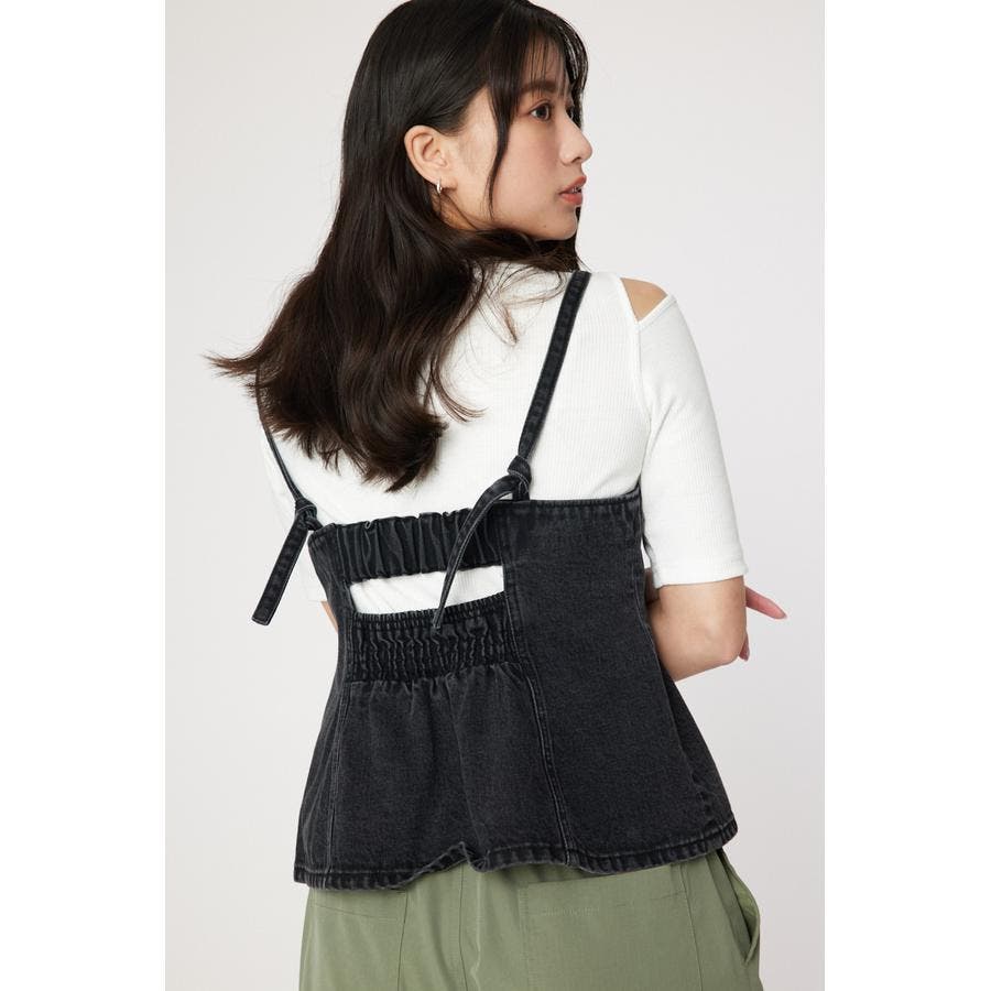 カーブデニム(420HSR11-006B)と同素材を使用したデニムキャミソール。シャツやカットソーなどのトップスの上にレイヤードするだけで一気にトレンド感を演出。ウエストの切り替えがスタイルアップしてくれるアイテムです。カーブデニムとのバランスもばっちり考えられたシルエットになっているので、セットアップで着用するのがおすすめ。