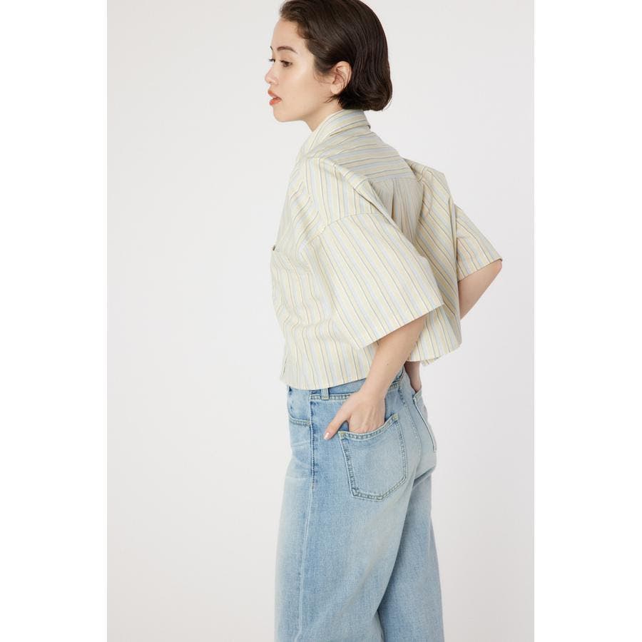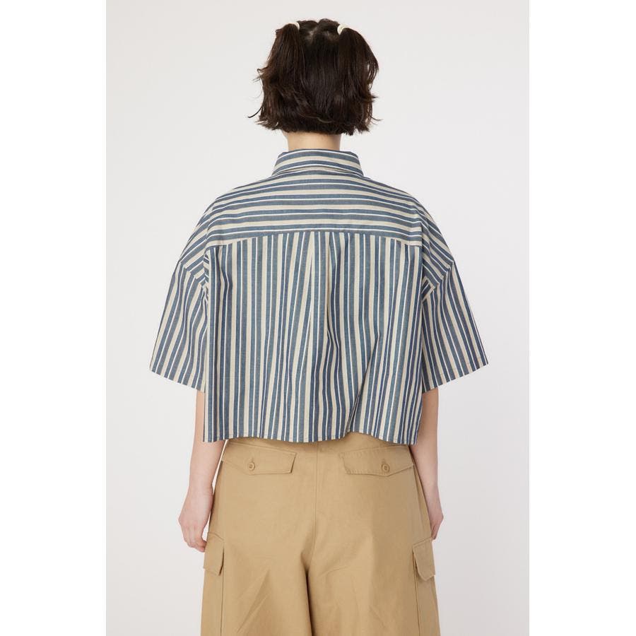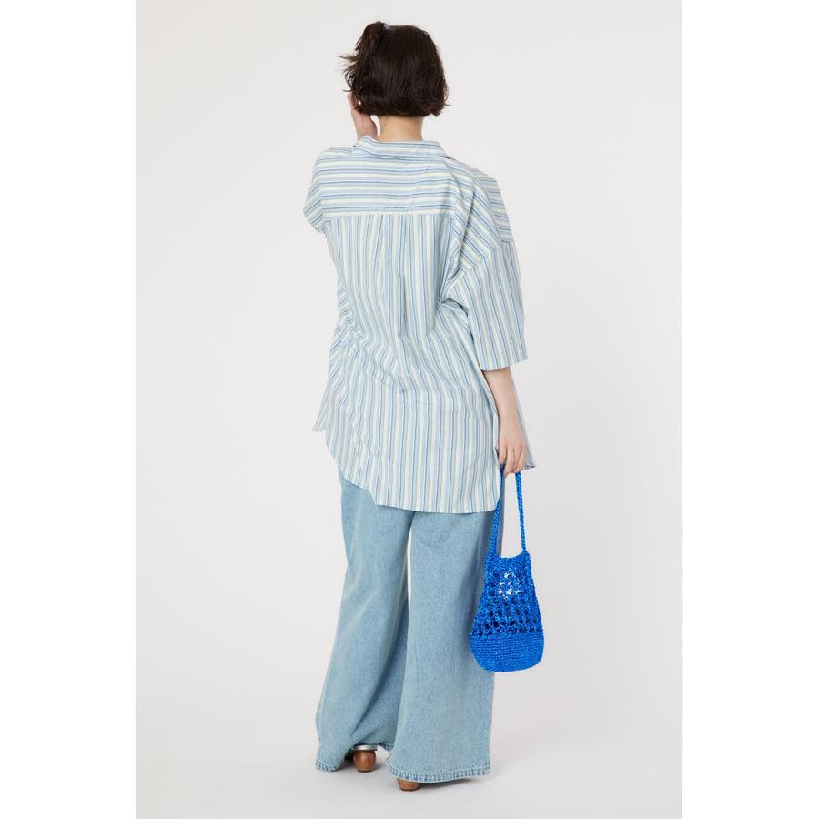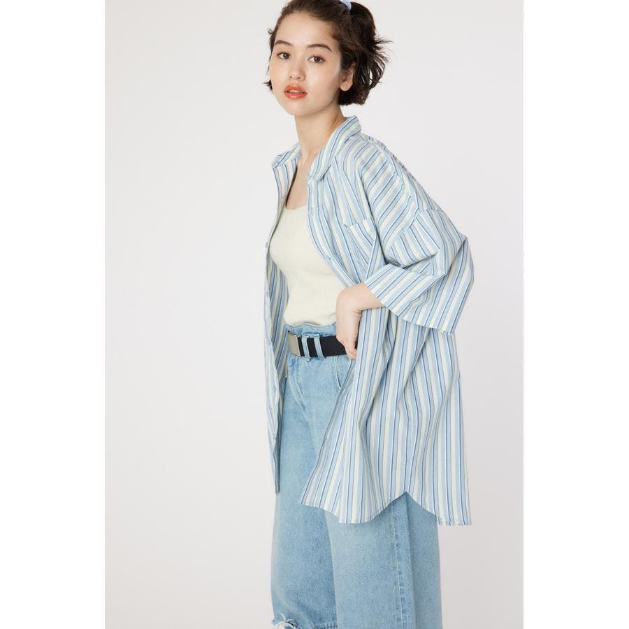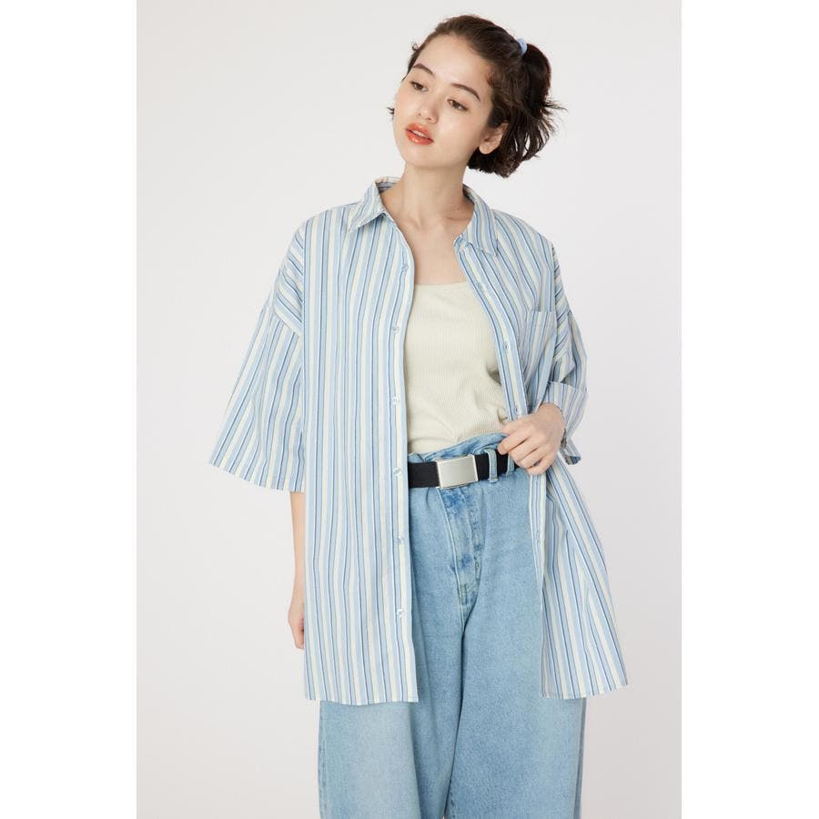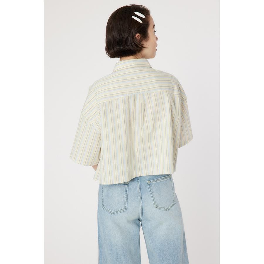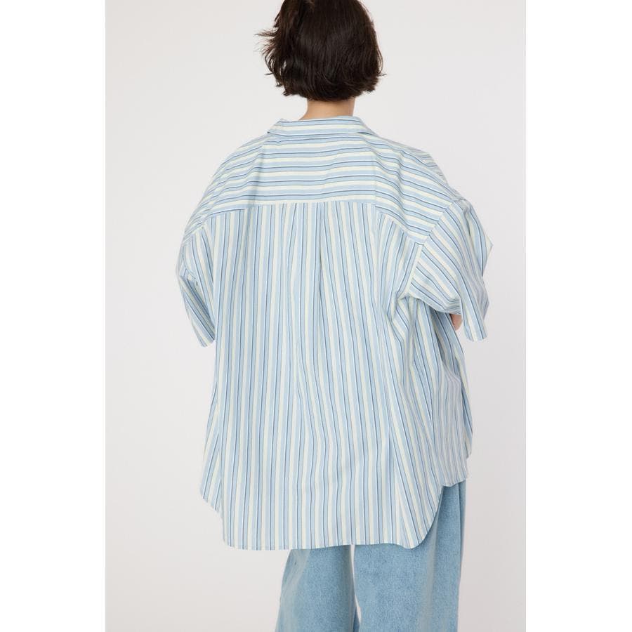 Sサイズはショート丈、Mサイズはロング丈のマルチストライプシャツ。SとMで着丈が大きく異なるので、お好みのサイズ感を見つけてほしいアイテムです。