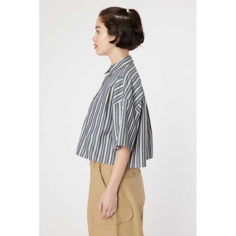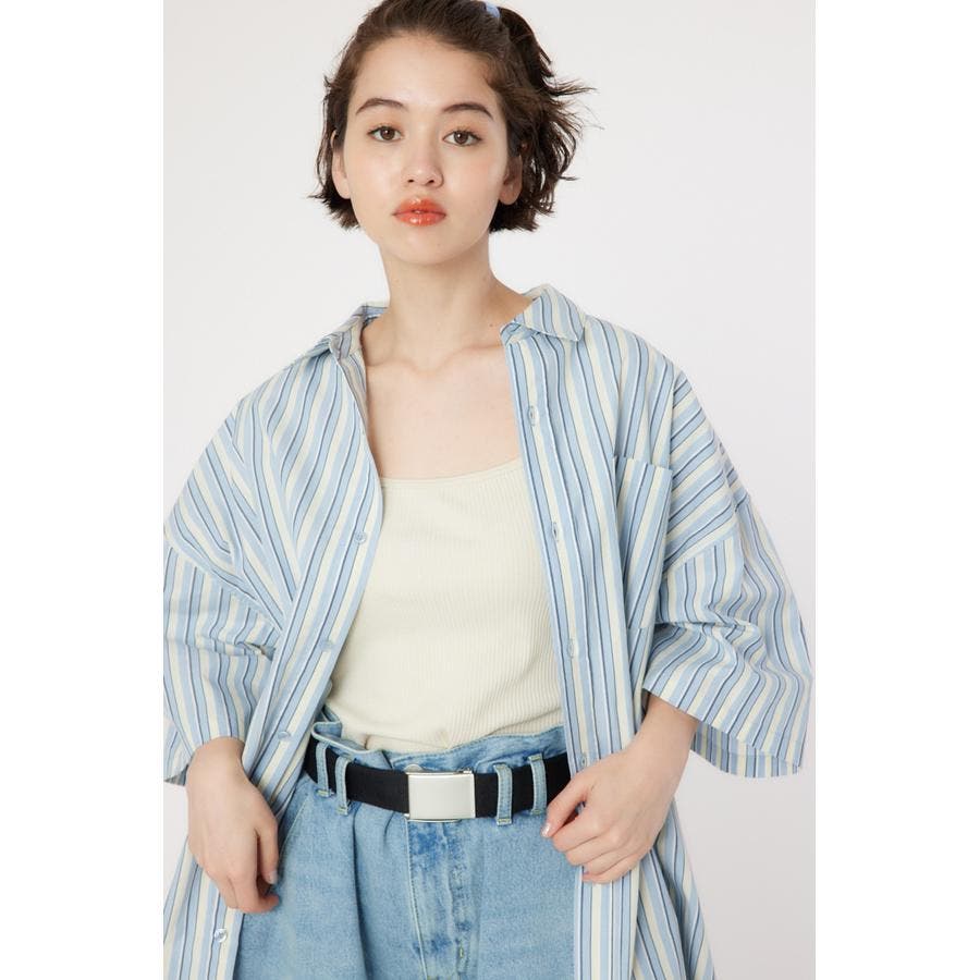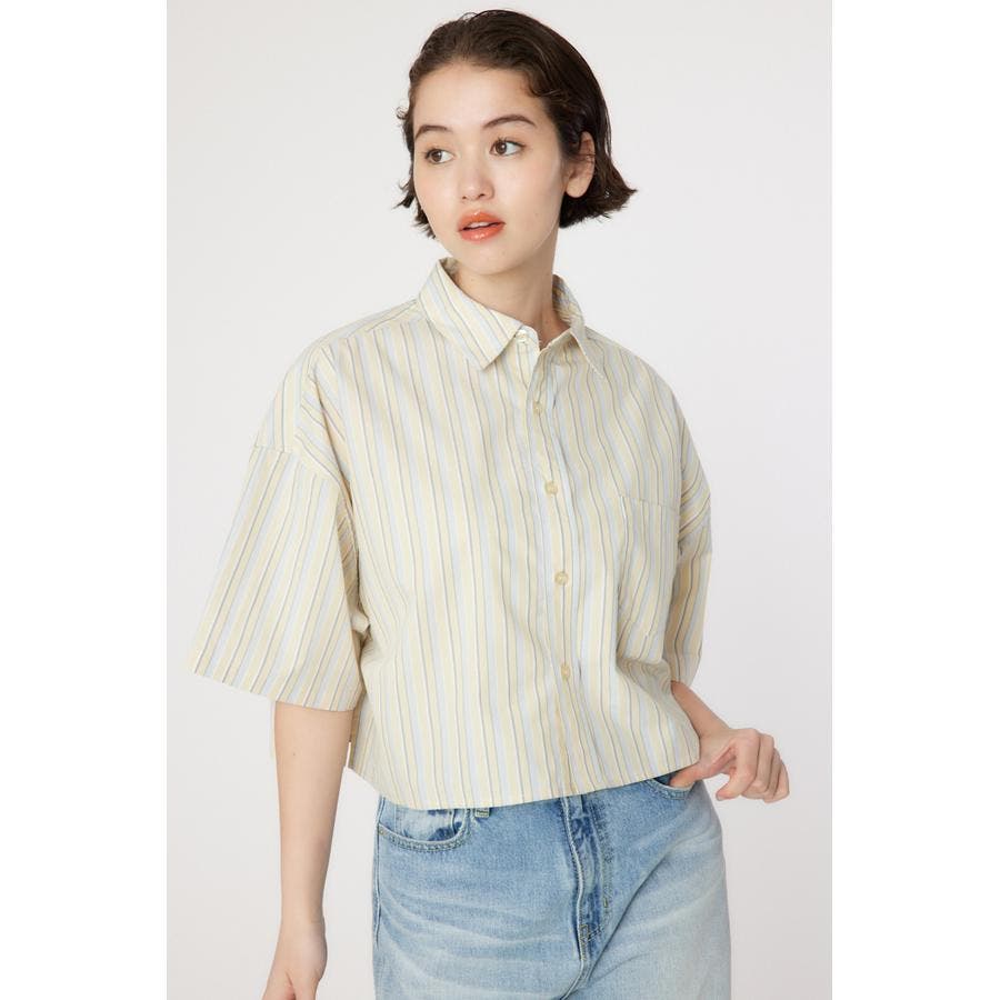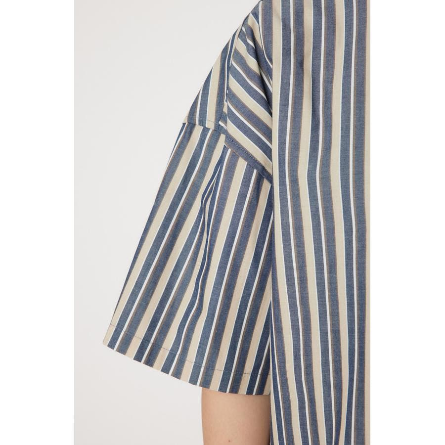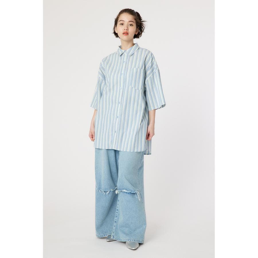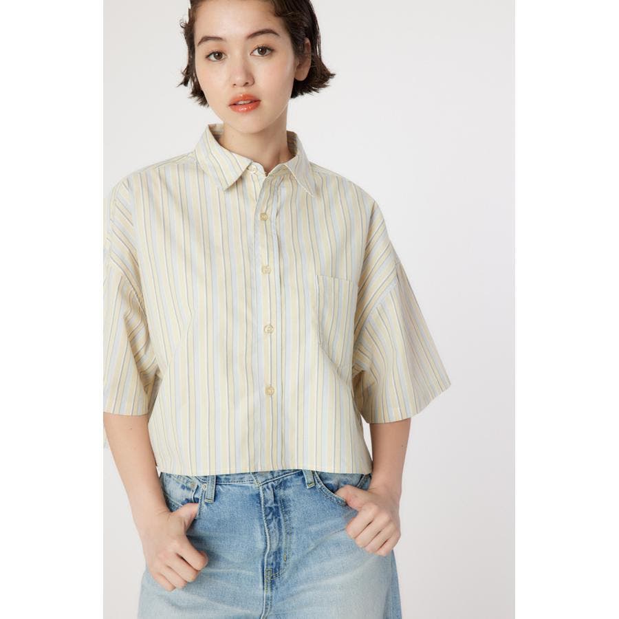 Sサイズはショート丈、Mサイズはロング丈のマルチストライプシャツ。SとMで着丈が大きく異なるので、お好みのサイズ感を見つけてほしいアイテムです。