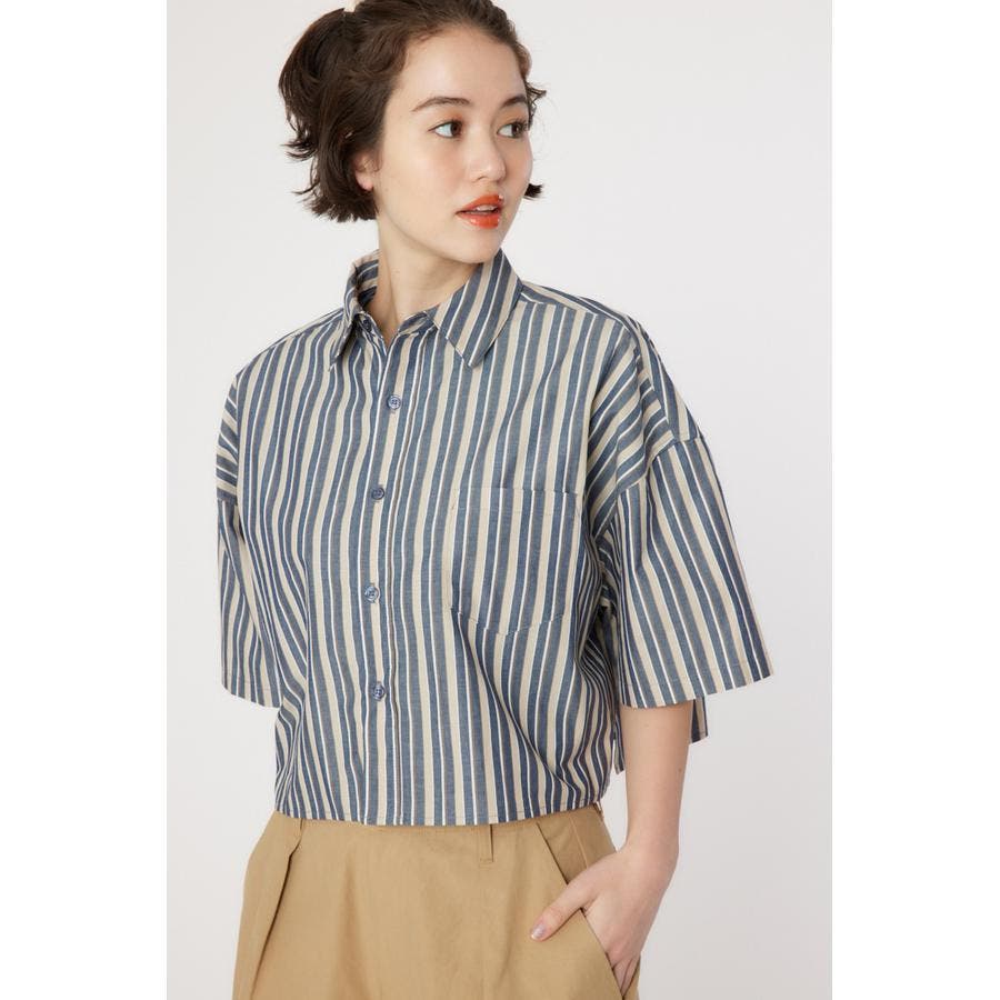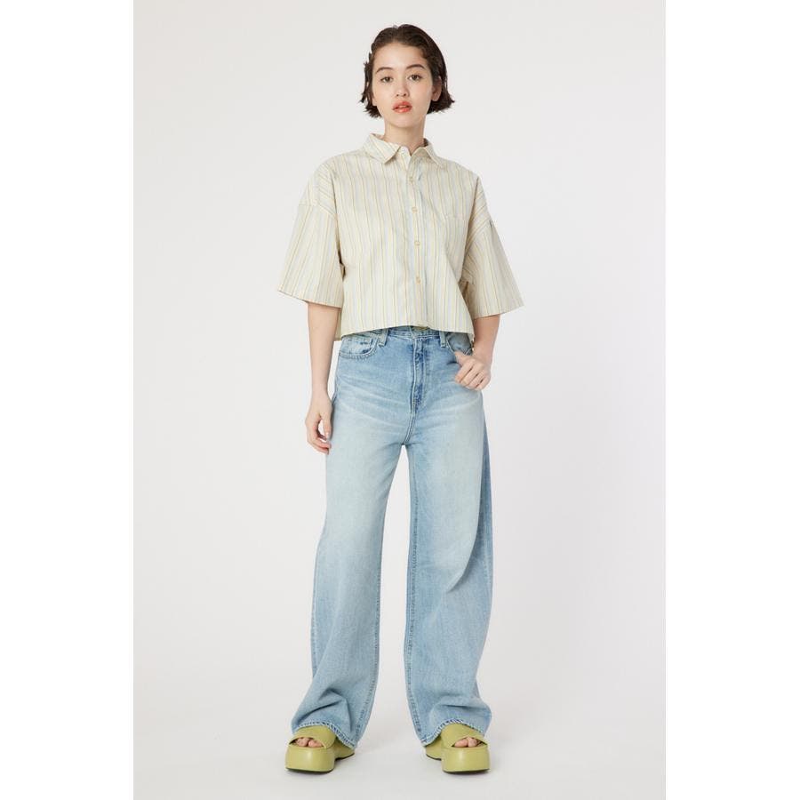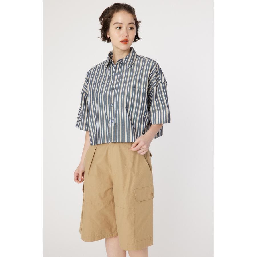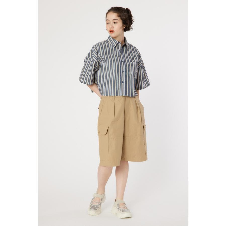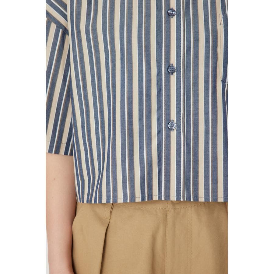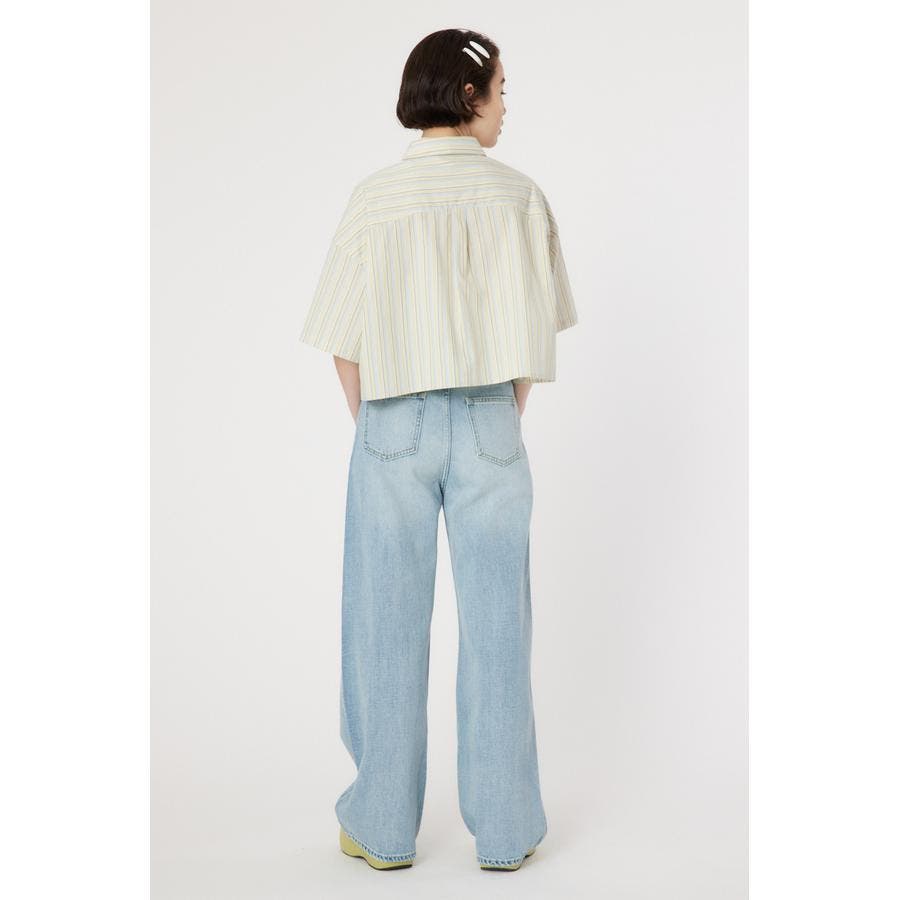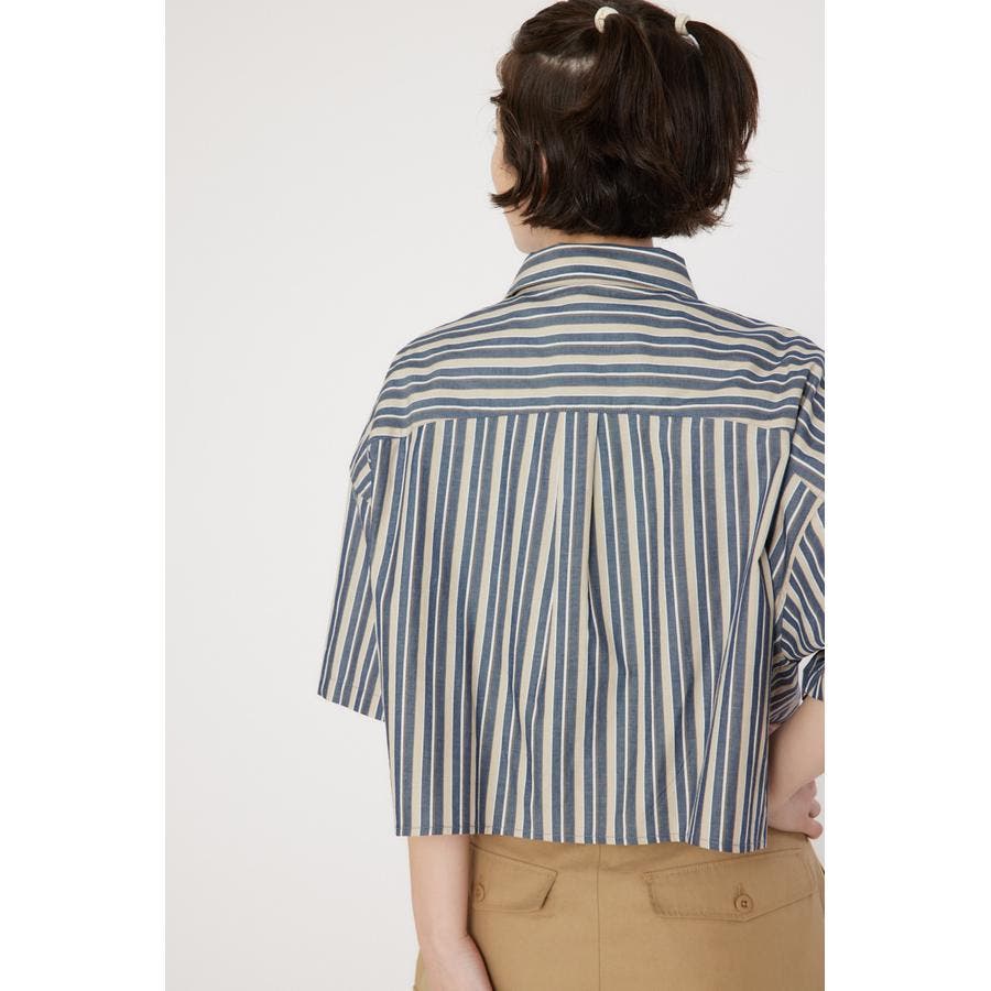 Sサイズはショート丈、Mサイズはロング丈のマルチストライプシャツ。SとMで着丈が大きく異なるので、お好みのサイズ感を見つけてほしいアイテムです。
